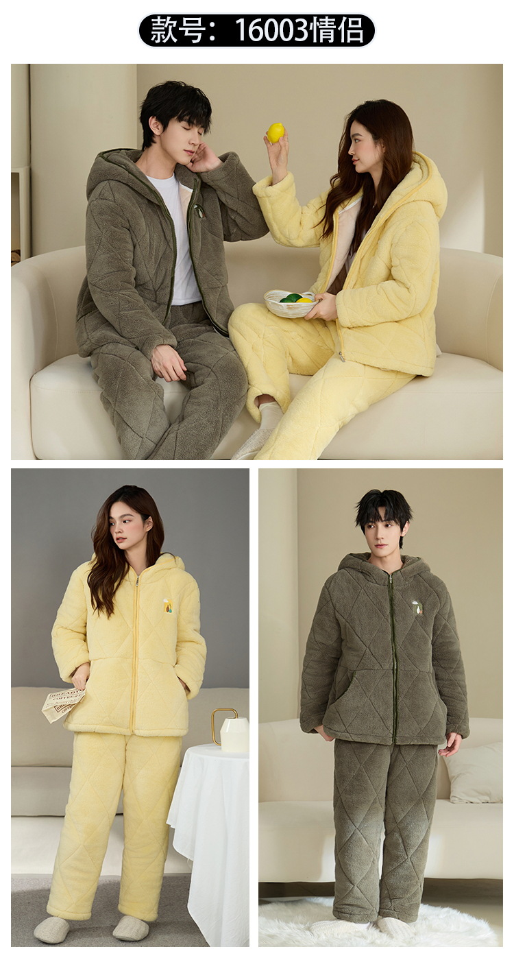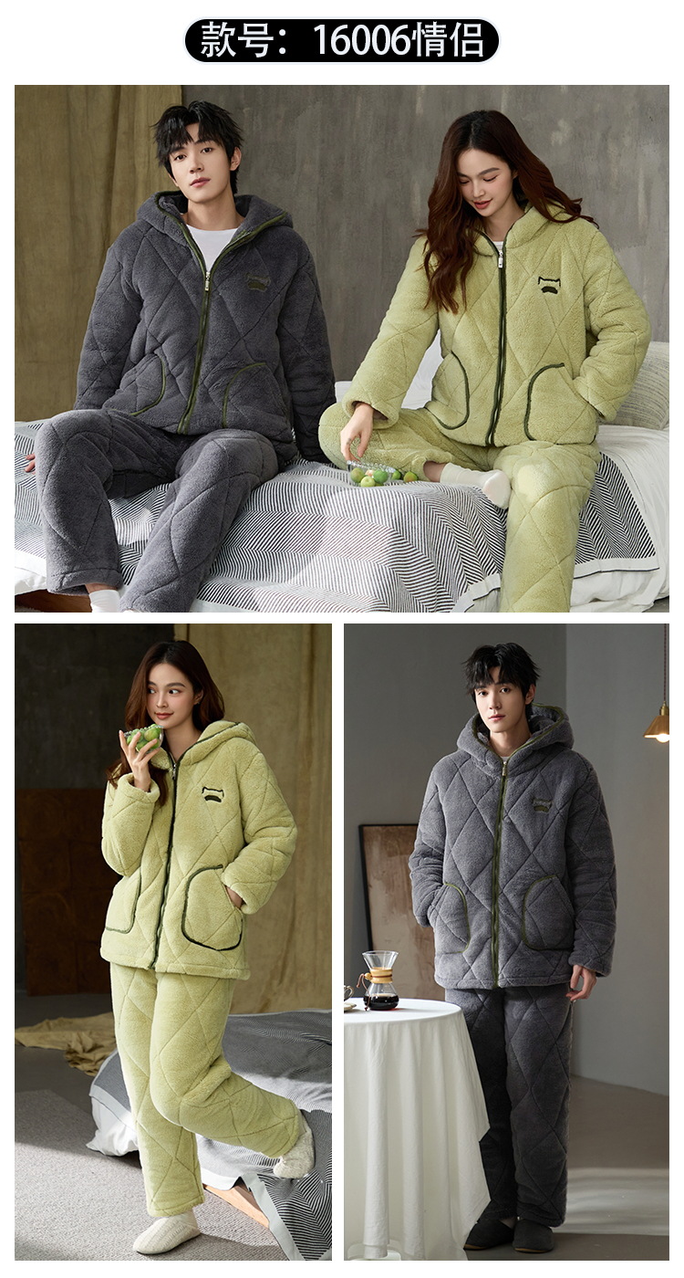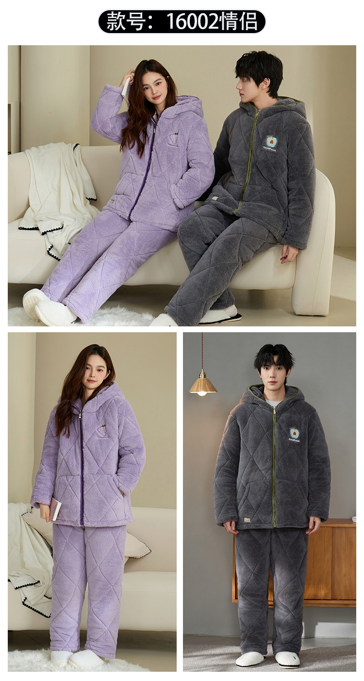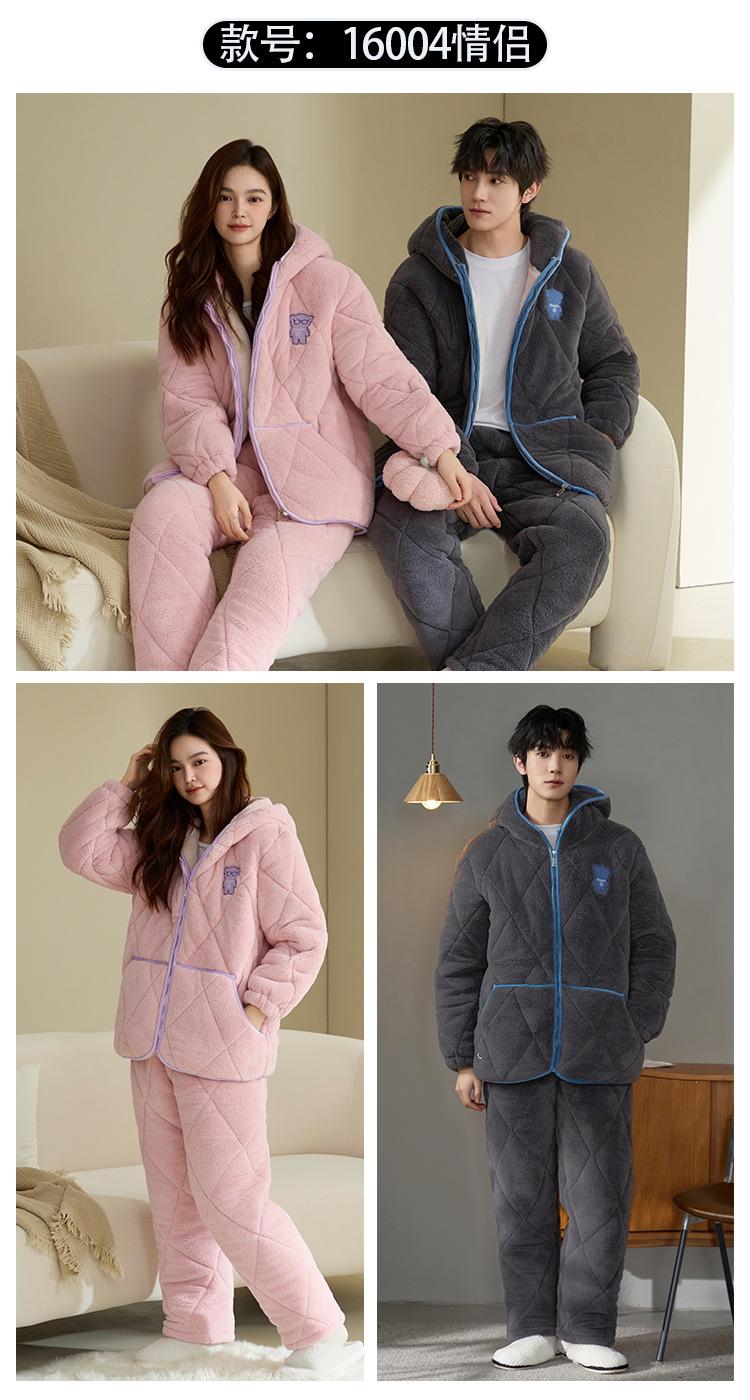 Coral de lana más lana gruesa chaqueta de algodón de tres capas super gruesa pareja de pijamas de mujer otoño invierno ropa de hogar encapuchada hombre 2024