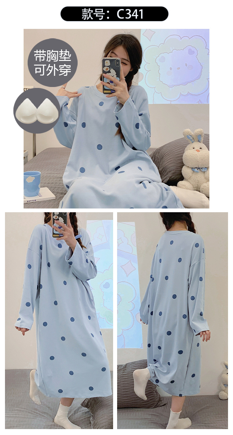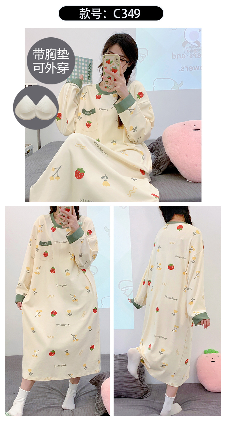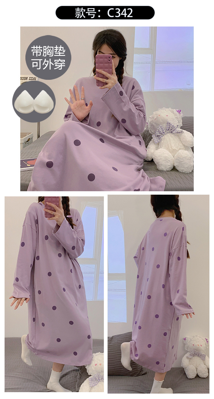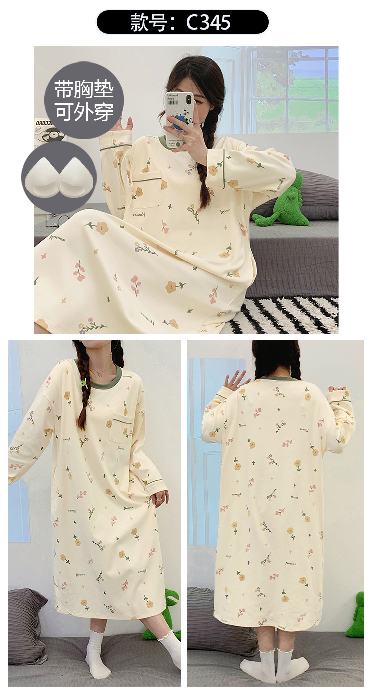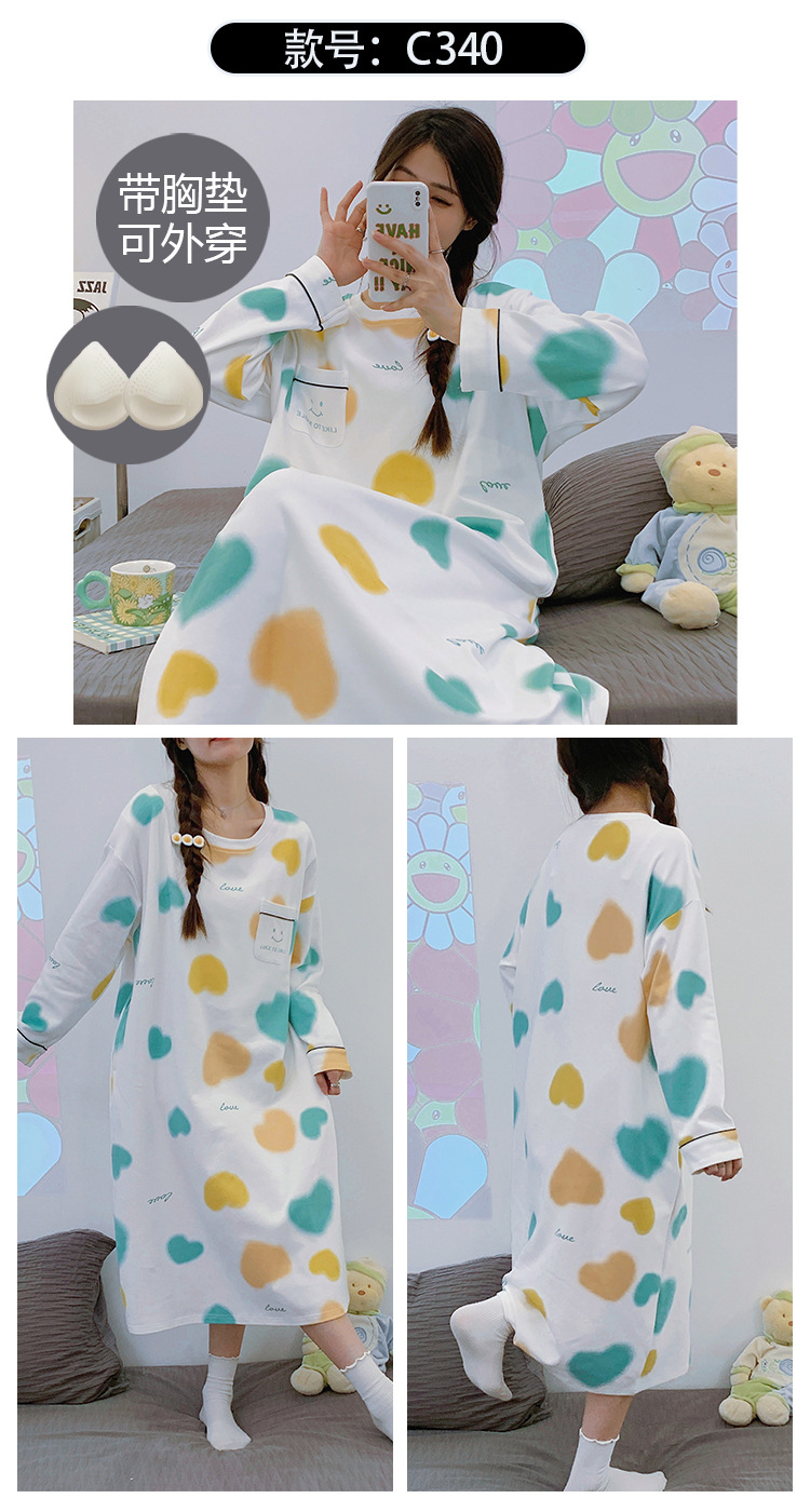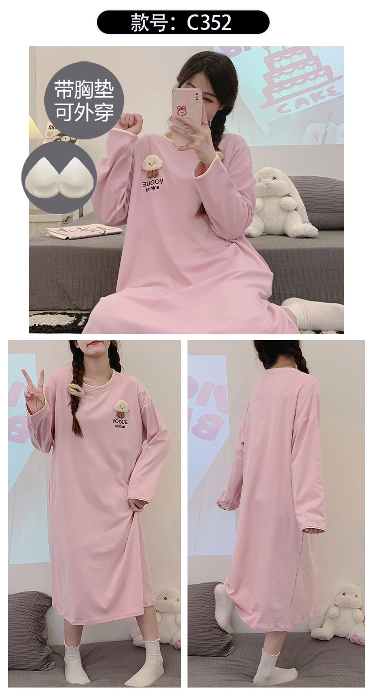 Camisón de las mujeres con almohadilla en el pecho otoño algodón de manga larga vestido dulce nuevo vestido casual de algodón desgaste del hogar de verano