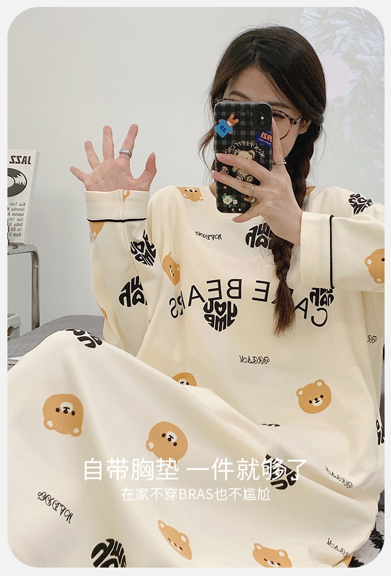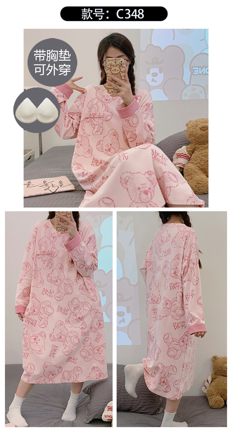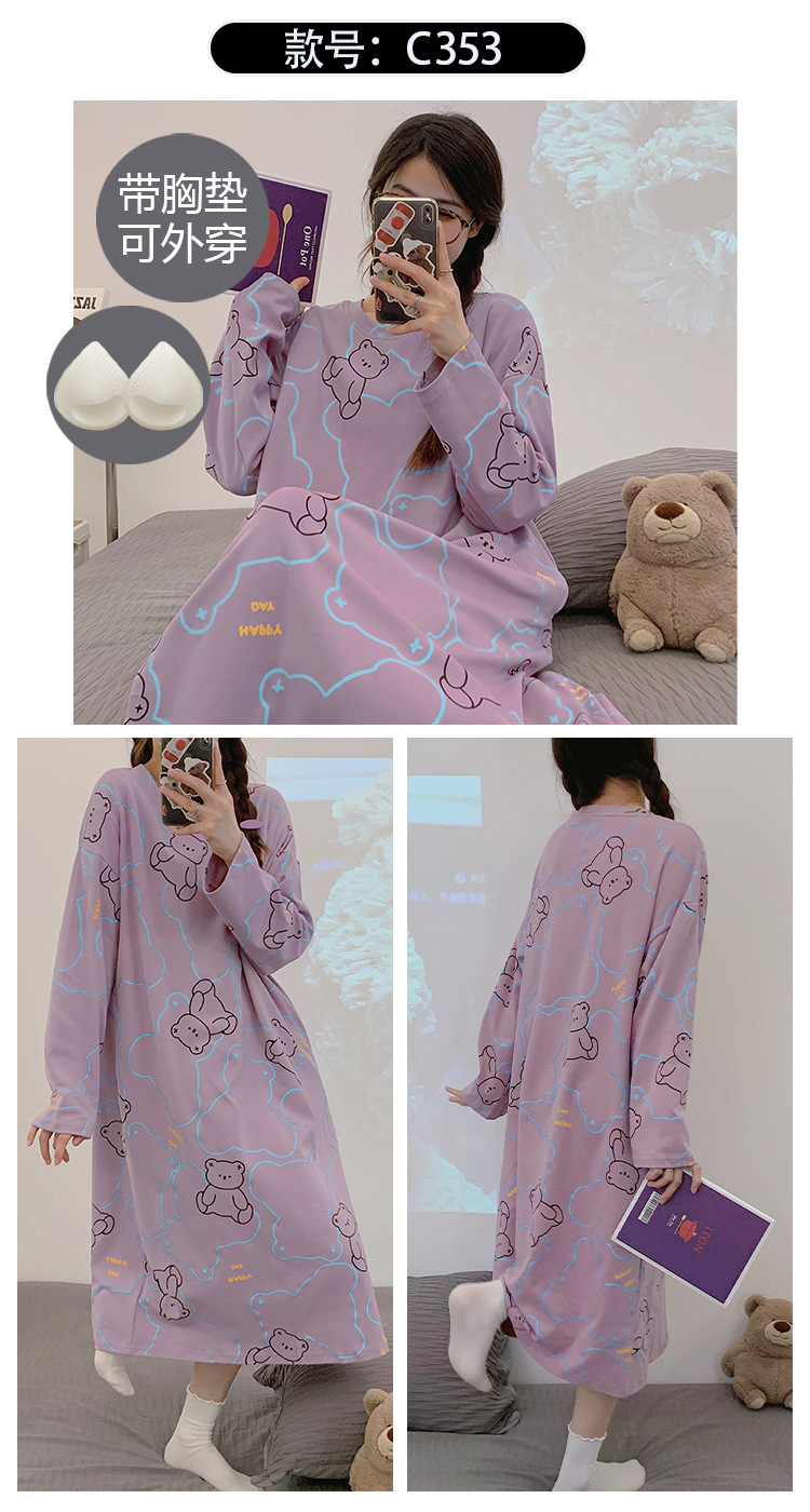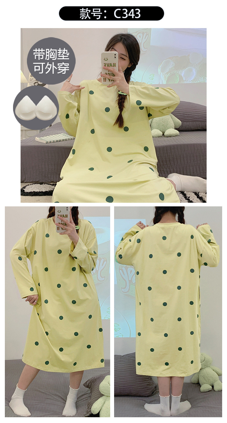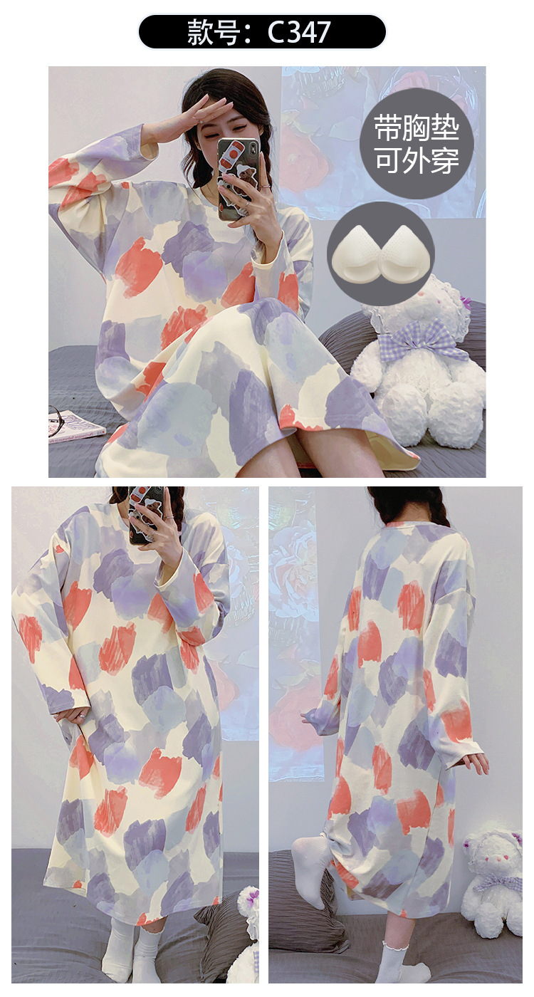 Camisón de las mujeres con almohadilla en el pecho otoño algodón de manga larga vestido dulce nuevo vestido casual de algodón desgaste del hogar de verano