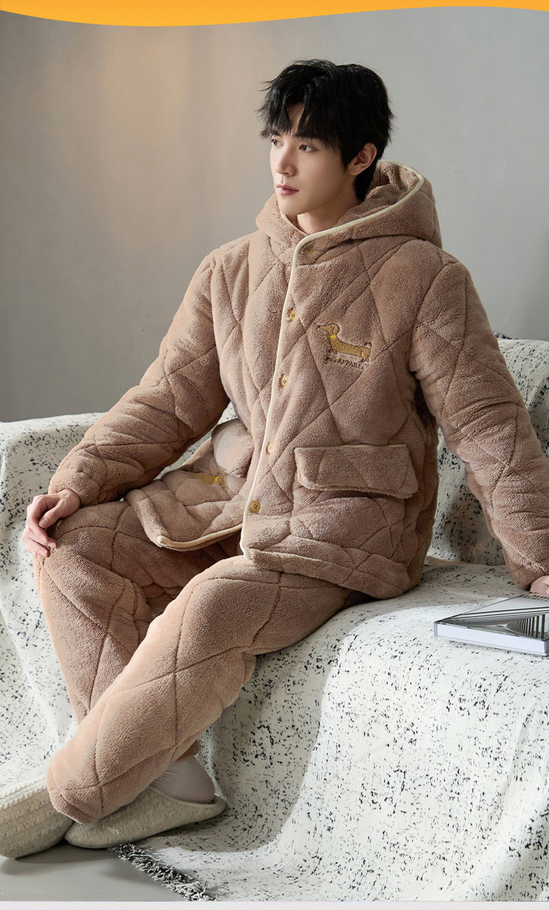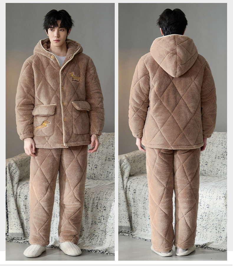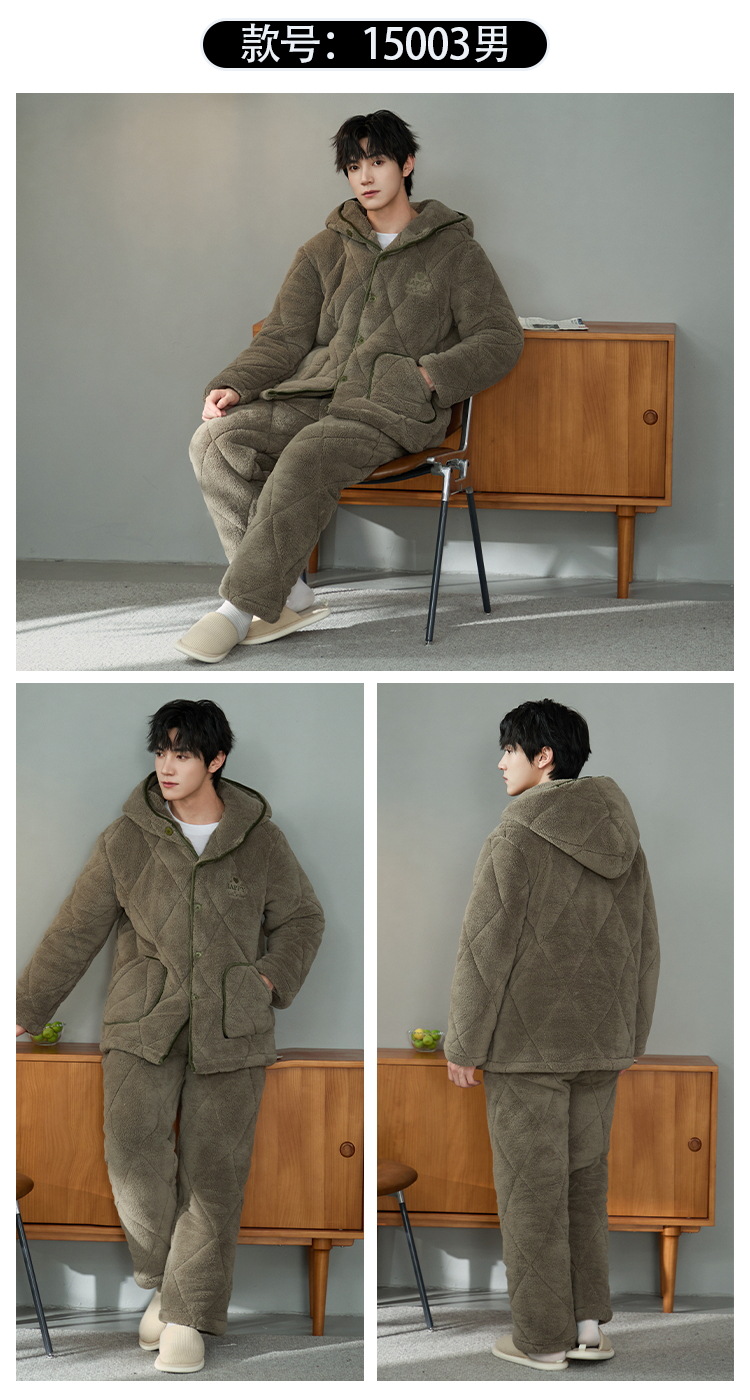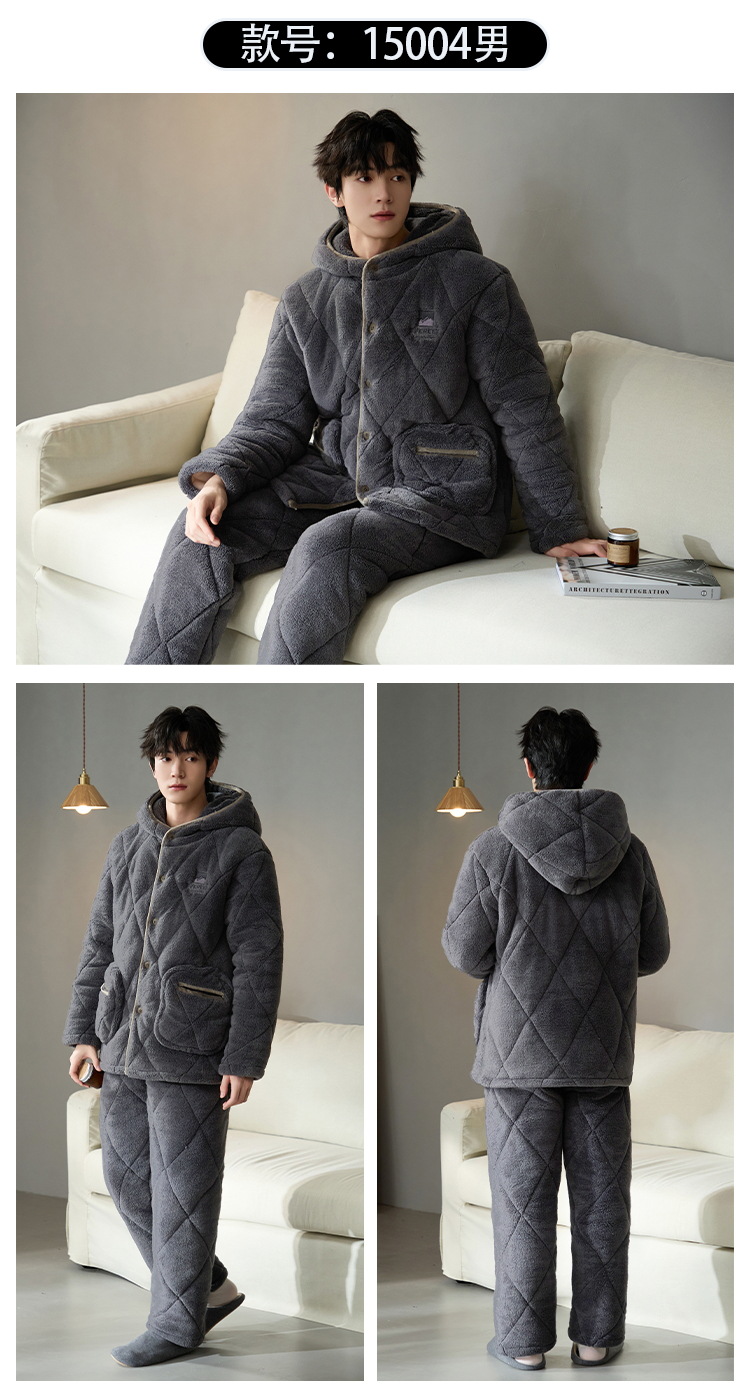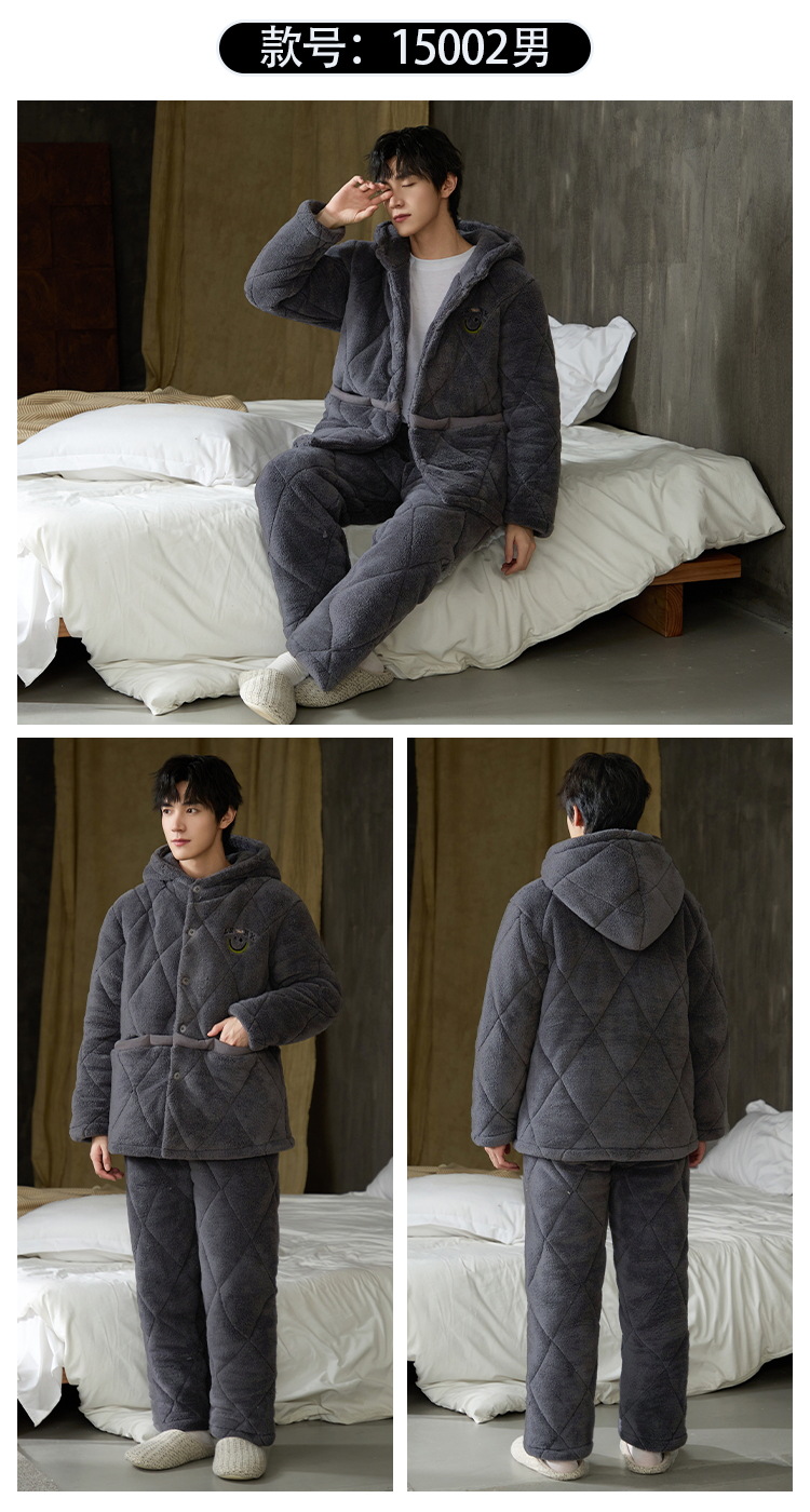 Pijama de hombre para hombre 2024 invierno encapuchado tres capas de algodón intercalado de mangas largas con camisa gruesa se puede usar en el exterior conjunto de ropa de casa