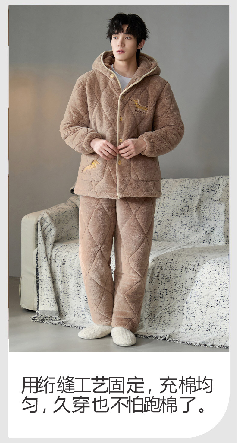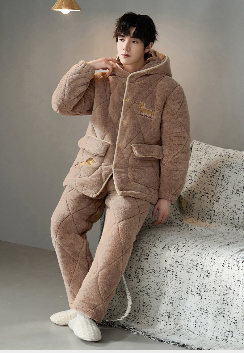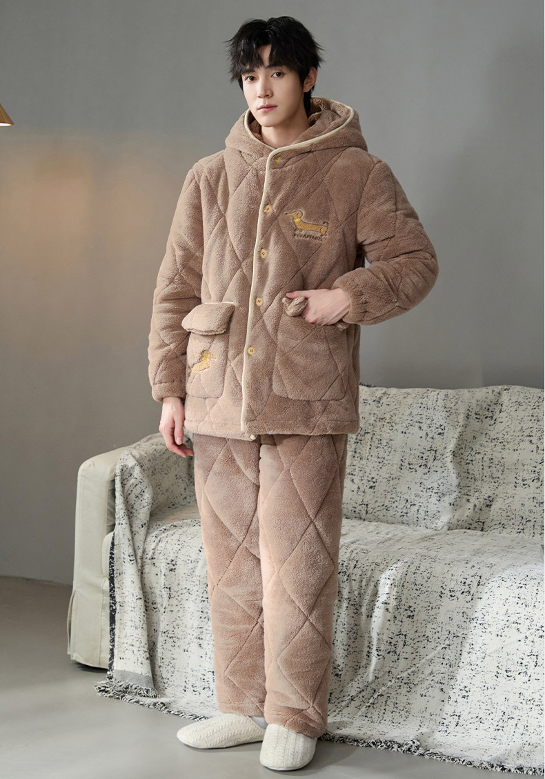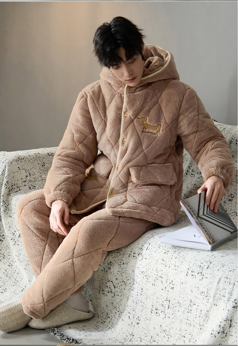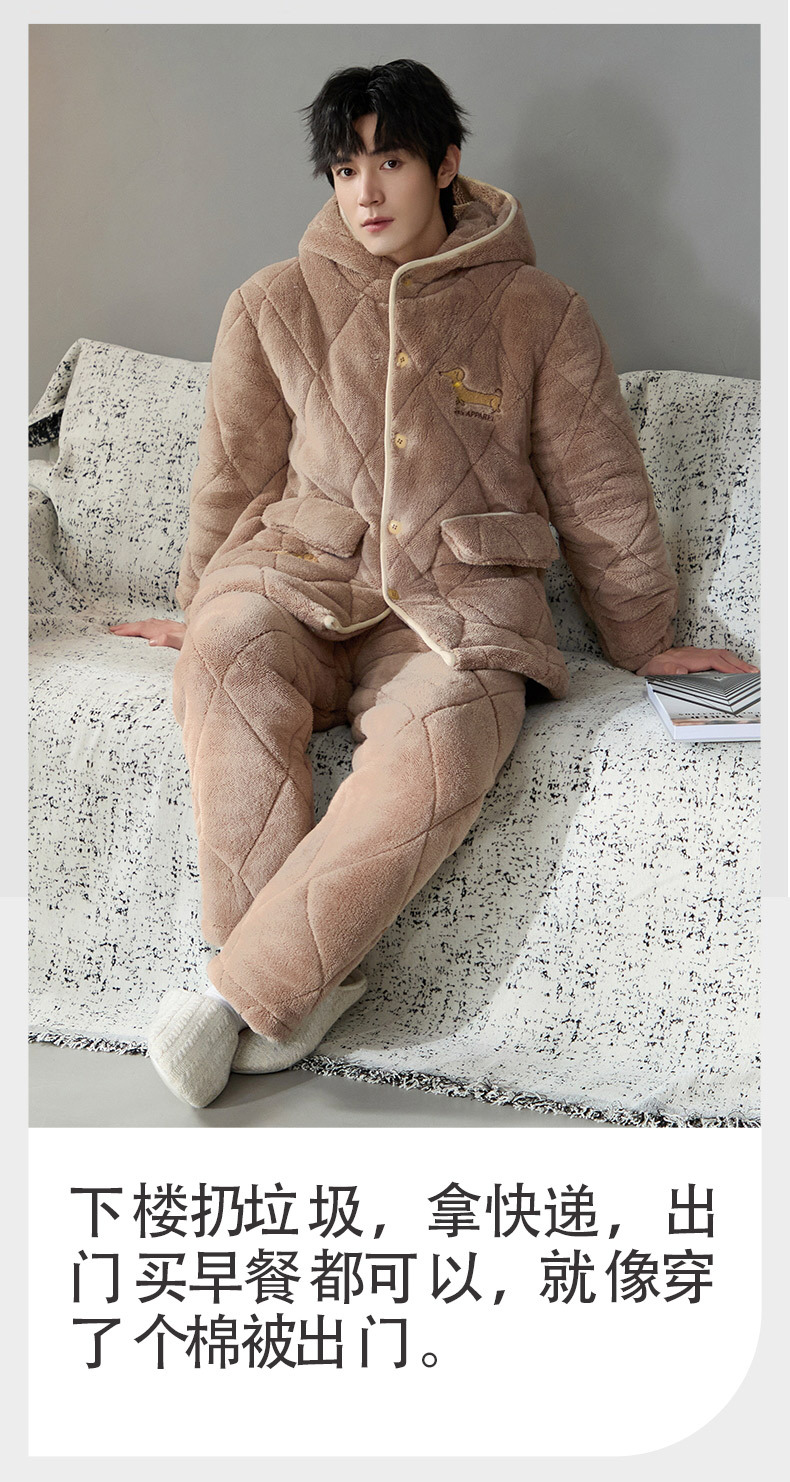 Pijama de hombre para hombre 2024 invierno encapuchado tres capas de algodón intercalado de mangas largas con camisa gruesa se puede usar en el exterior conjunto de ropa de casa
