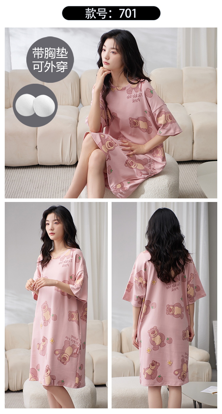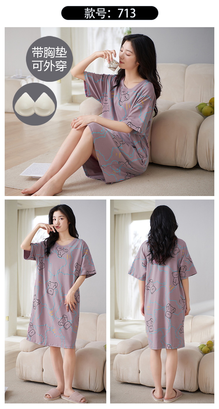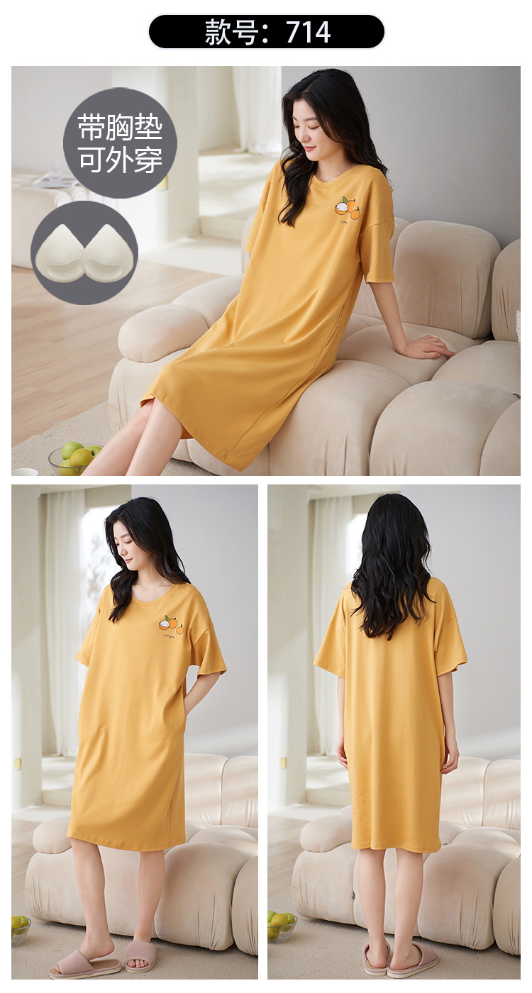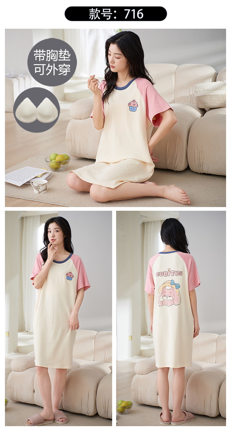 Camisón con almohadilla en el pecho pijamas de manga corta de algodón de verano para mujer dulce fresco cuello redondo ropa para el hogar vestido de verano