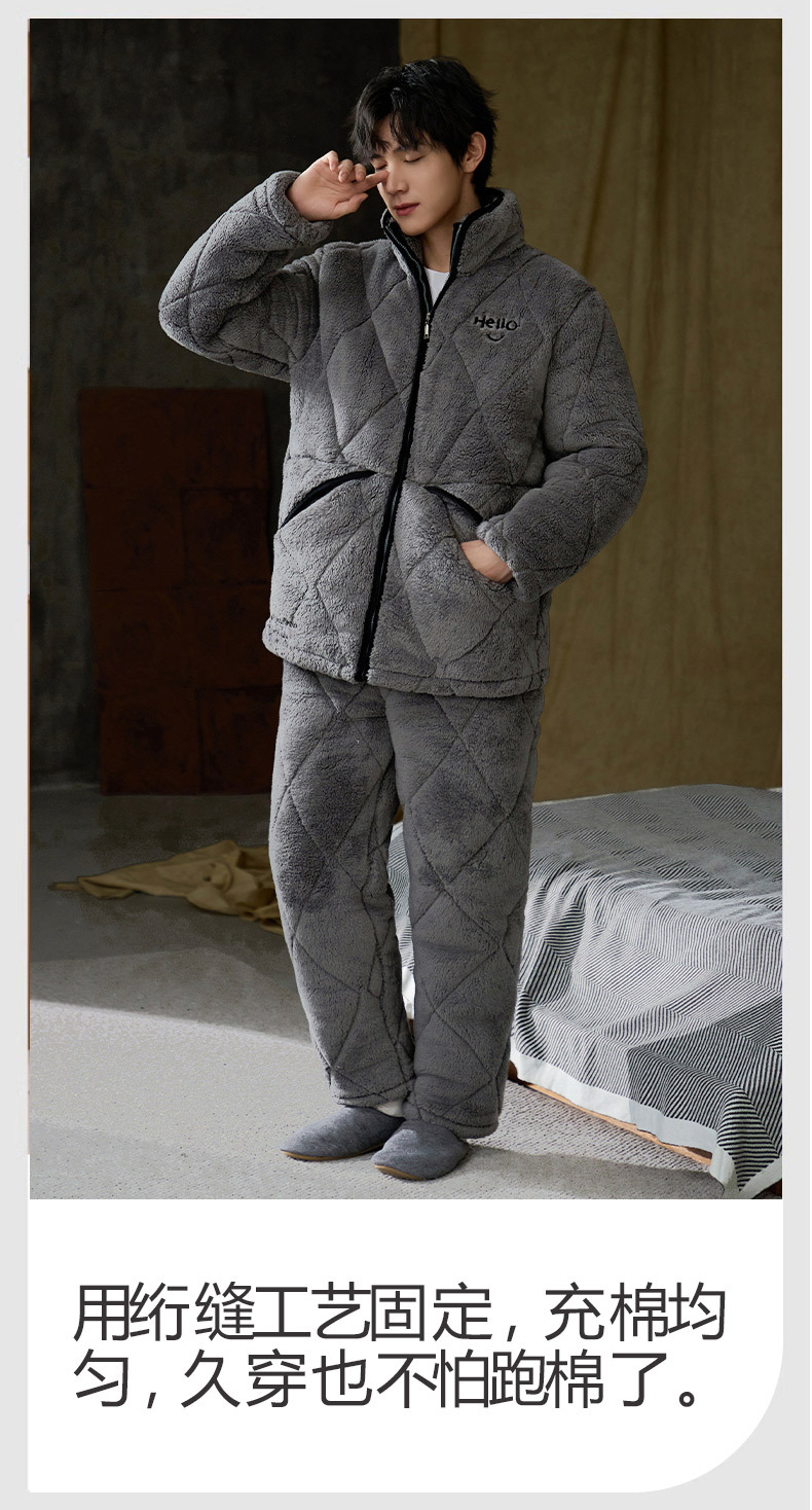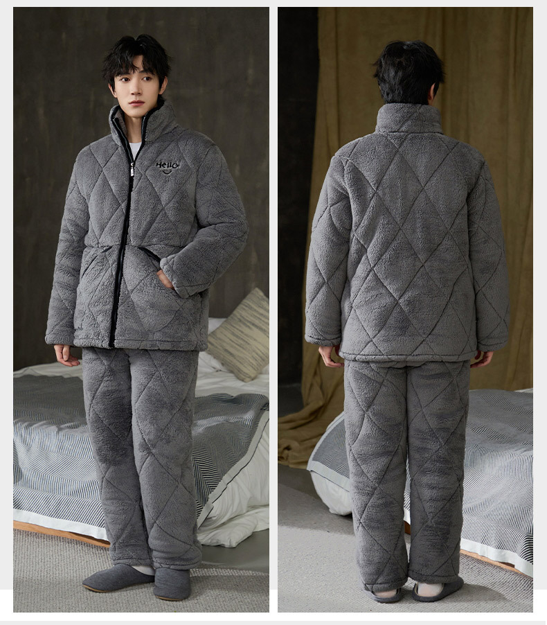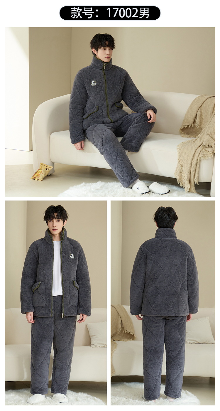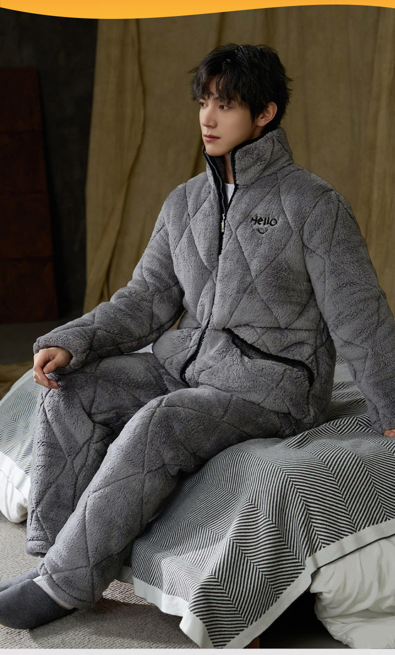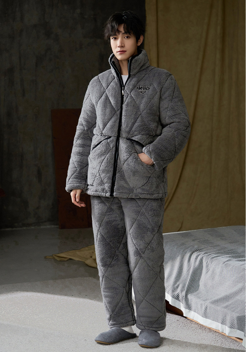 Pijamas de invierno caliente para hombres, tres capas de algodón intercalado, cuello vertical, manga larga, 2024 nuevo conjunto de ropa de hogar simple gris