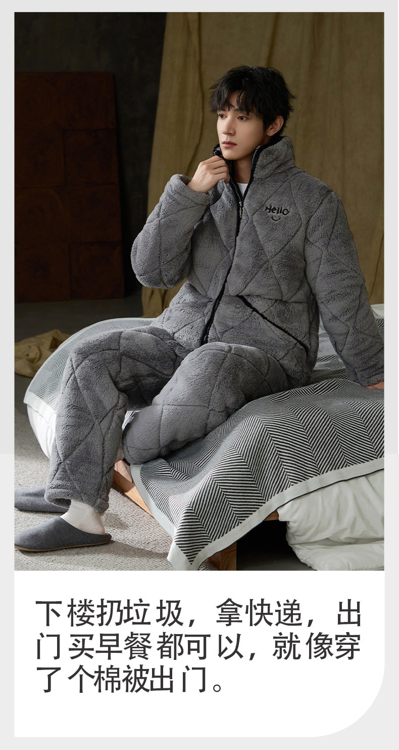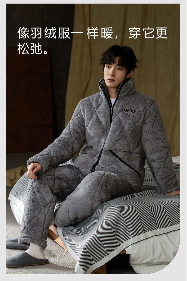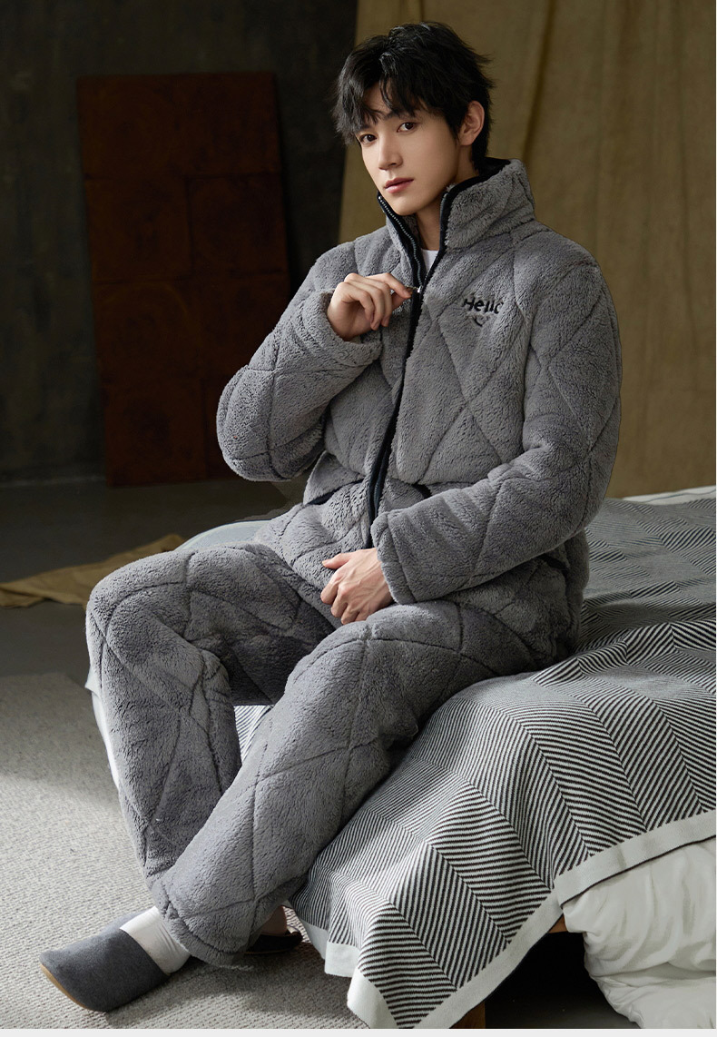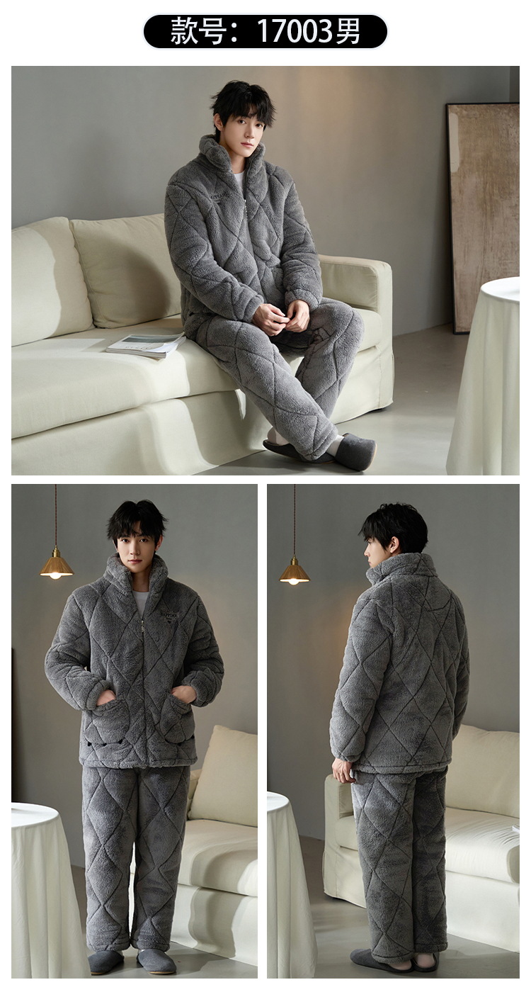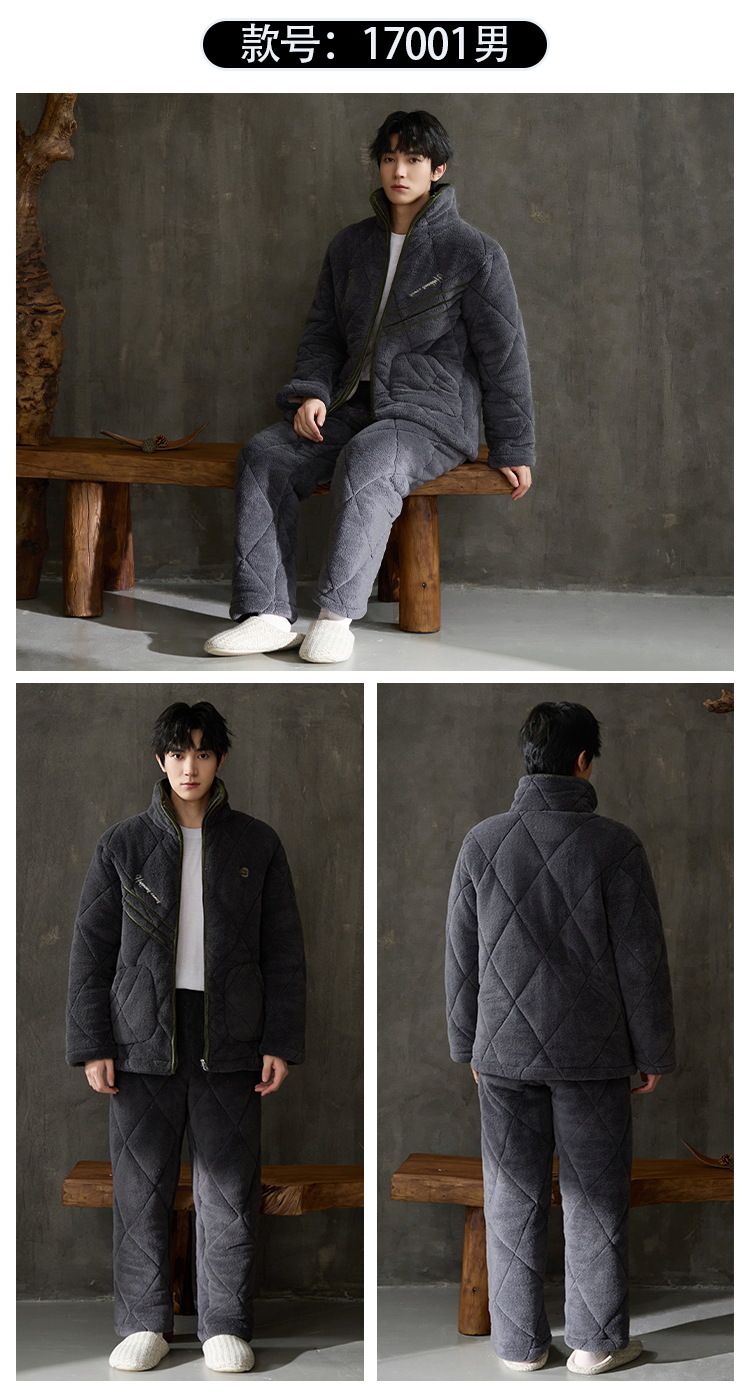 Pijamas de invierno caliente para hombres, tres capas de algodón intercalado, cuello vertical, manga larga, 2024 nuevo conjunto de ropa de hogar simple gris