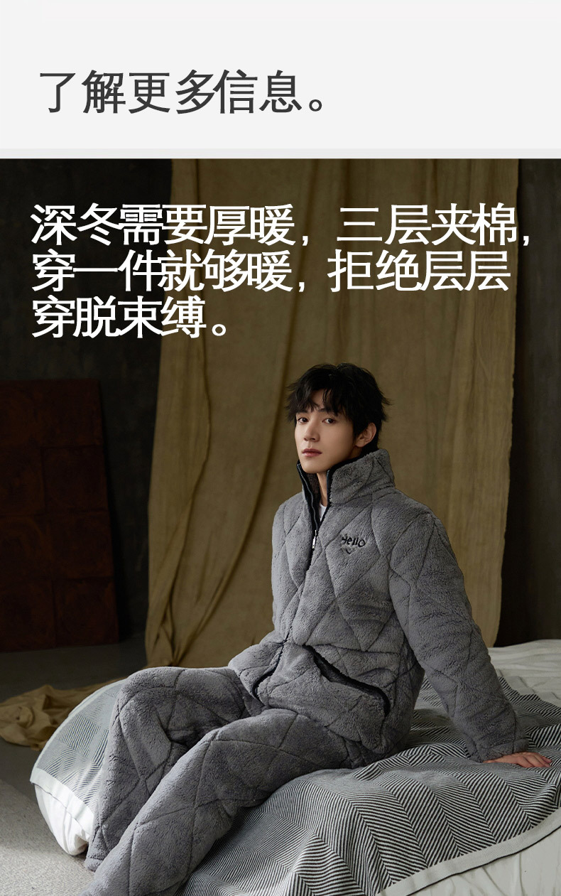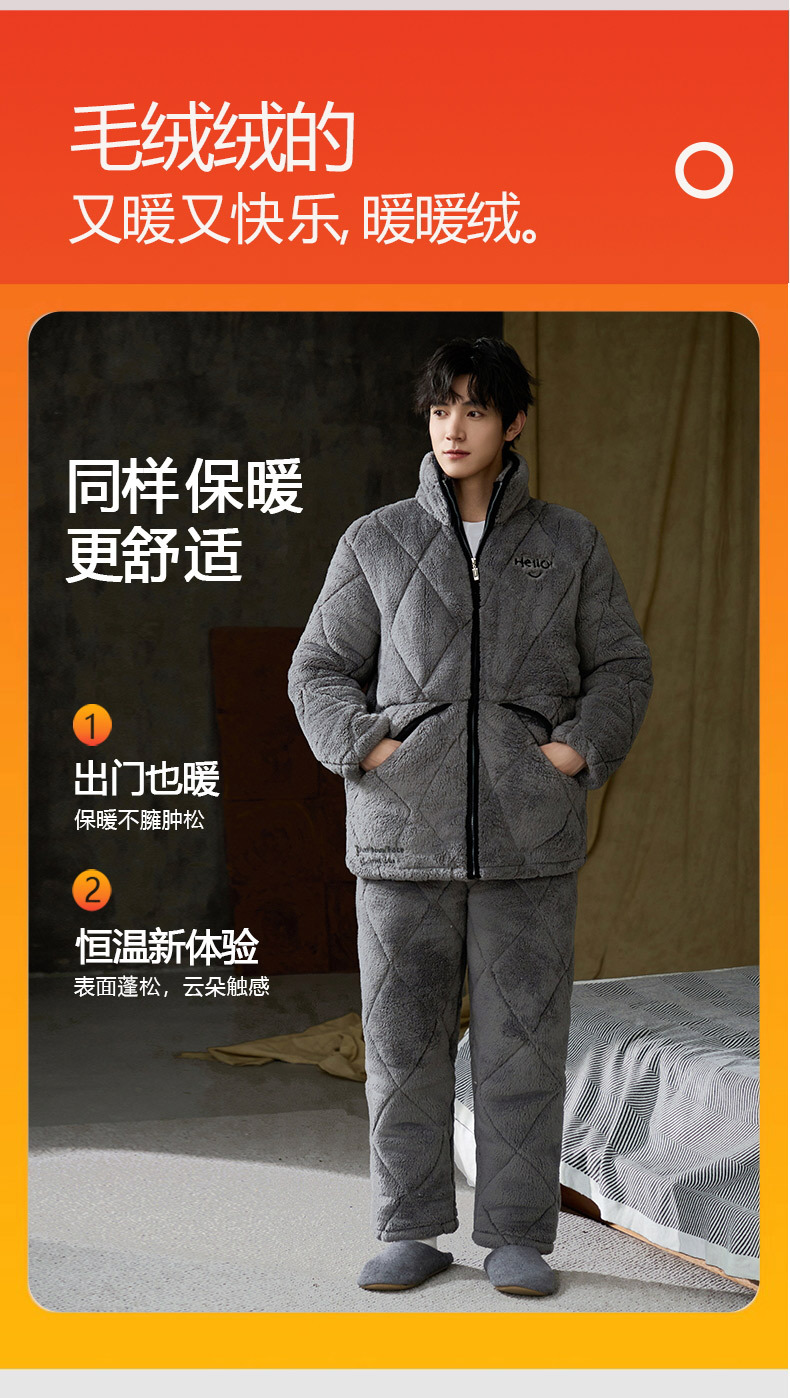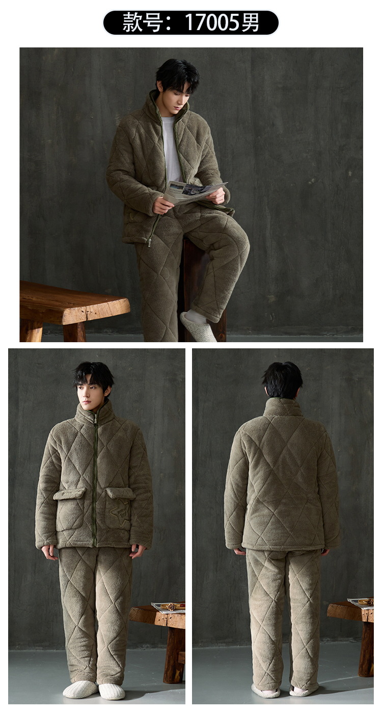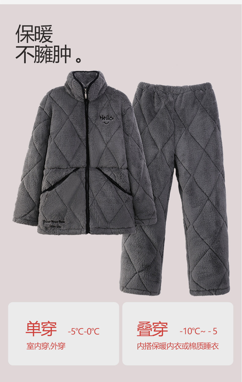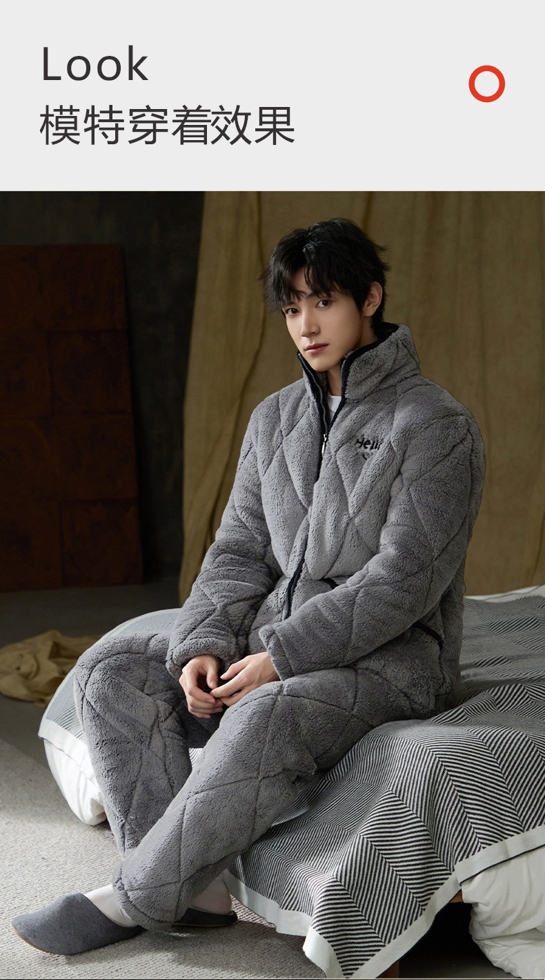 Pijamas de invierno caliente para hombres, tres capas de algodón intercalado, cuello vertical, manga larga, 2024 nuevo conjunto de ropa de hogar simple gris