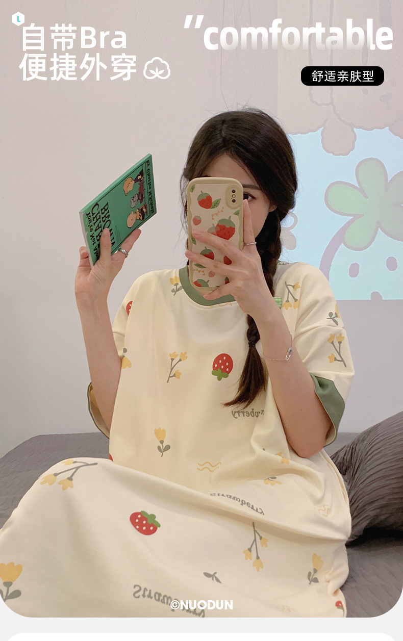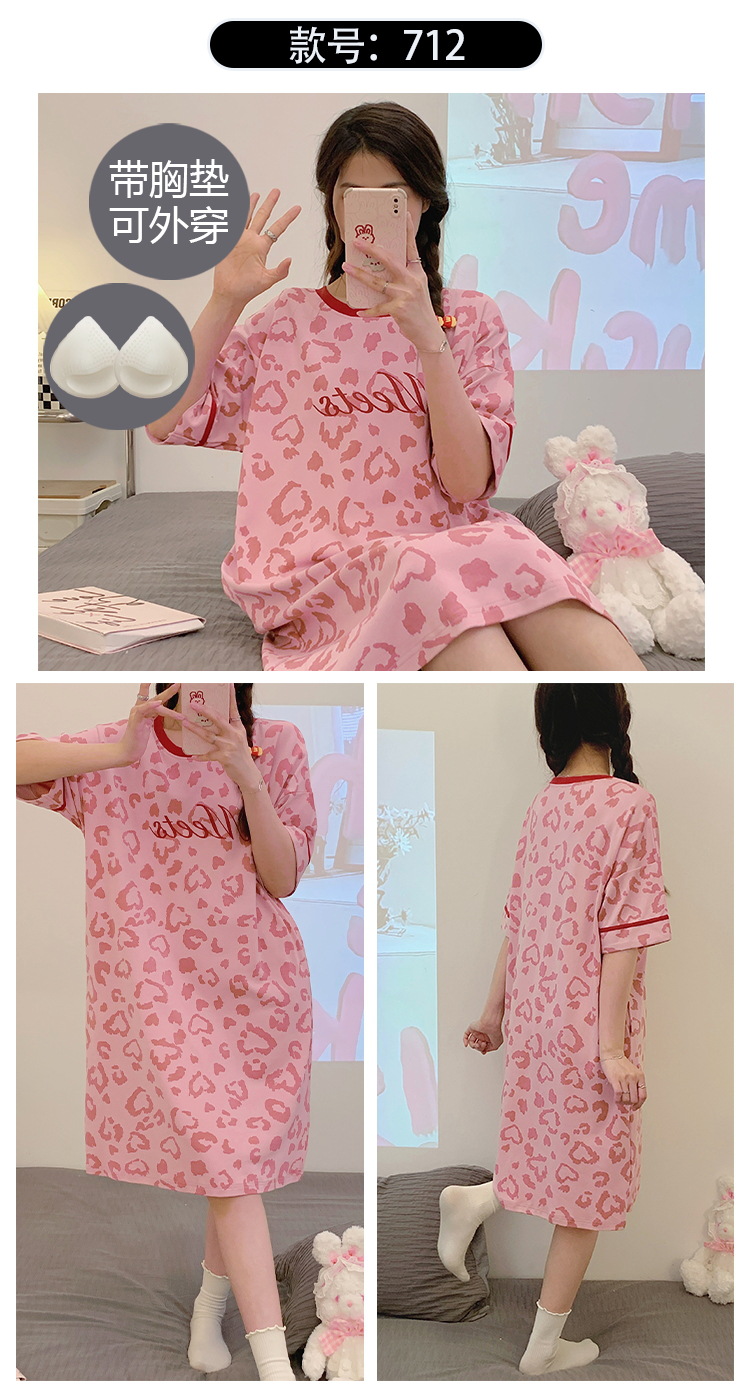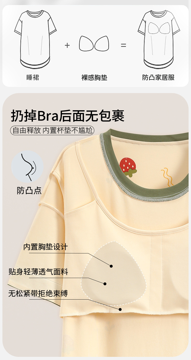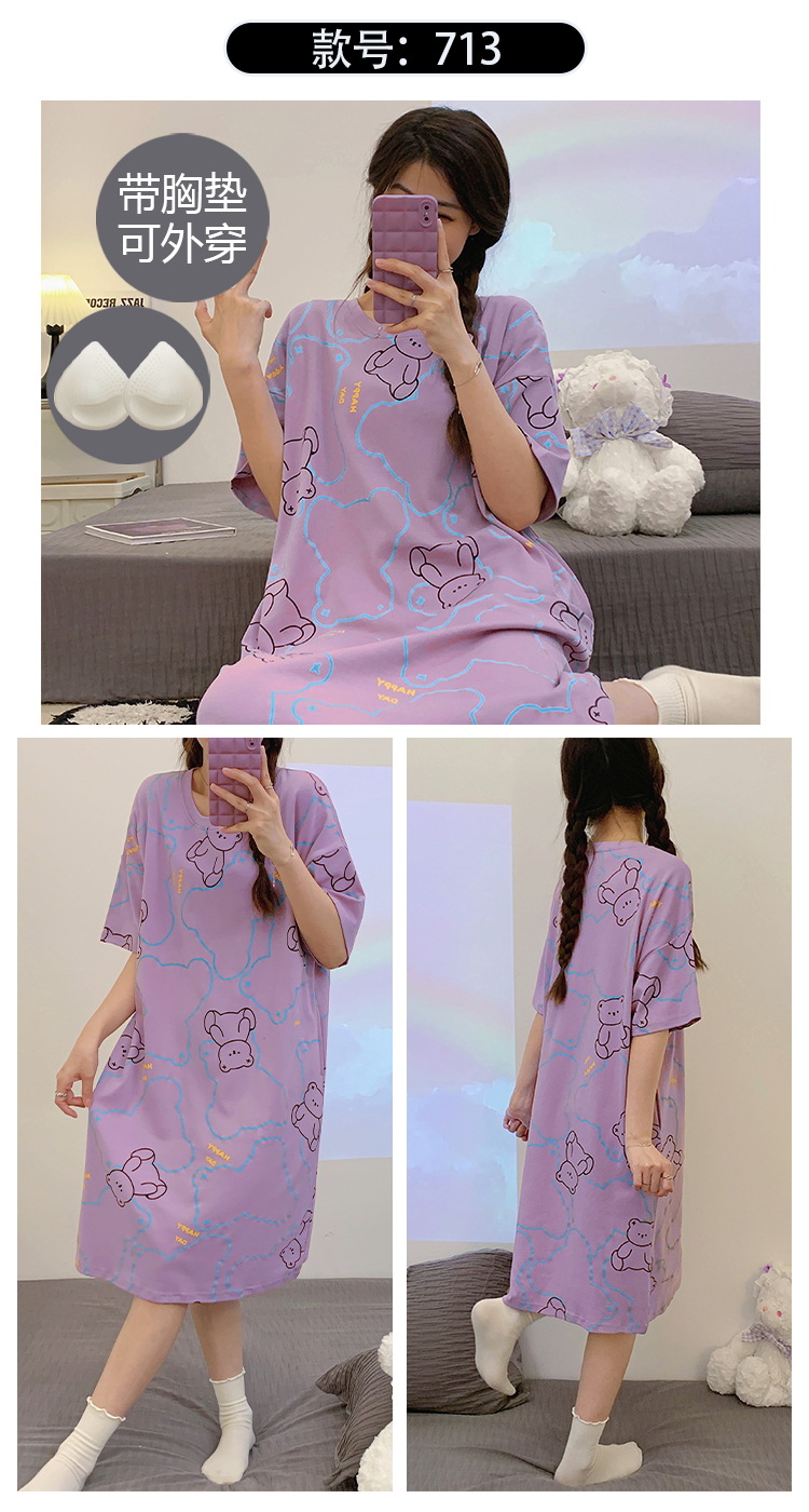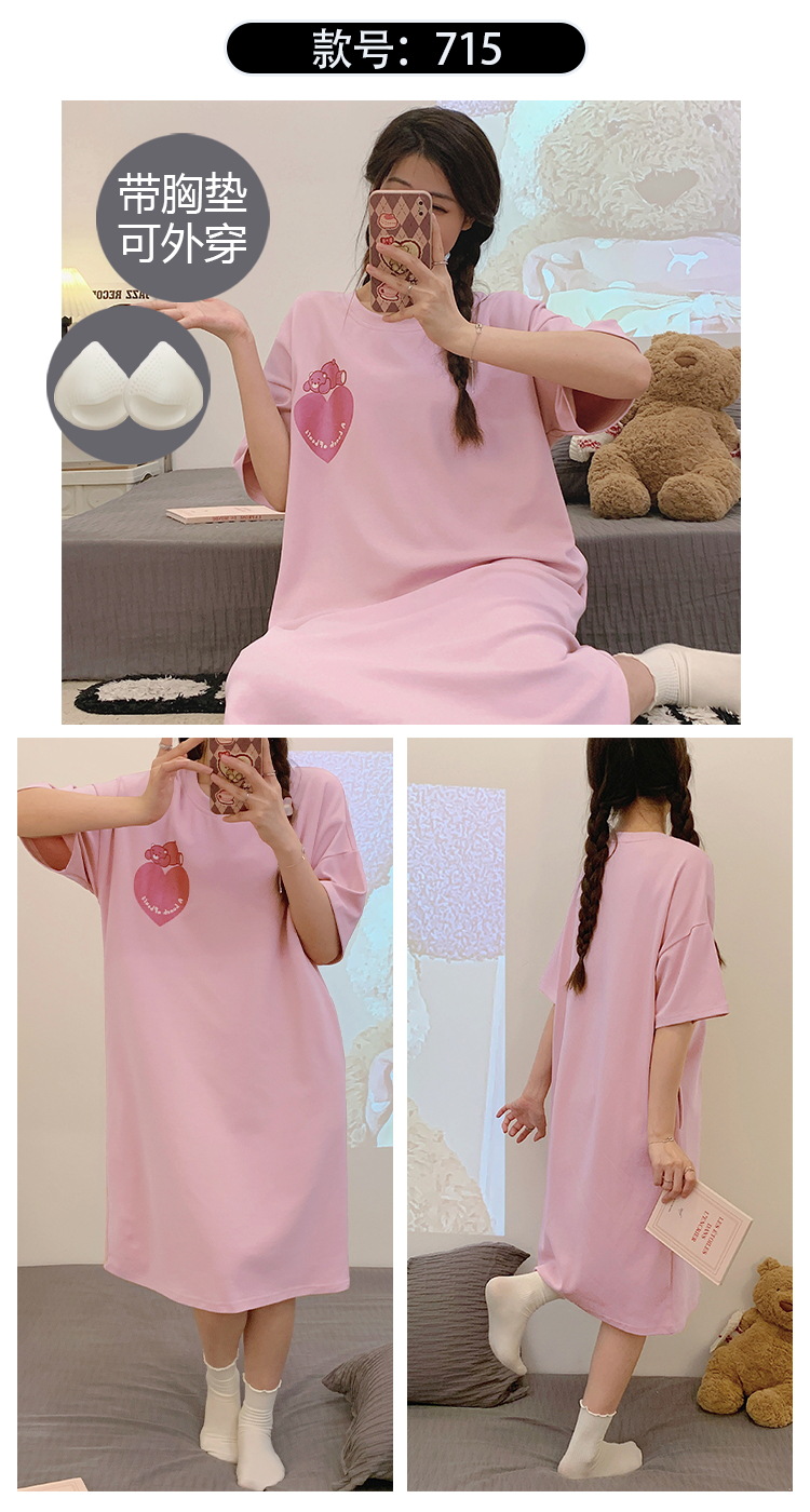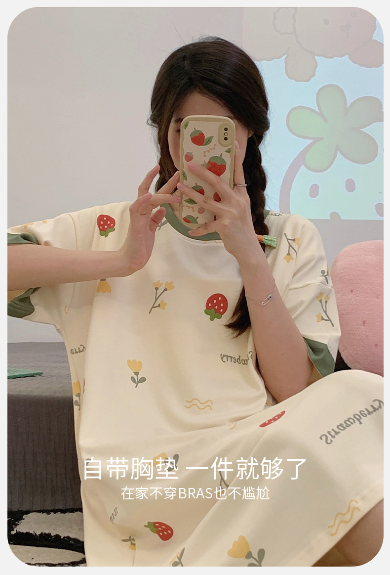 Pijamas con almohadillas para el pecho para mujer, vestido de verano de algodón puro de manga corta y largo medio con dibujos animados, pijamas por encima de la rodilla para mujer, nuevo estilo 2025