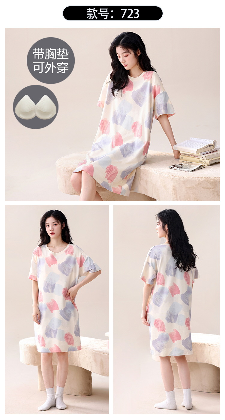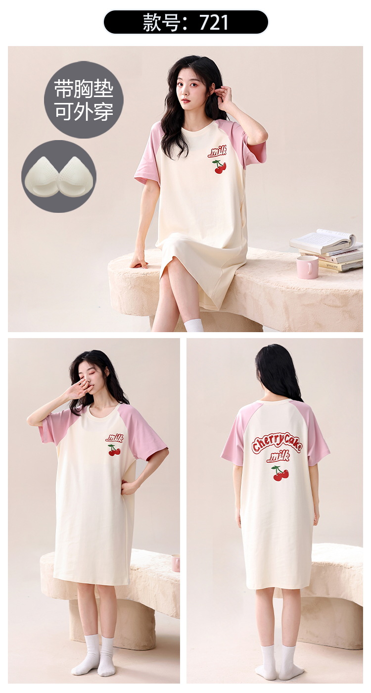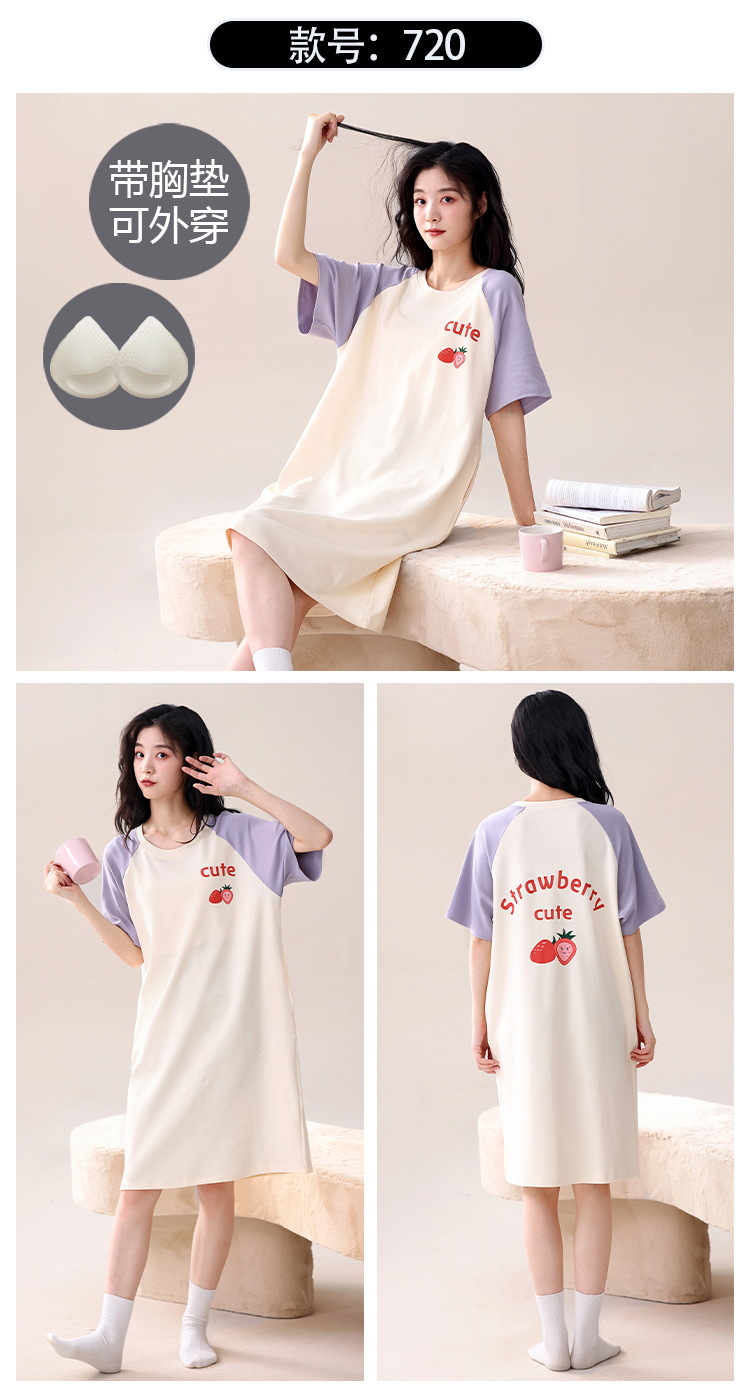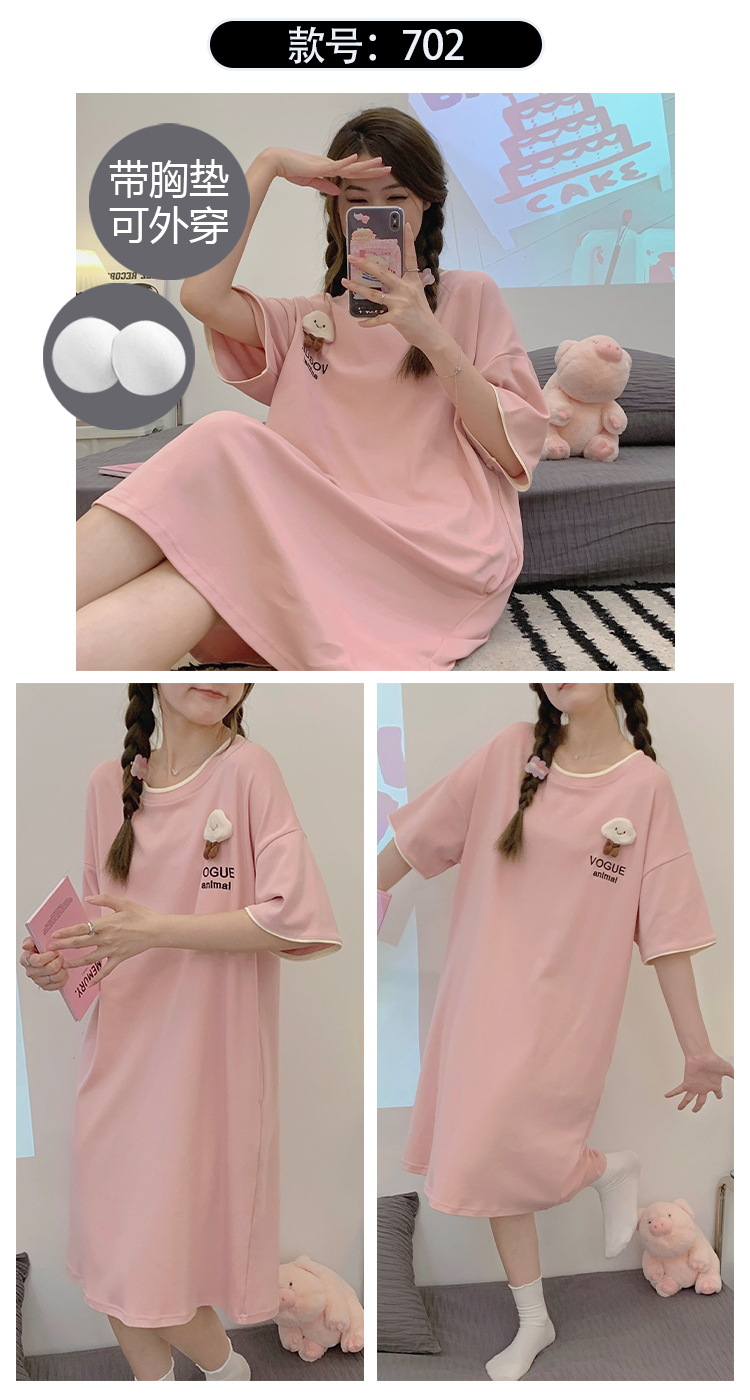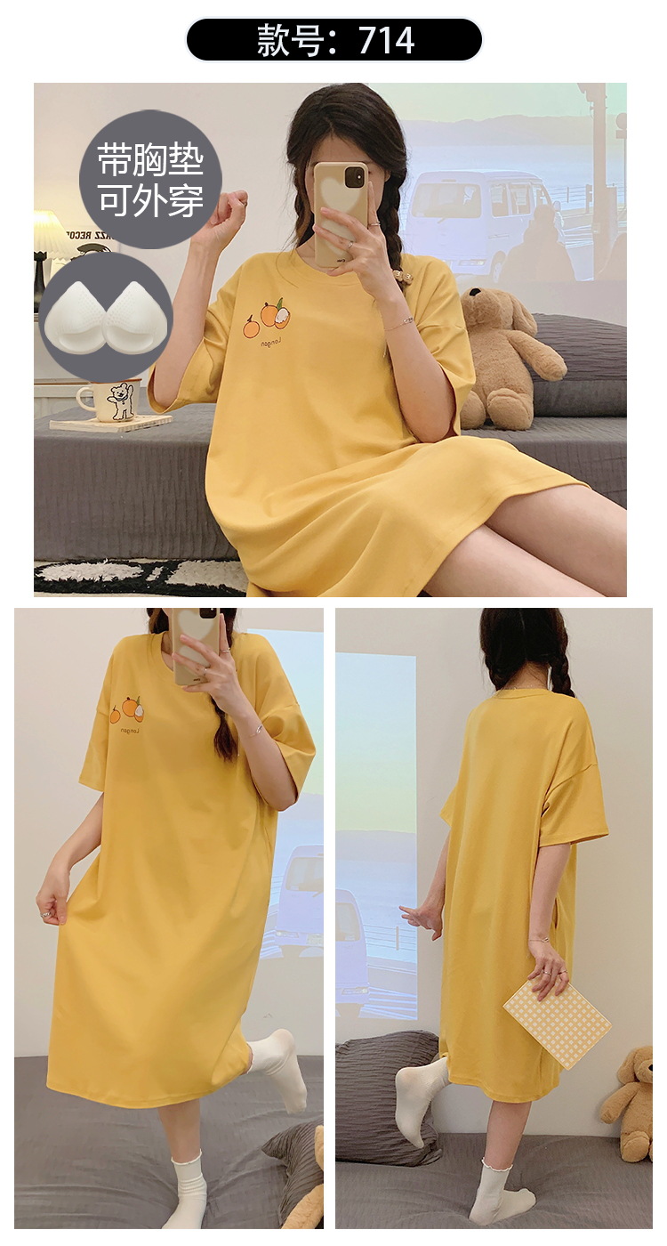 Pijamas con almohadillas para el pecho para mujer, vestido de verano de algodón puro de manga corta y largo medio con dibujos animados, pijamas por encima de la rodilla para mujer, nuevo estilo 2025