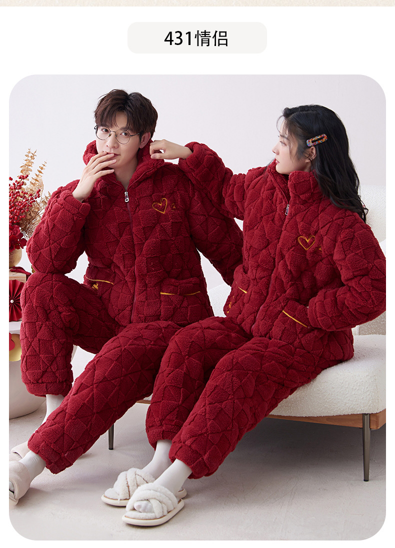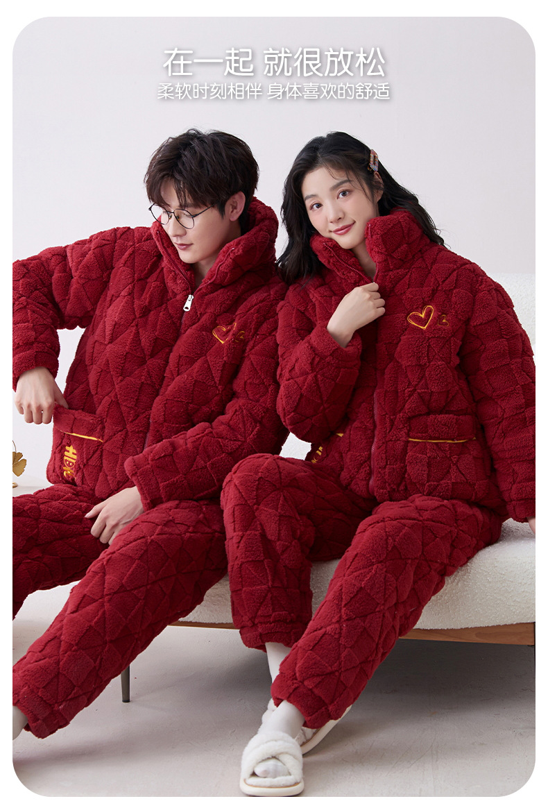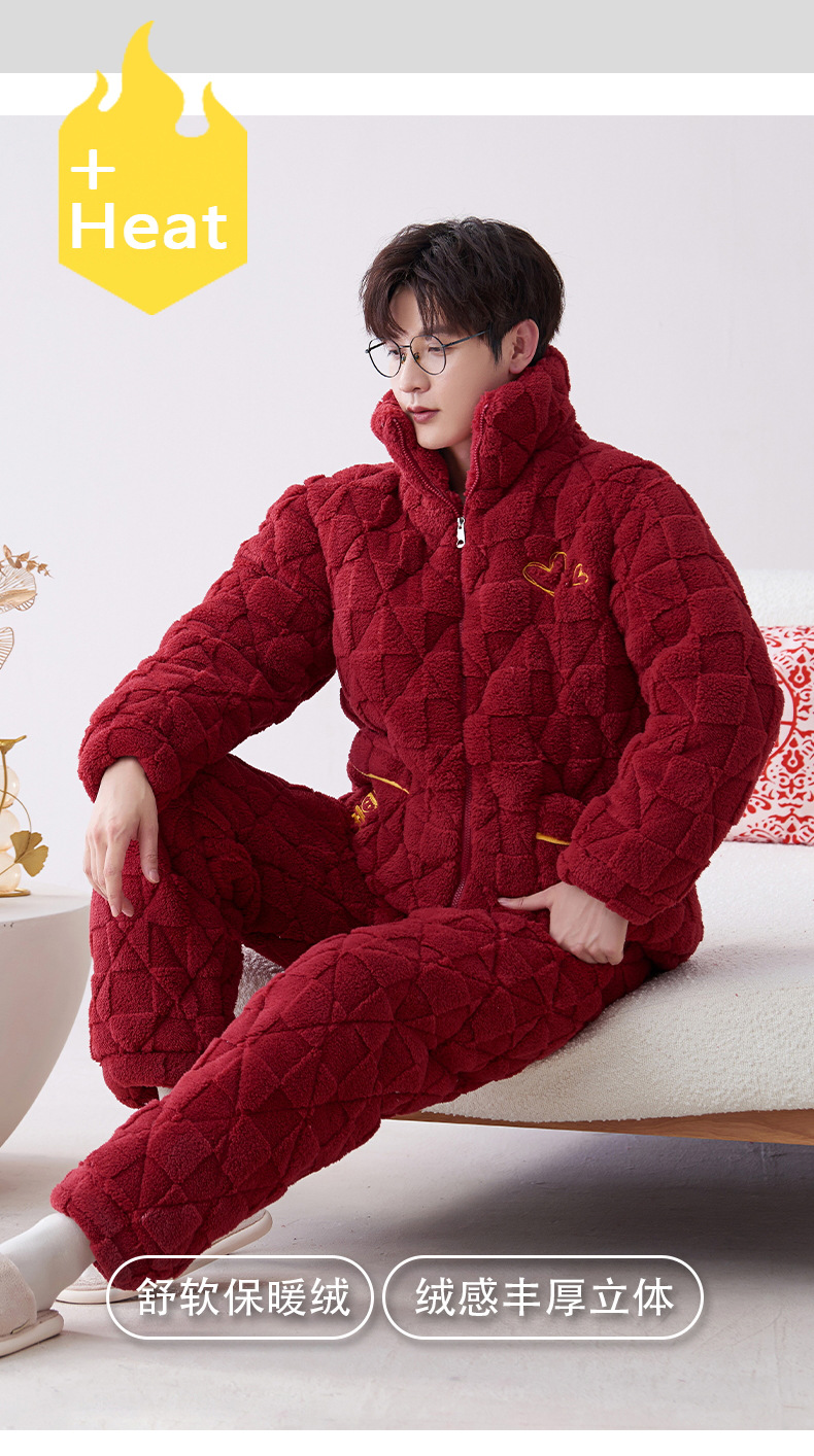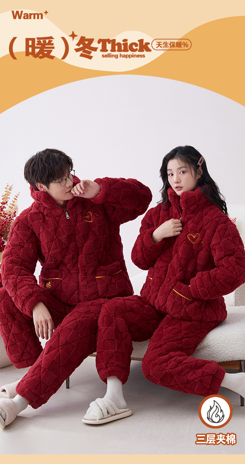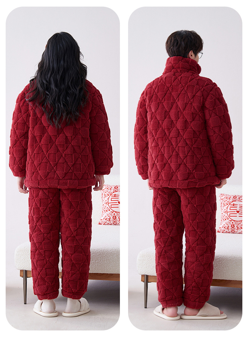 Pijamas de pareja roja de invierno de tres capas acolchadas de lana coral engrosada con forro de lana recién casados hombres y mujeres ropa de hogar de franela