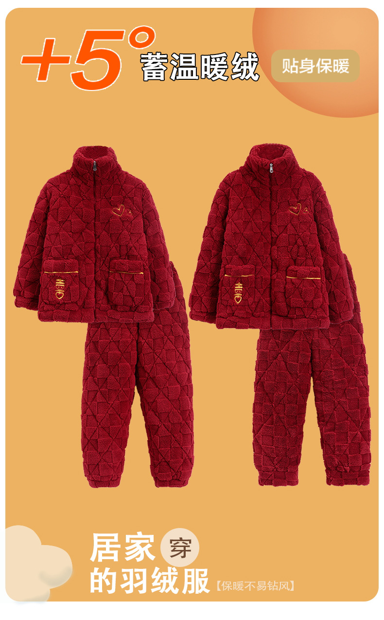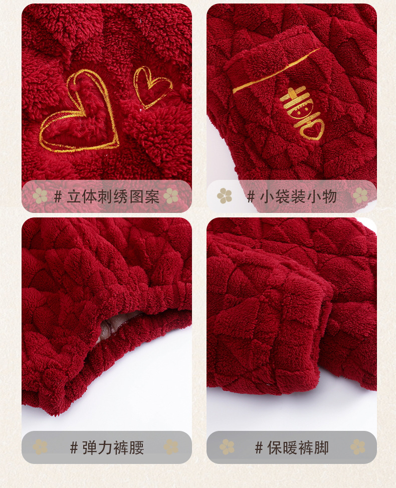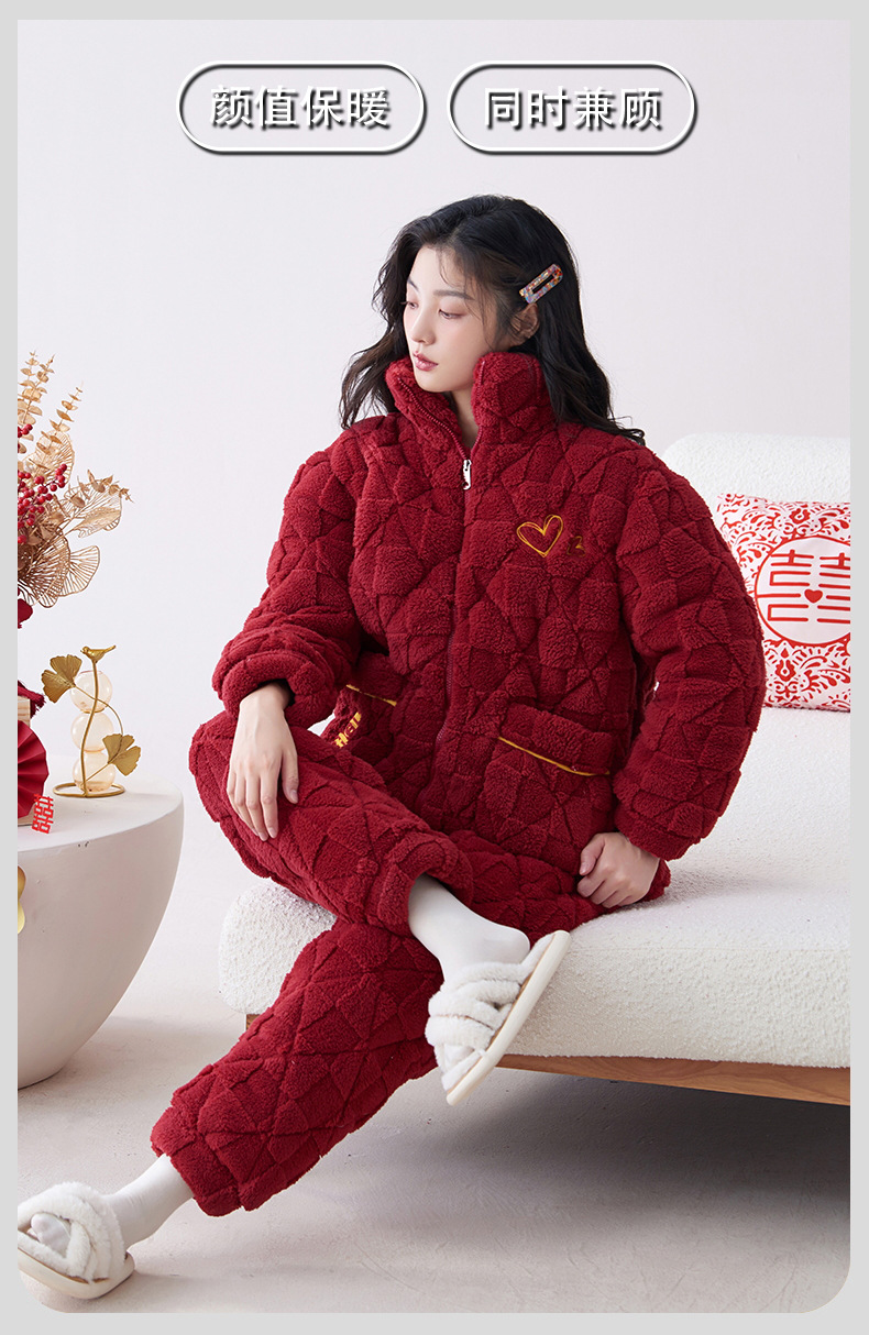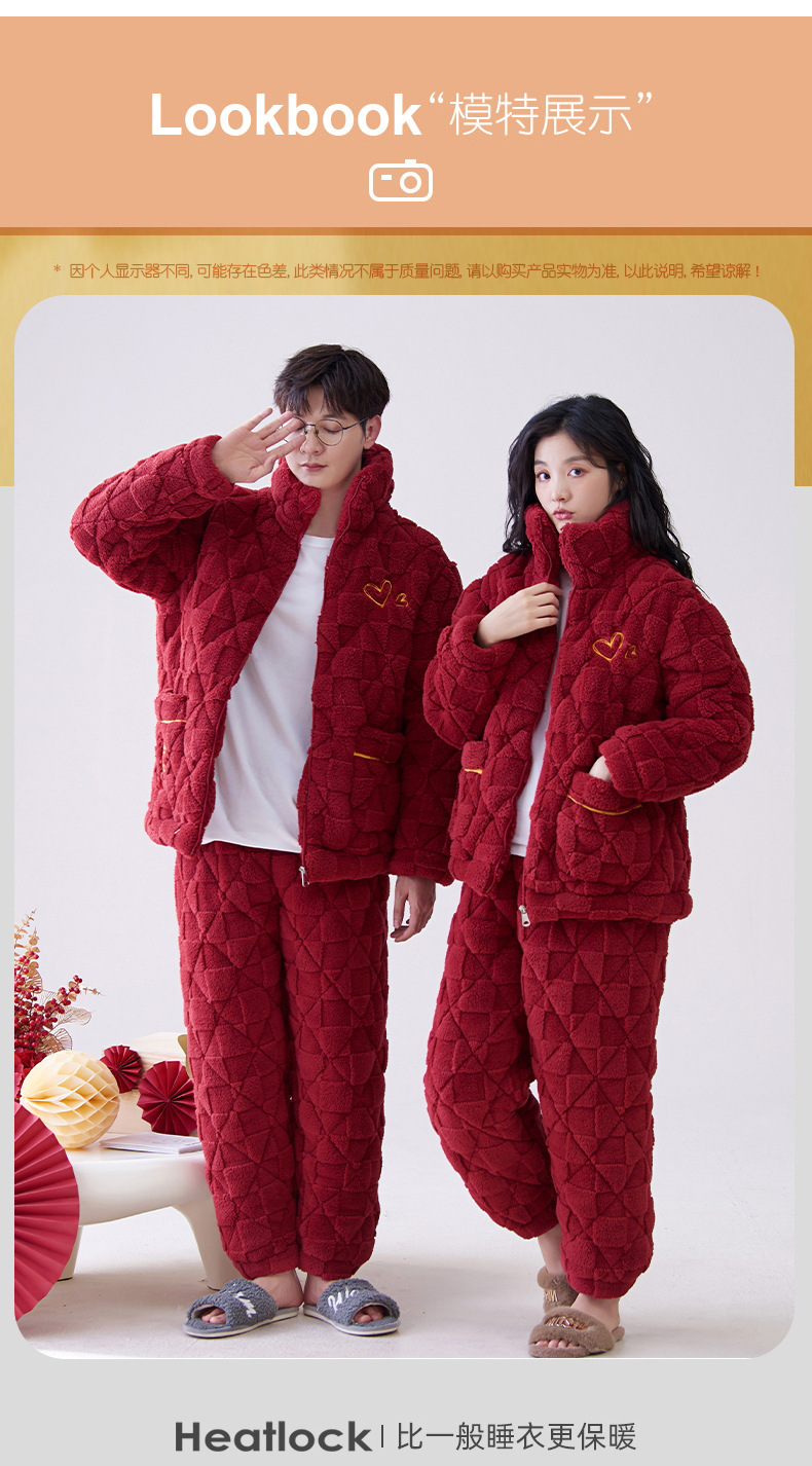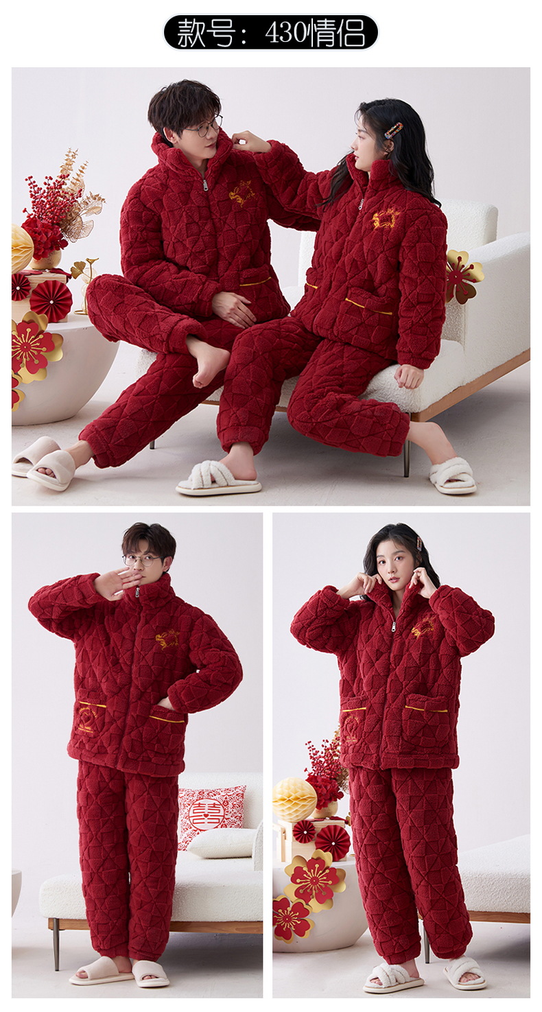 Pijamas de pareja roja de invierno de tres capas acolchadas de lana coral engrosada con forro de lana recién casados hombres y mujeres ropa de hogar de franela