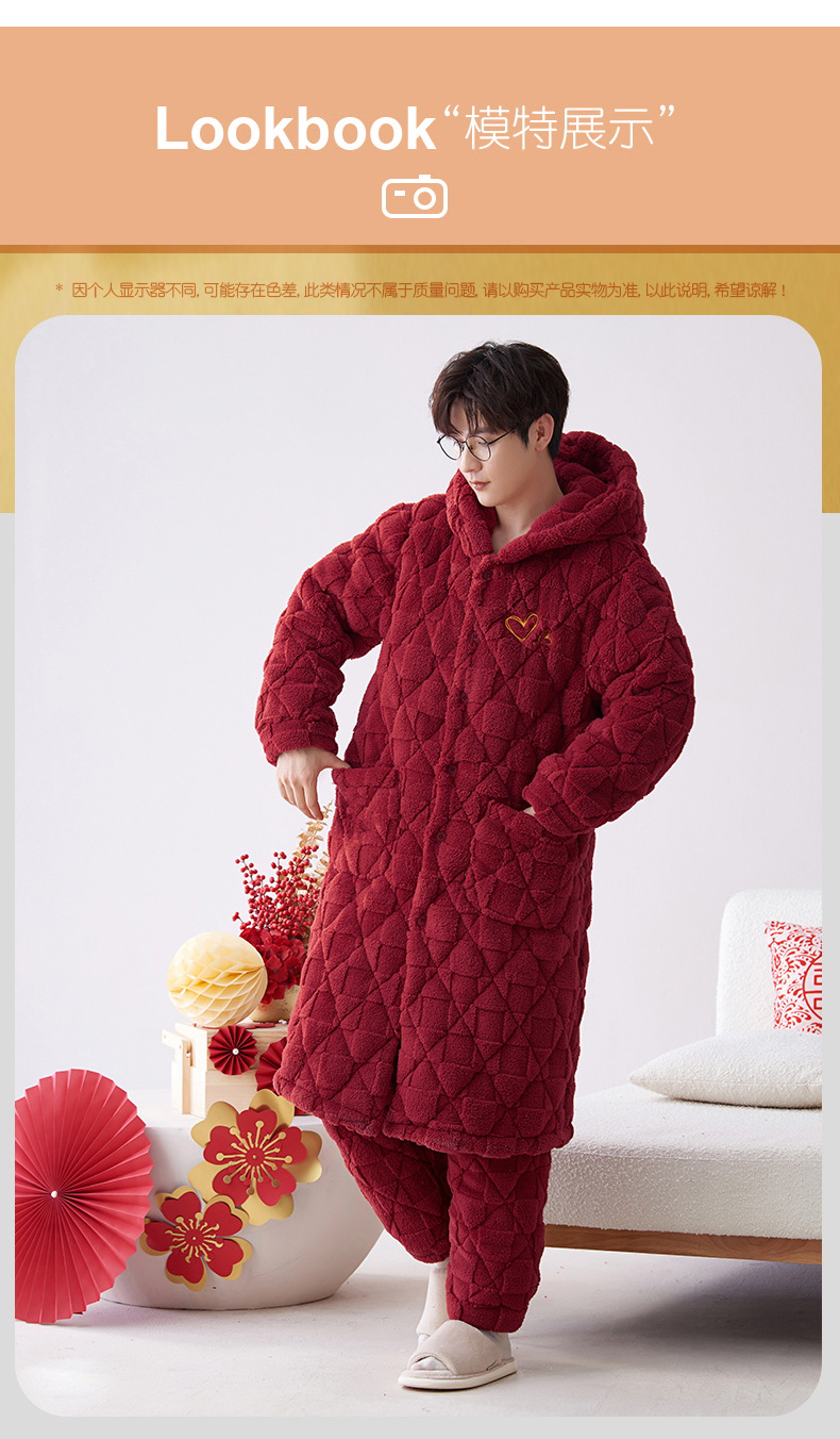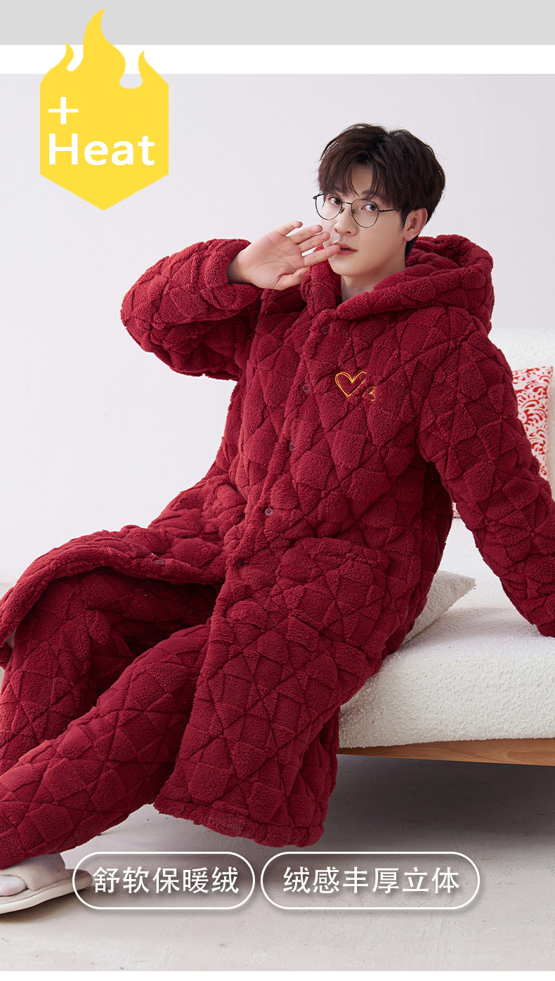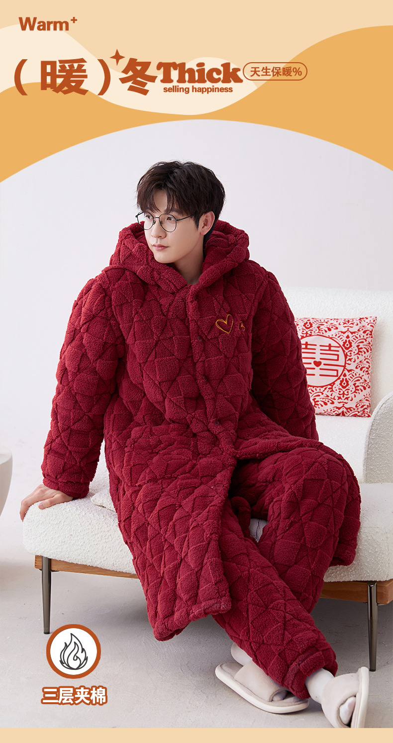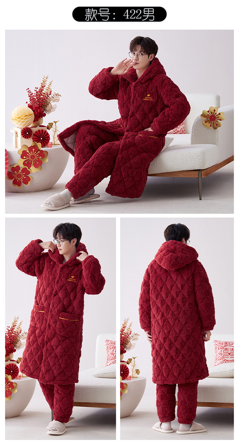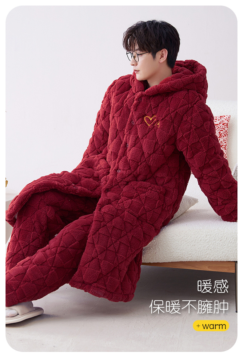 Pijamas de hombre de otoño e invierno de lana de coral de tres capas acolchadas engrosadas de lana forrada de invierno de color rojo brillante cálido traje de desgaste para el hogar