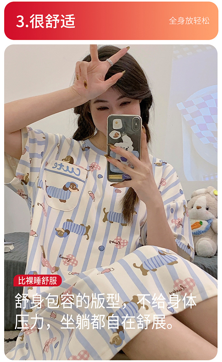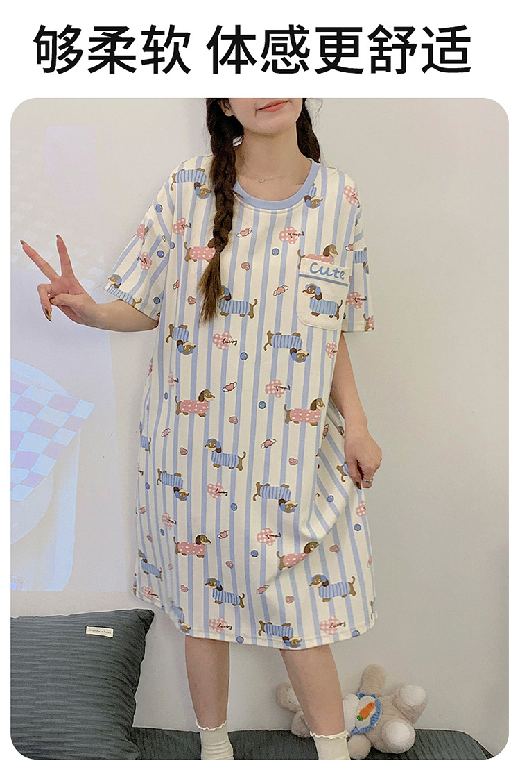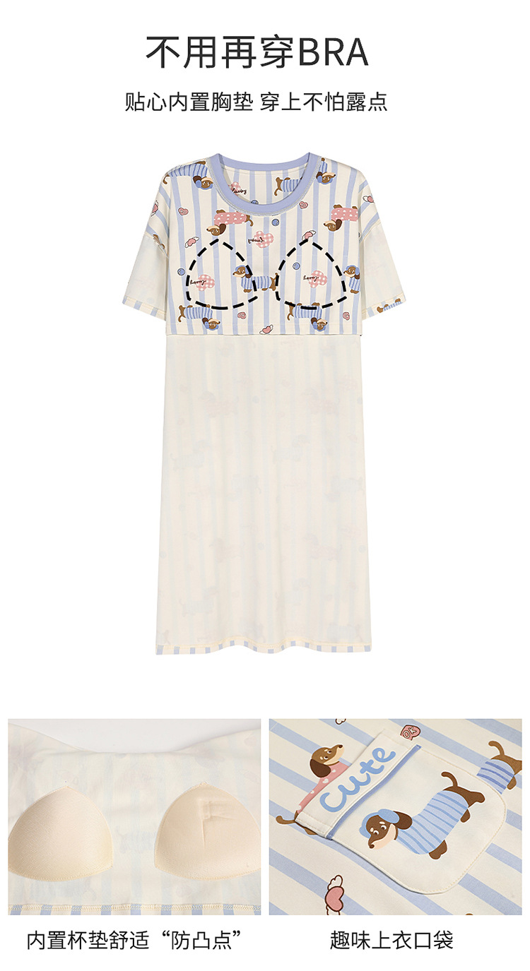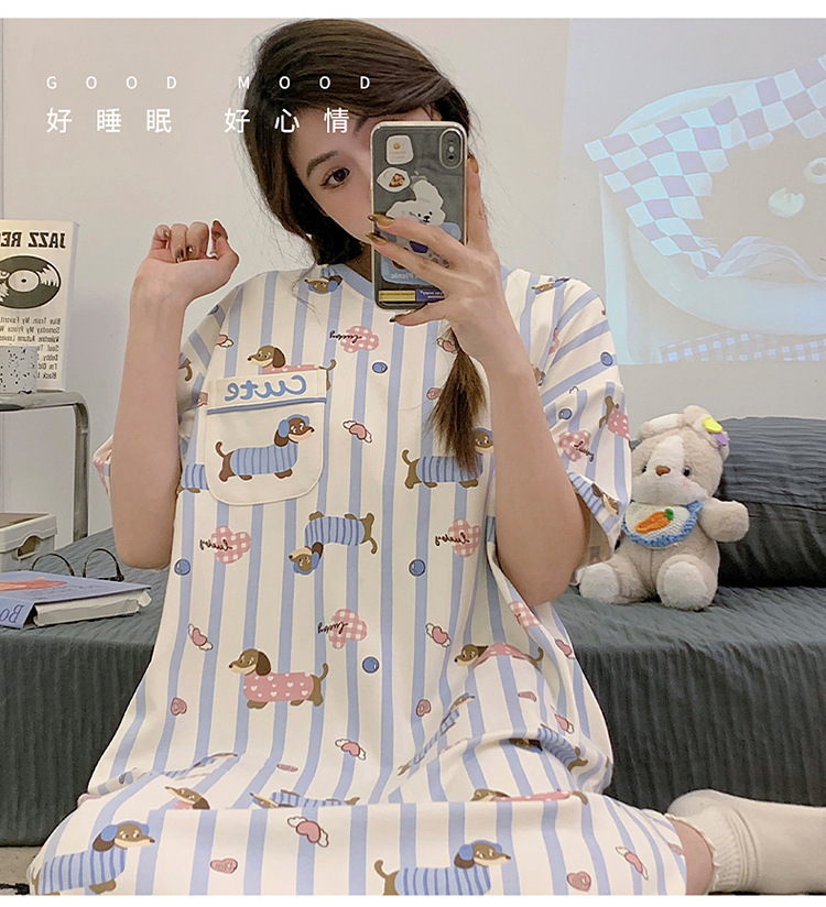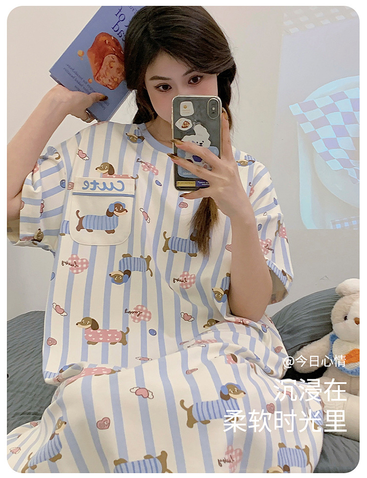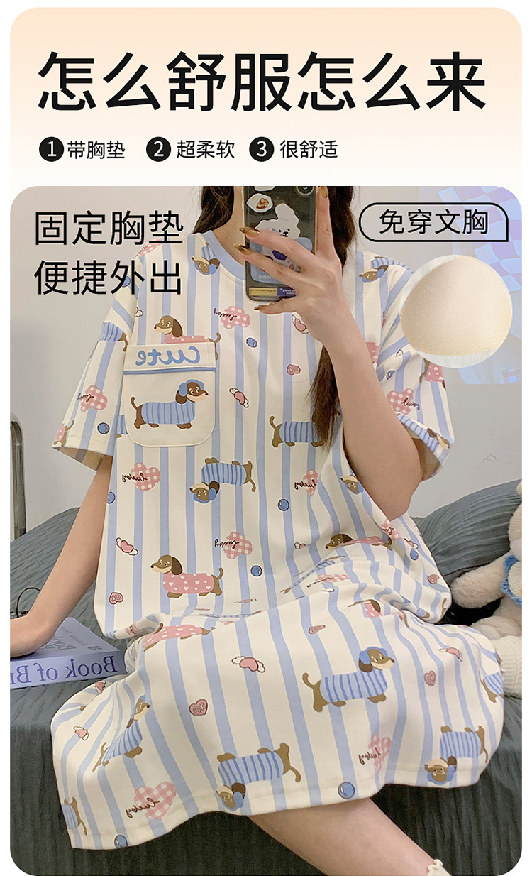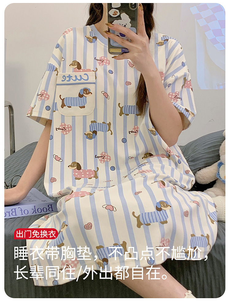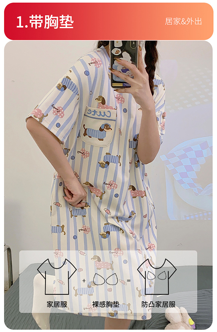 Pijama de mujer con almohadilla de pecho de dibujos animados red viento rojo estudiantes de manga corta, vestido largo medio, pijama integral de verano se puede usar fuera