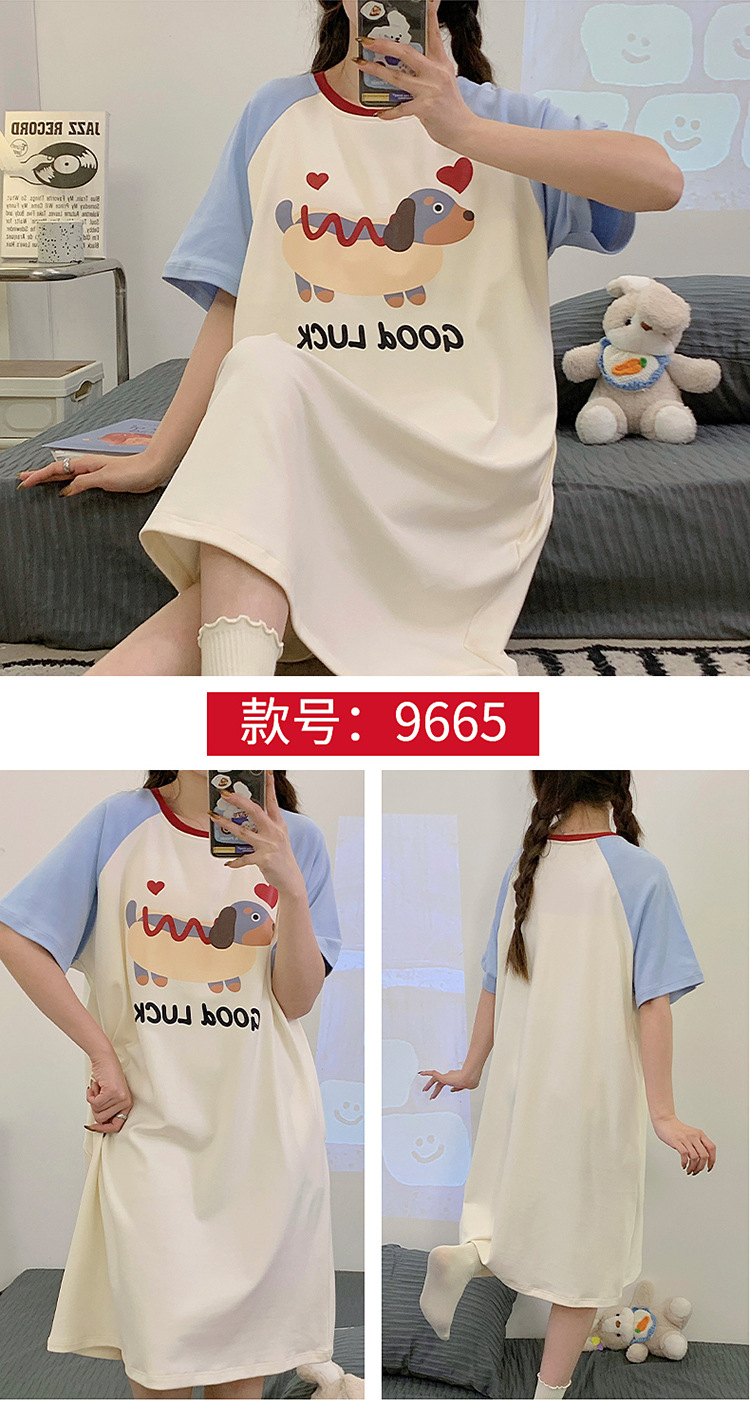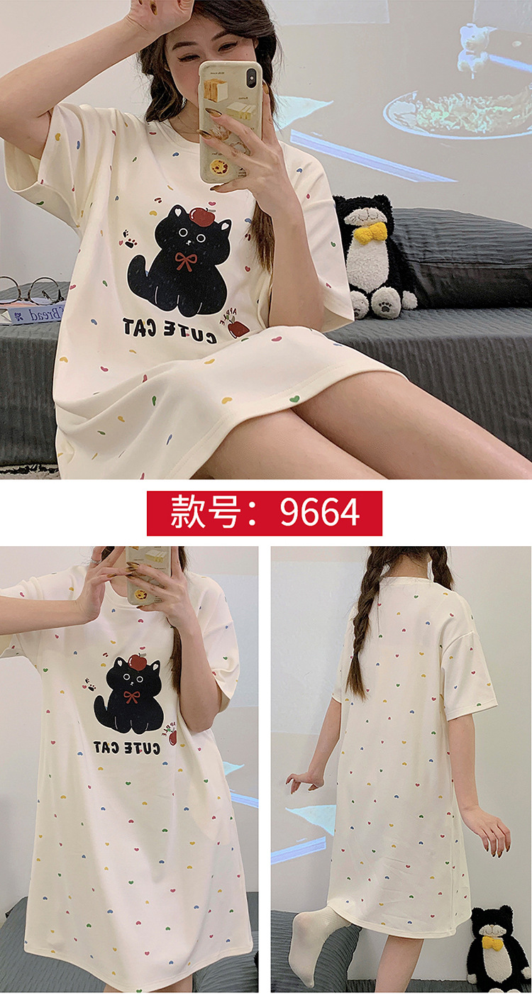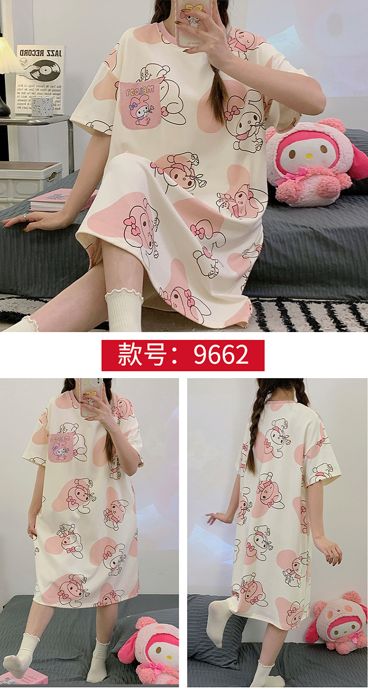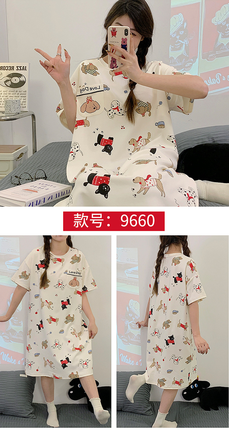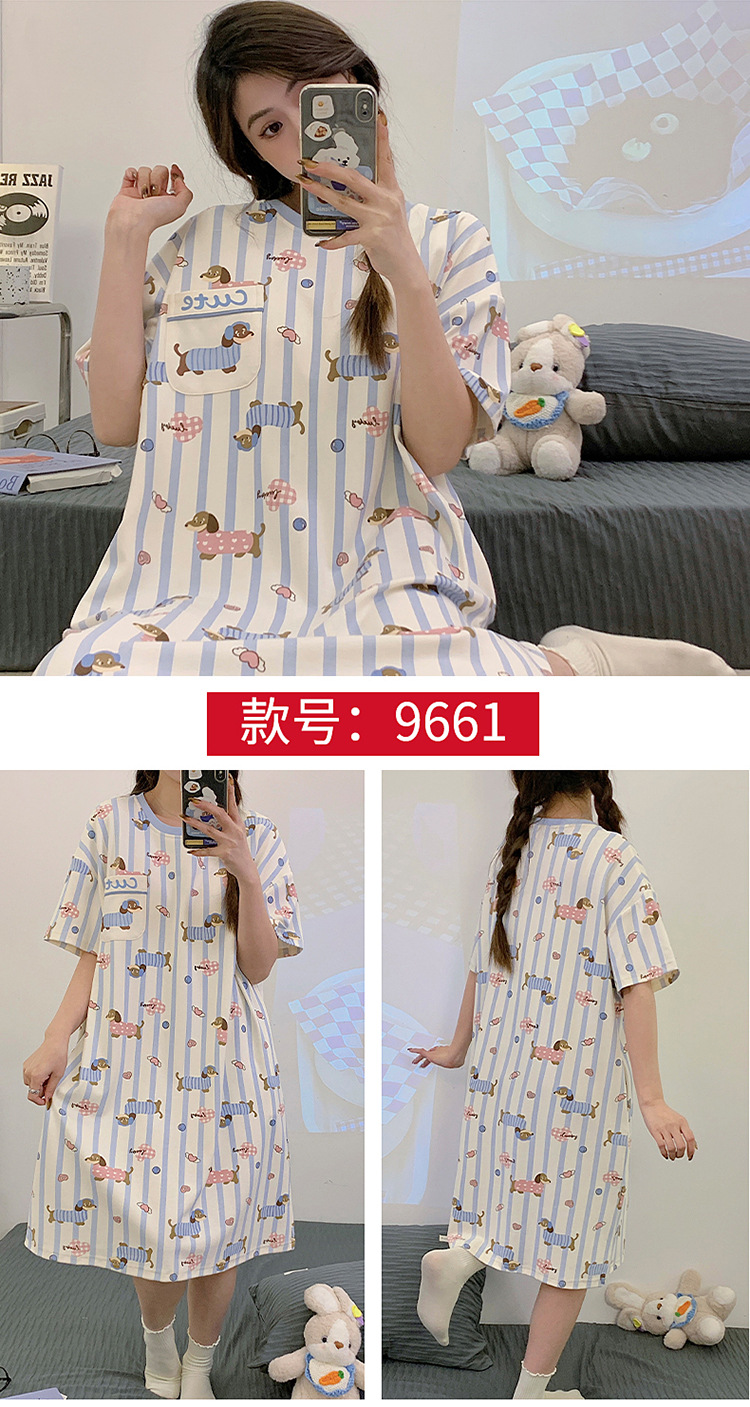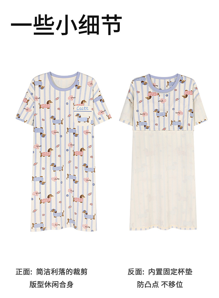 Pijama de mujer con almohadilla de pecho de dibujos animados red viento rojo estudiantes de manga corta, vestido largo medio, pijama integral de verano se puede usar fuera