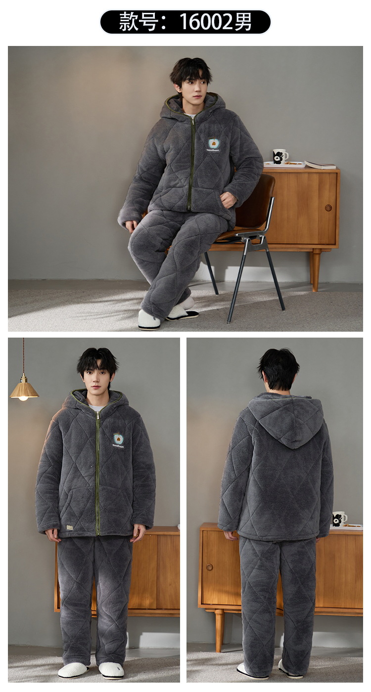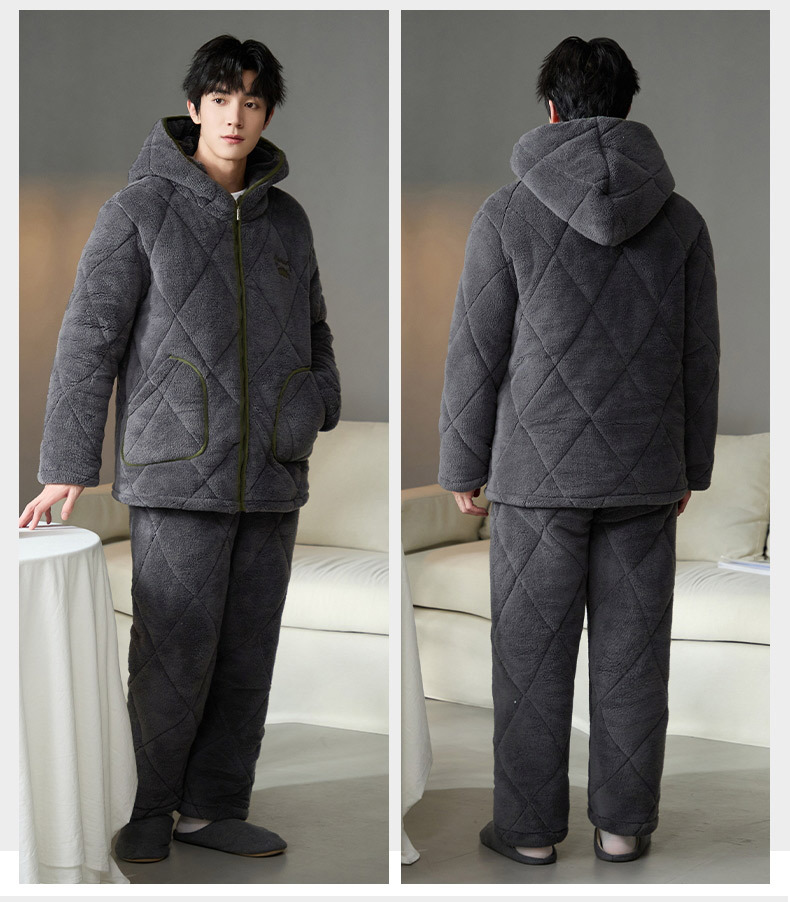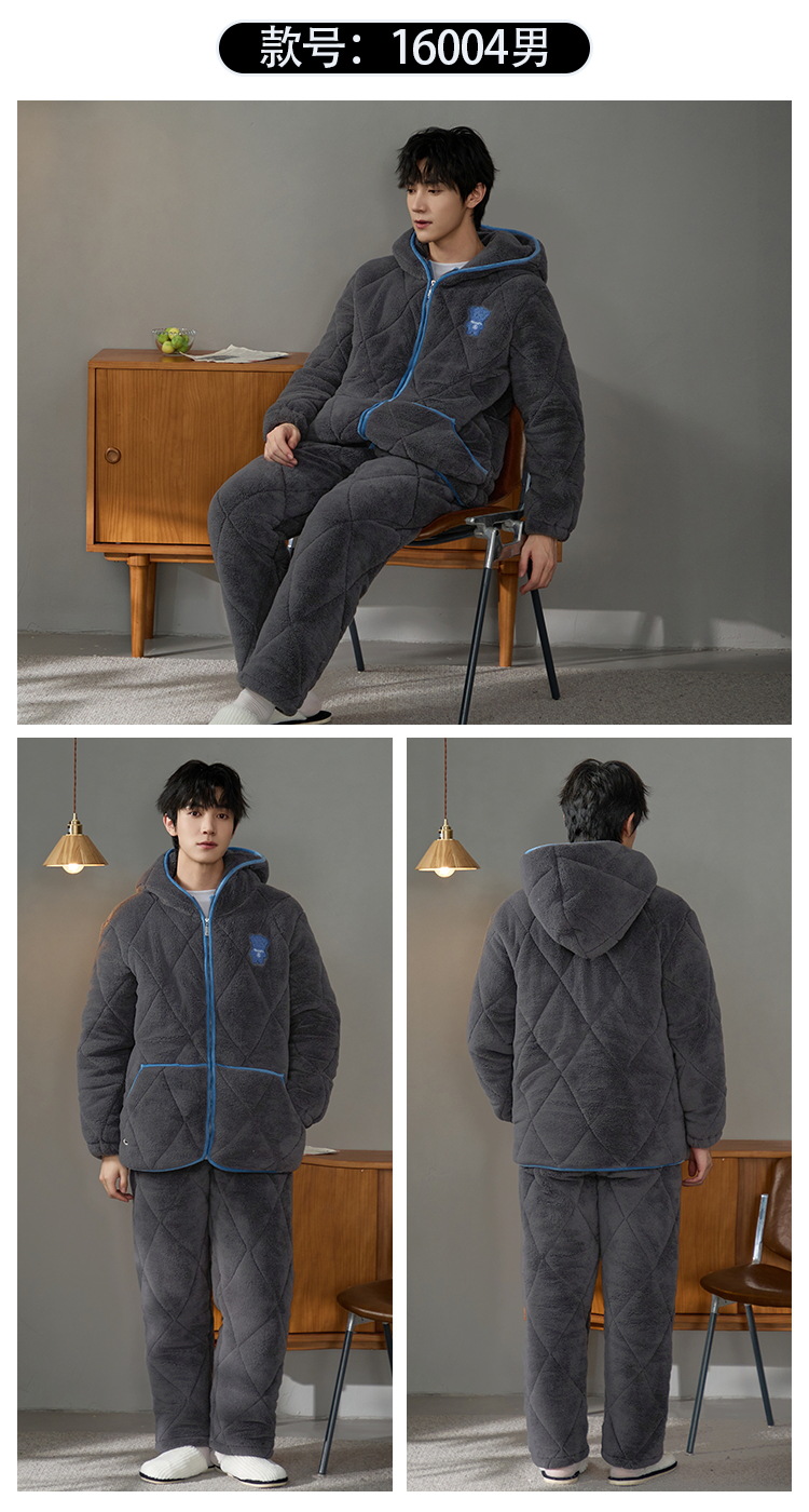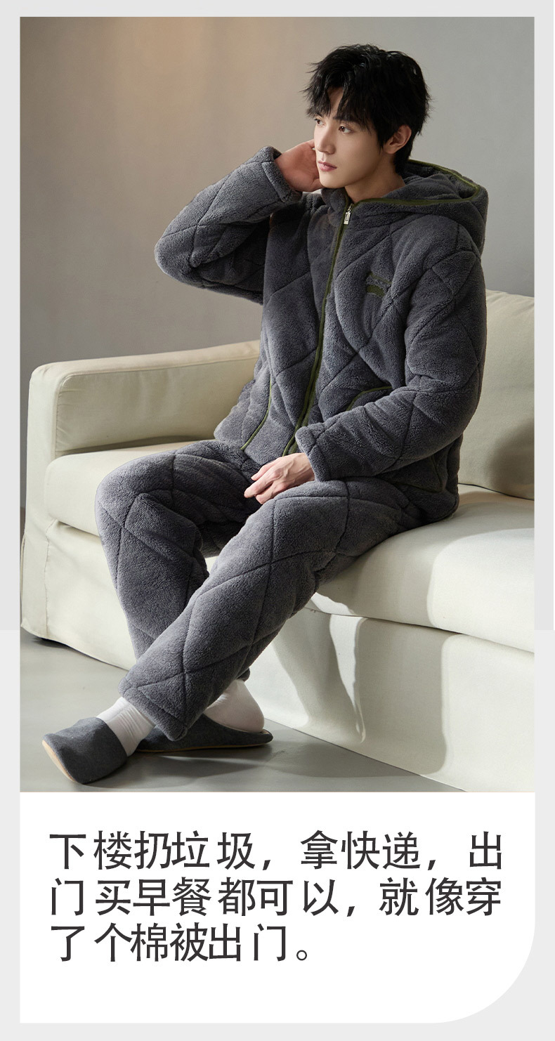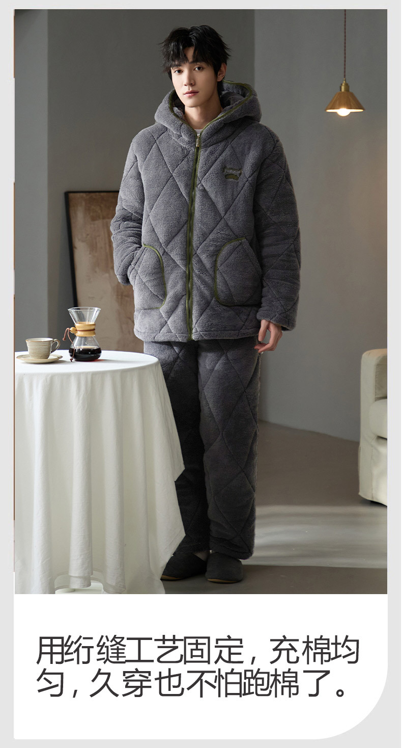 Pijamas de algodón de tres capas para hombres 2024 invierno de lana de coral de manga larga suelta y gruesa ropa de casa cálida set casual