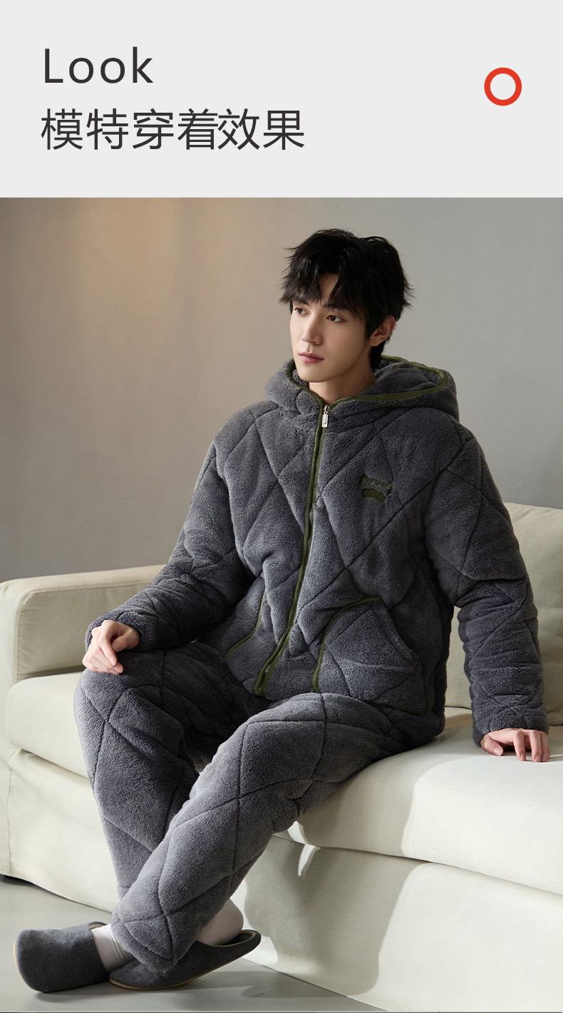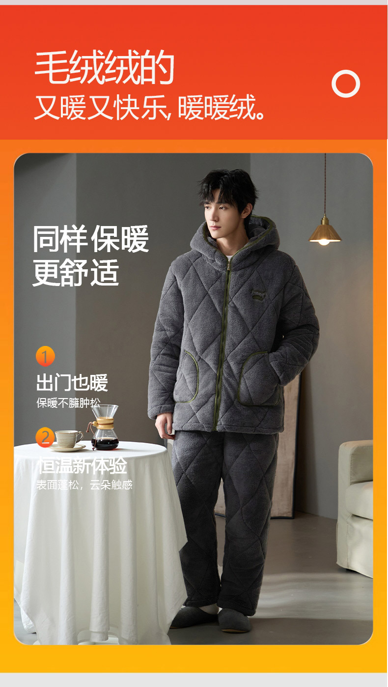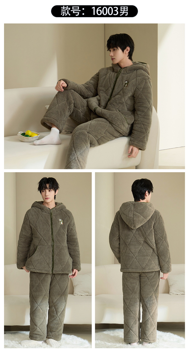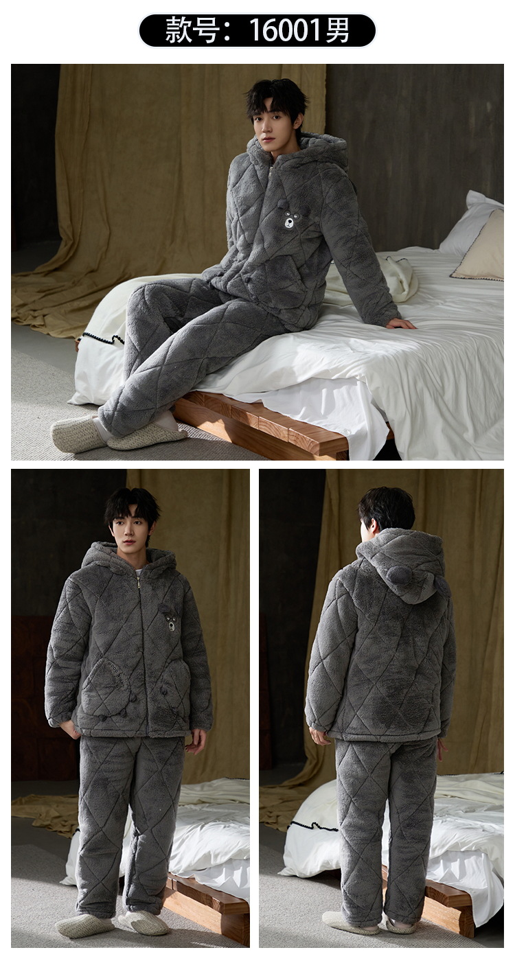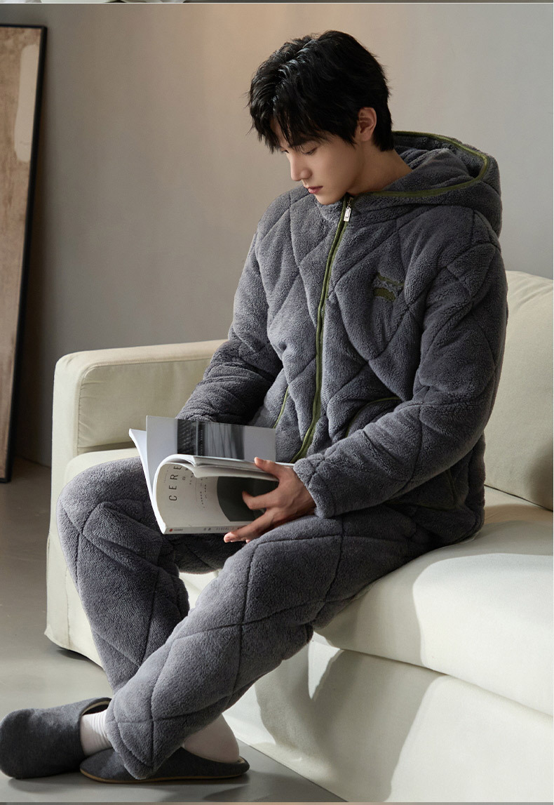 Pijamas de algodón de tres capas para hombres 2024 invierno de lana de coral de manga larga suelta y gruesa ropa de casa cálida set casual