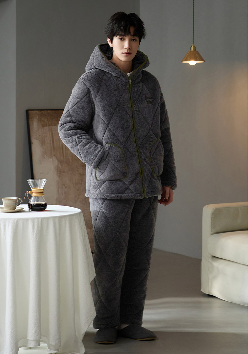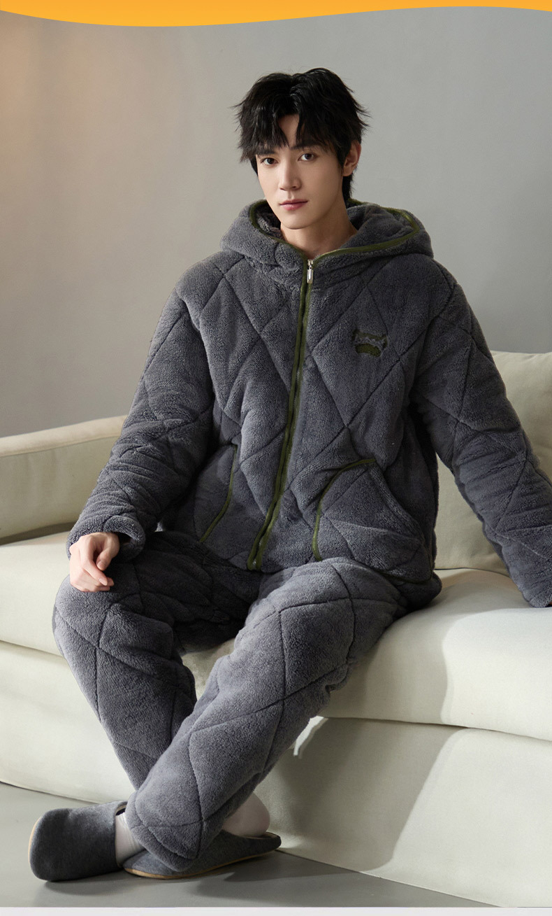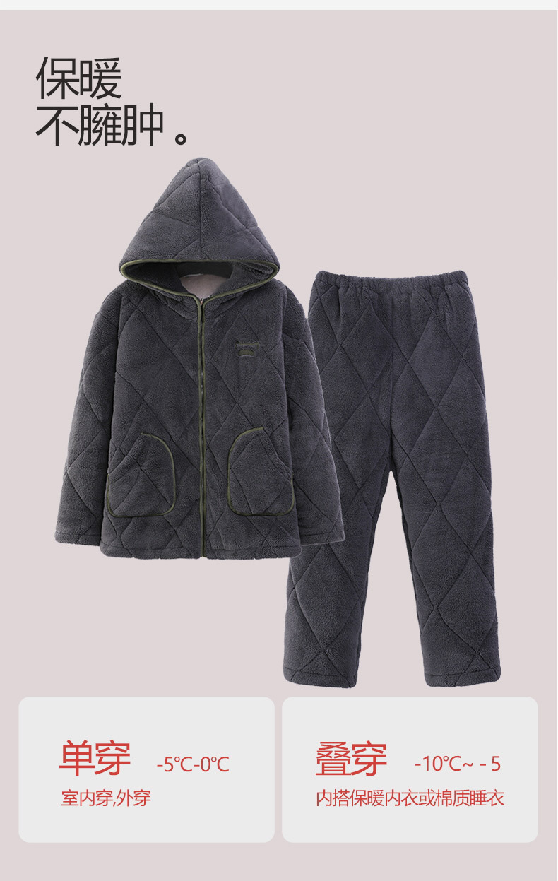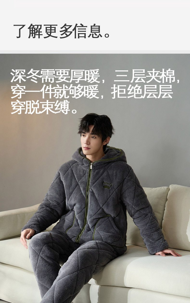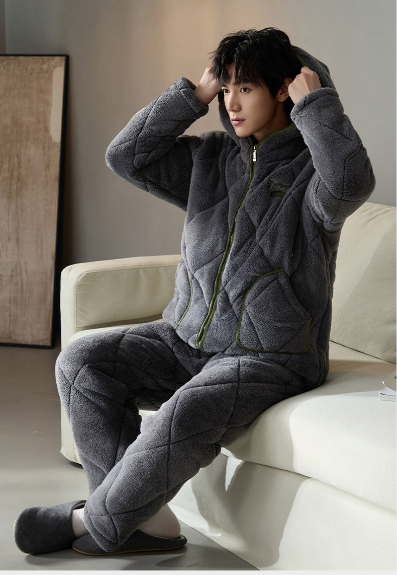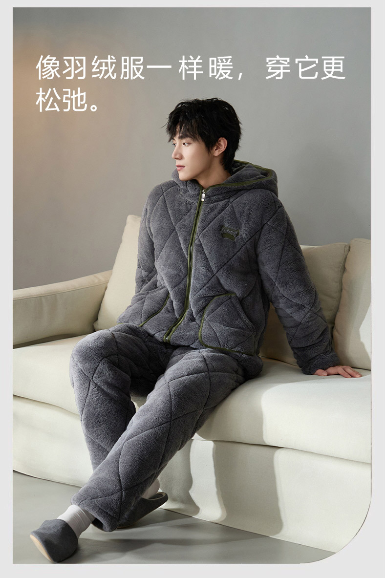 Pijamas de algodón de tres capas para hombres 2024 invierno de lana de coral de manga larga suelta y gruesa ropa de casa cálida set casual