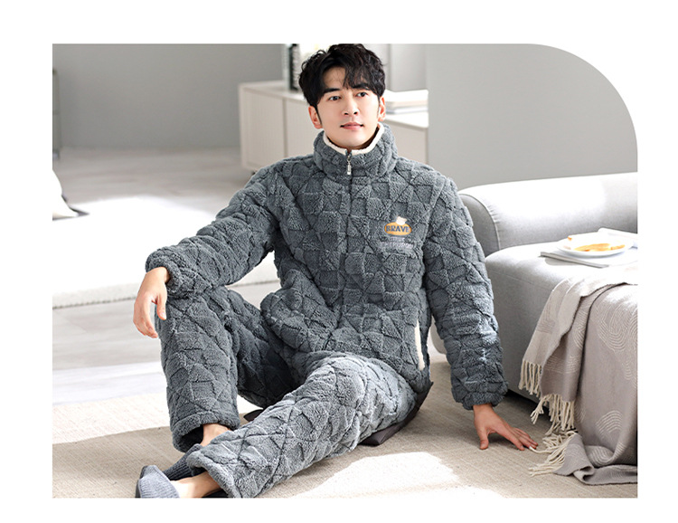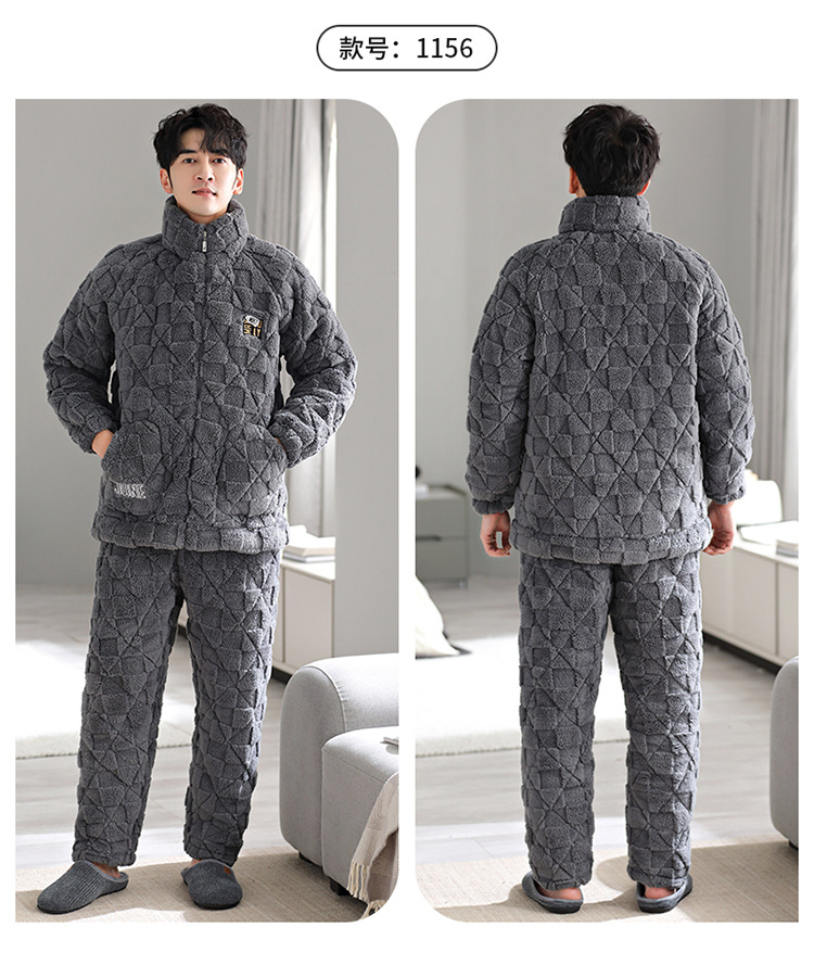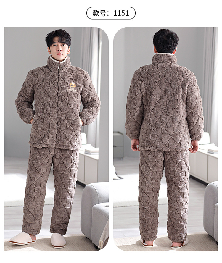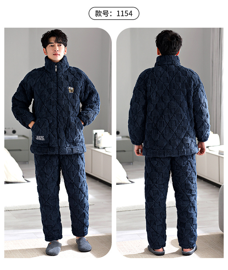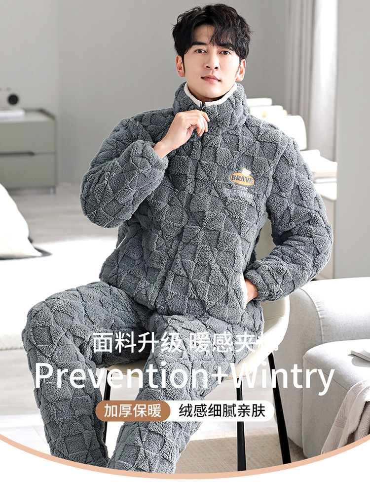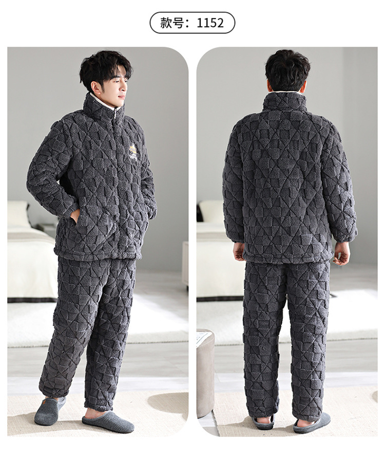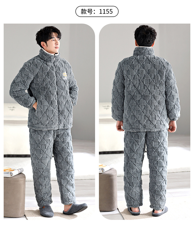 Pijama de hombre invierno de lana de coral tres capas de algodón intercalado grueso y chaqueta de lana de algodón calentamiento conjunto de ropa para el hogar de franela