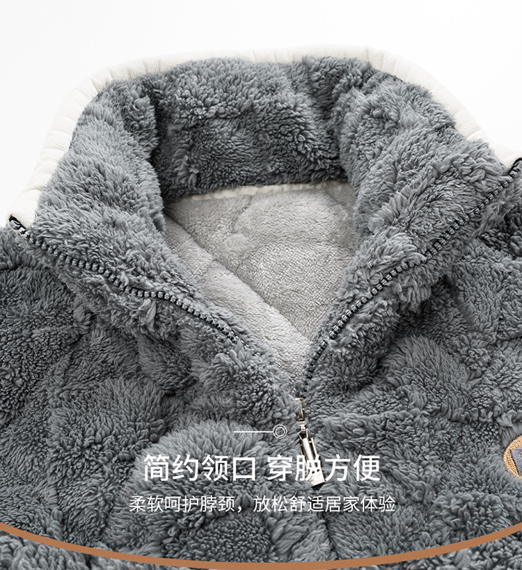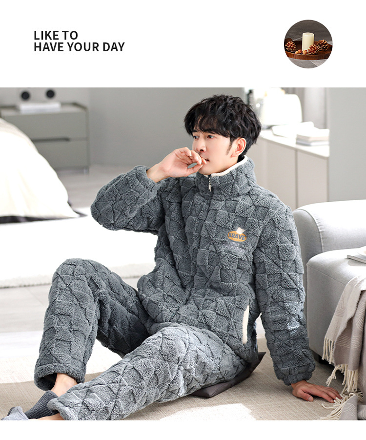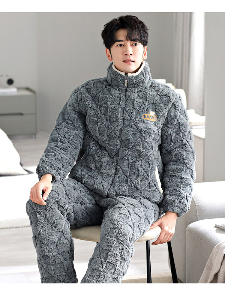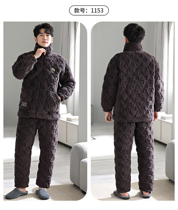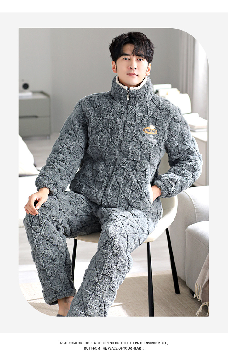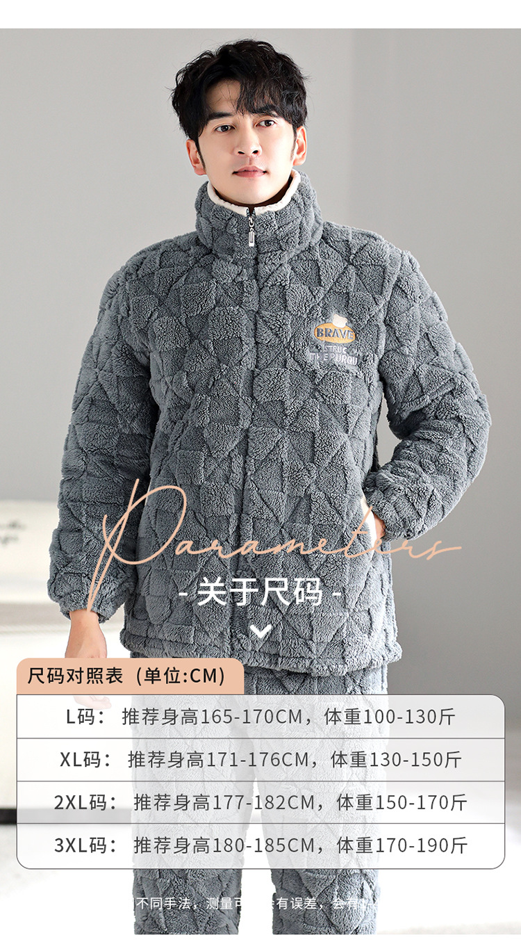 Pijama de hombre invierno de lana de coral tres capas de algodón intercalado grueso y chaqueta de lana de algodón calentamiento conjunto de ropa para el hogar de franela