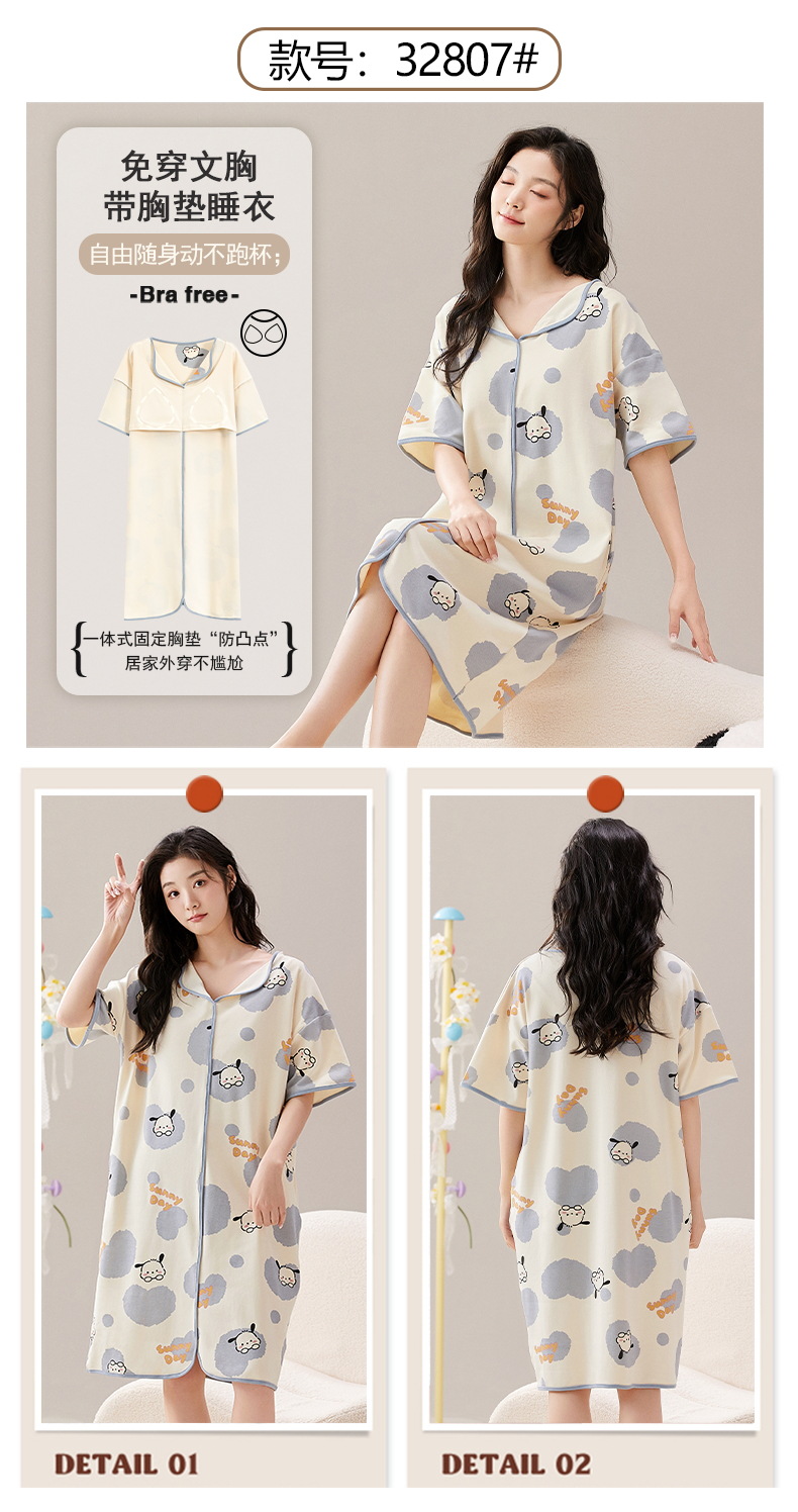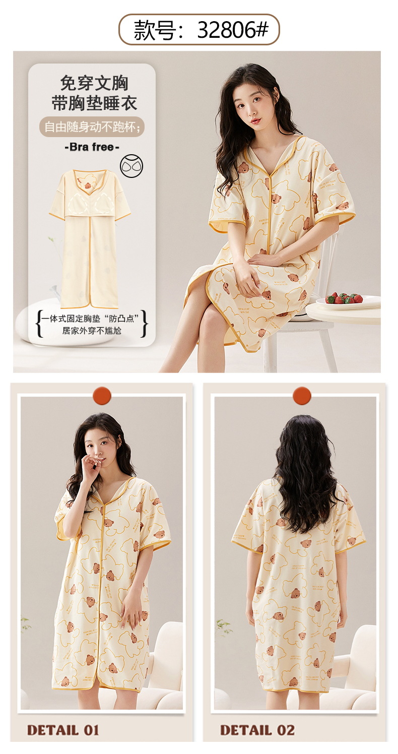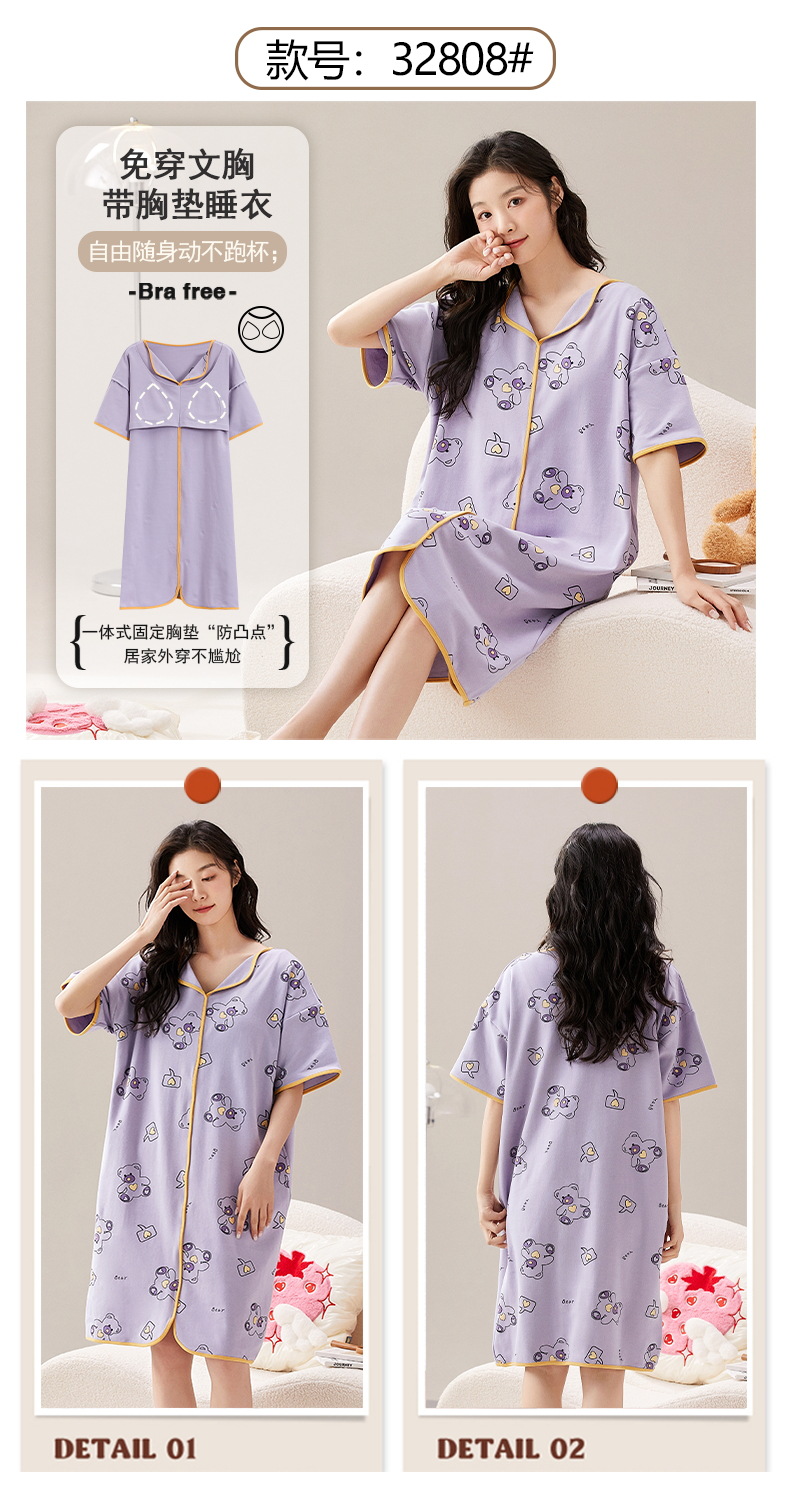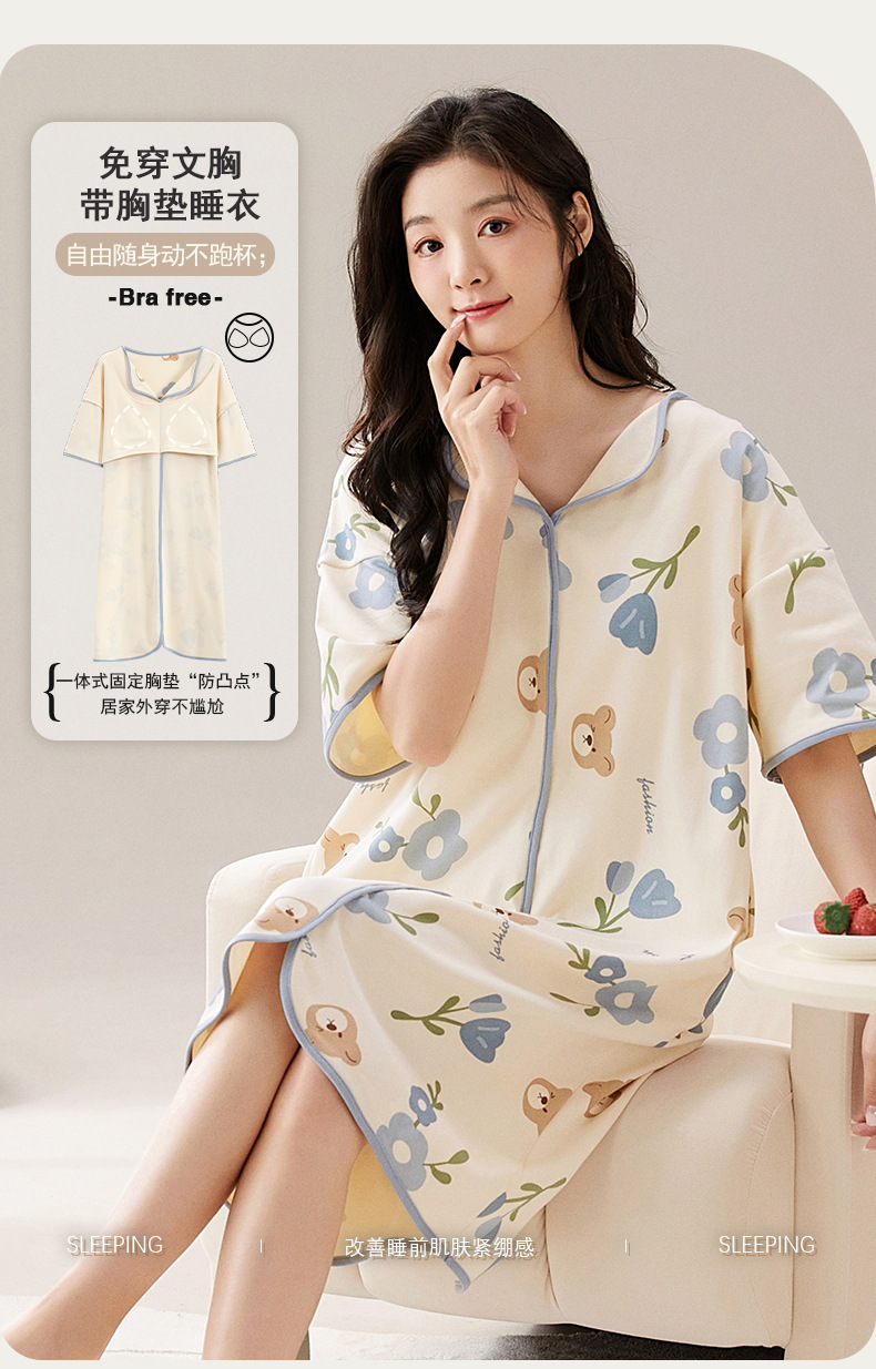 Camisón de verano con almohadilla en el pecho de las mujeres de manga corta suelta pijamas de las mujeres ocasionales prendas de vestir exteriores de algodón de dibujos animados de las mujeres homewear