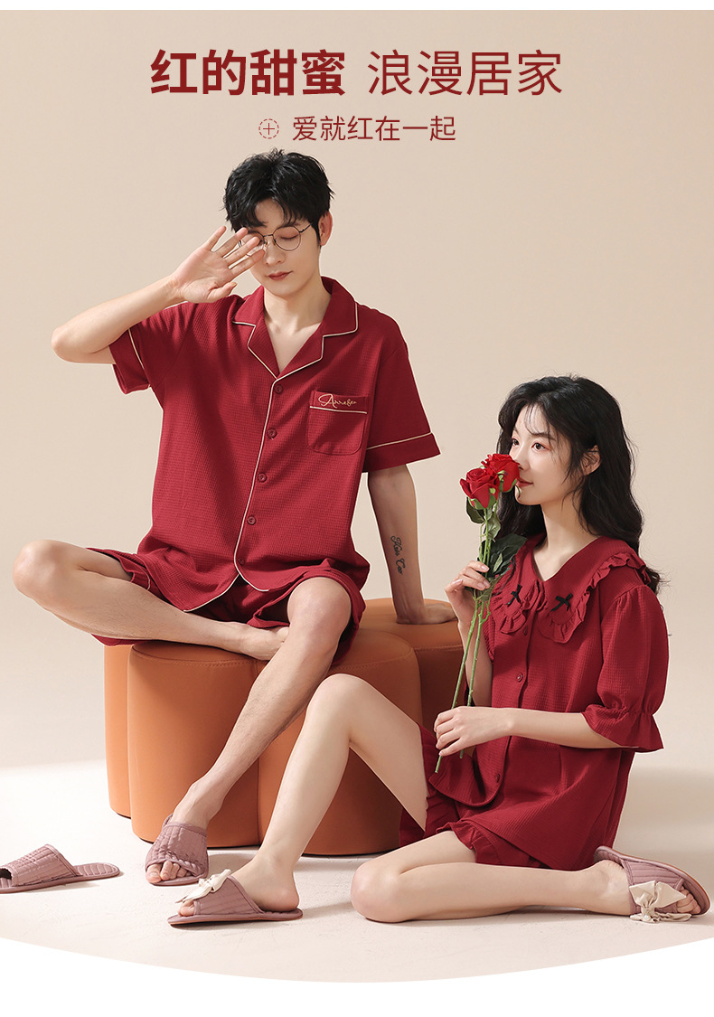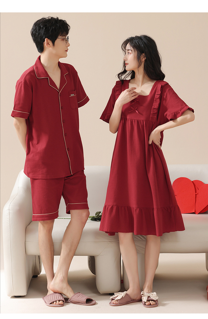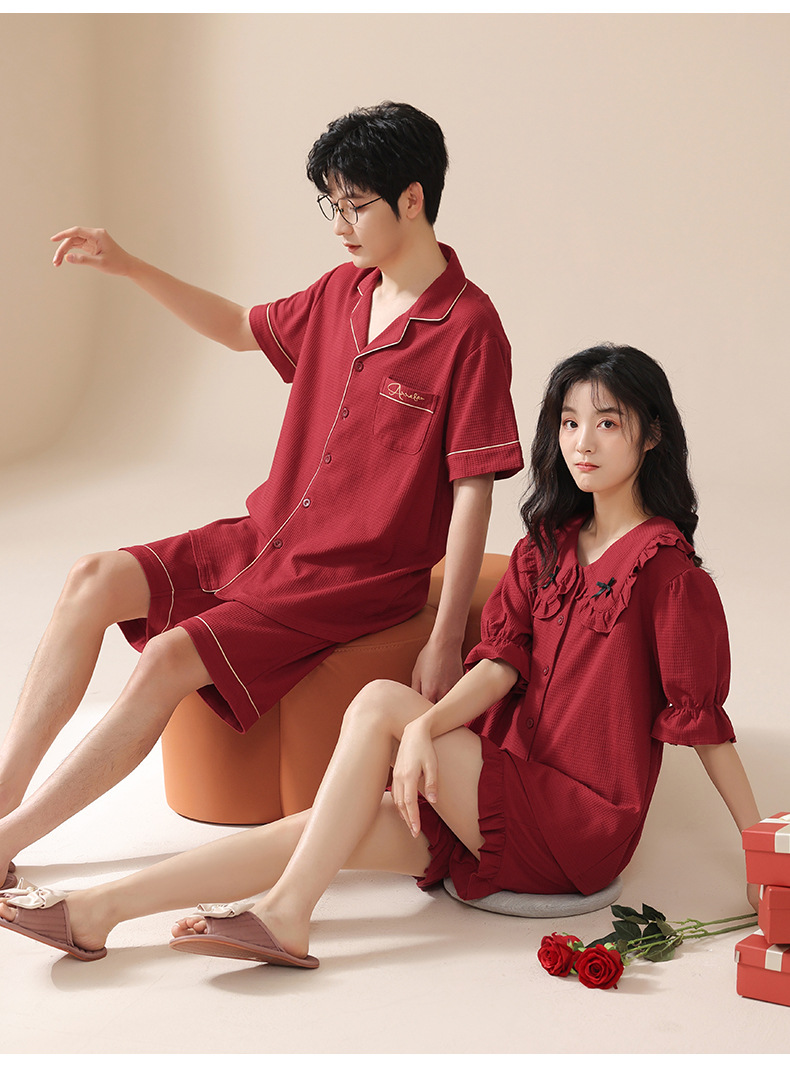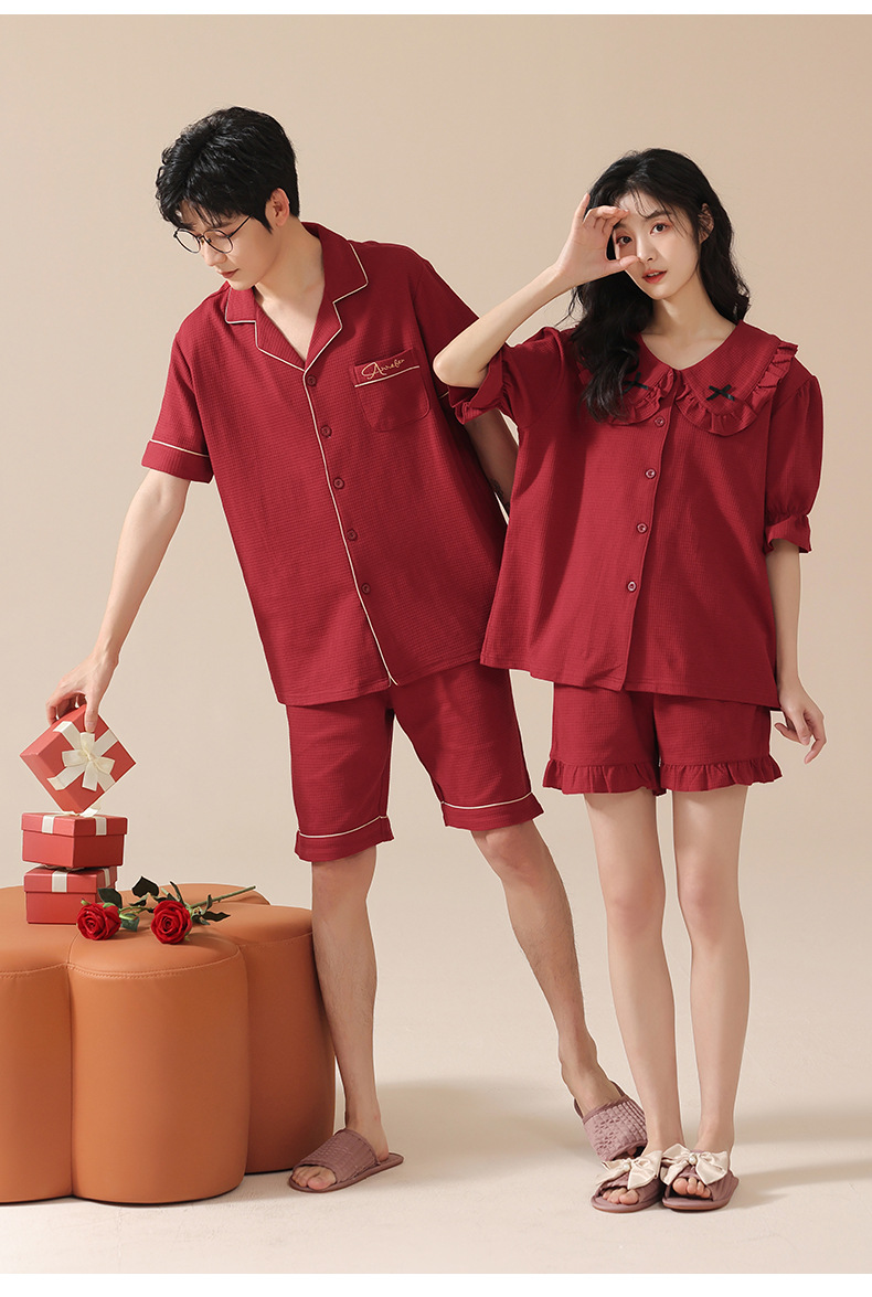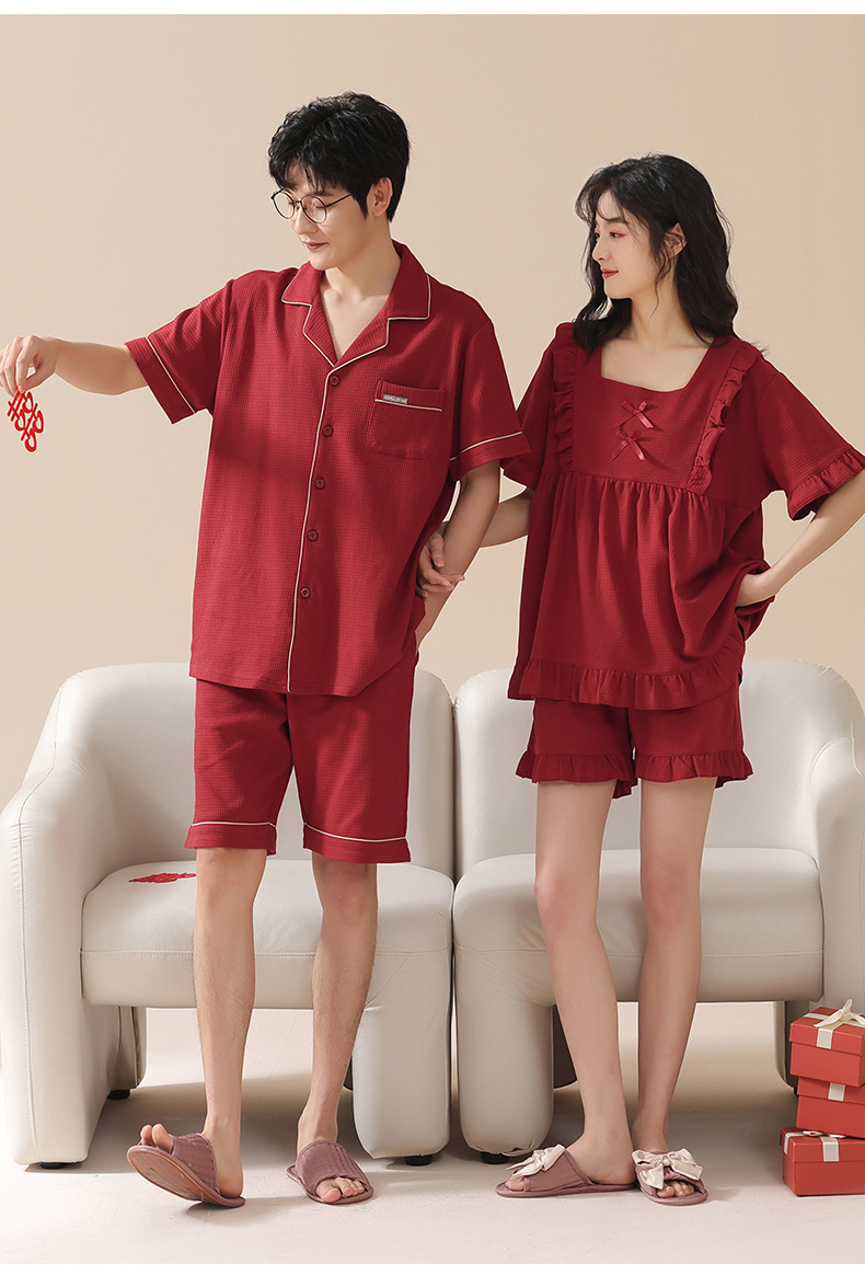 2023 verano nueva pareja pijamas de algodón de manga corta waffle camisón de las mujeres boda roja homewear hombres