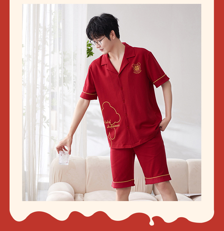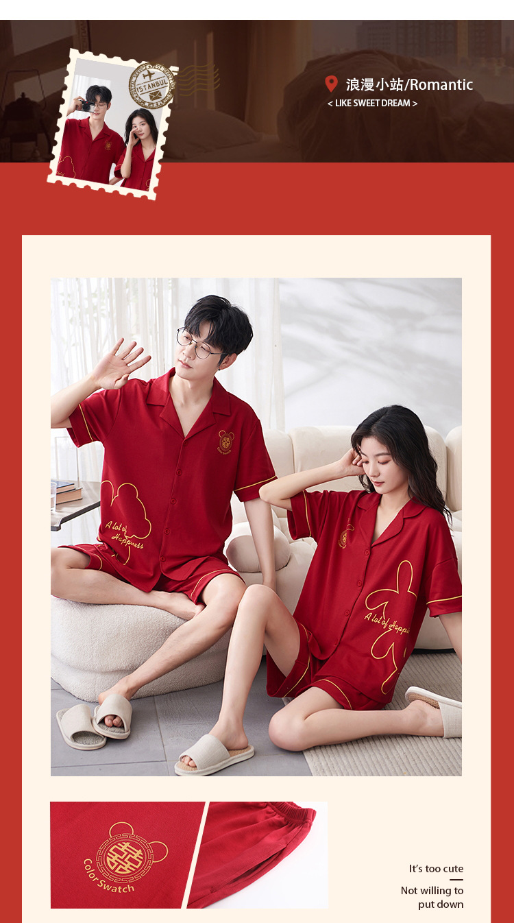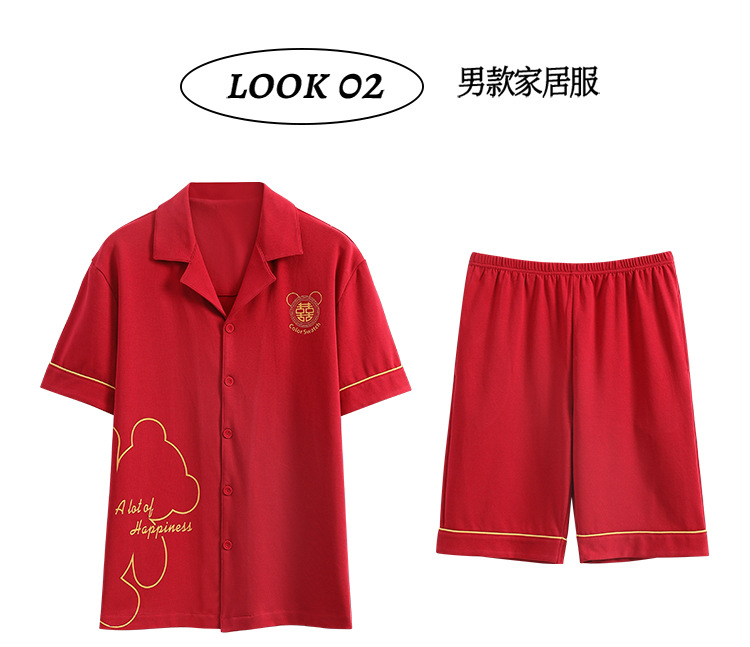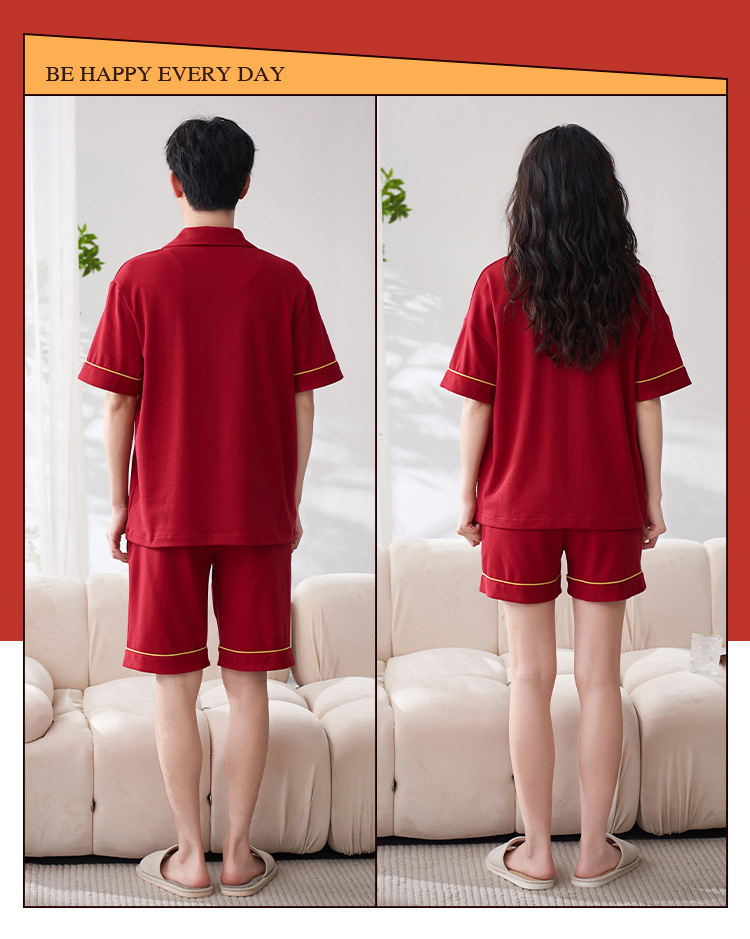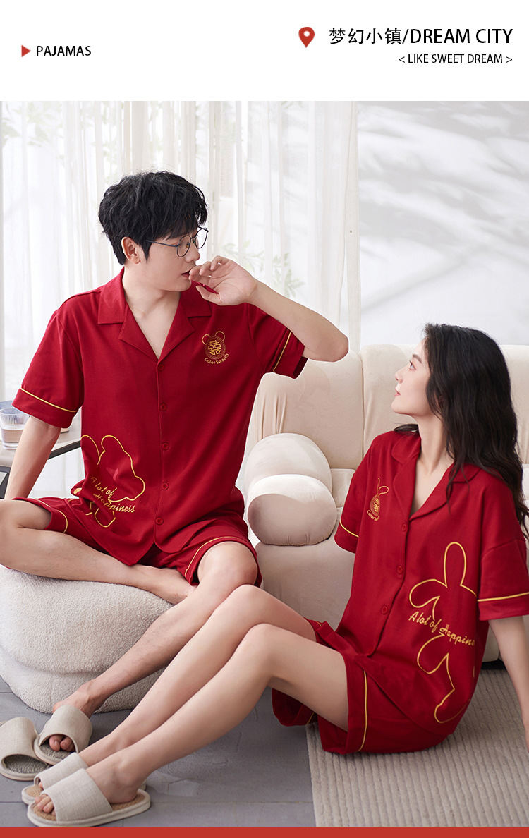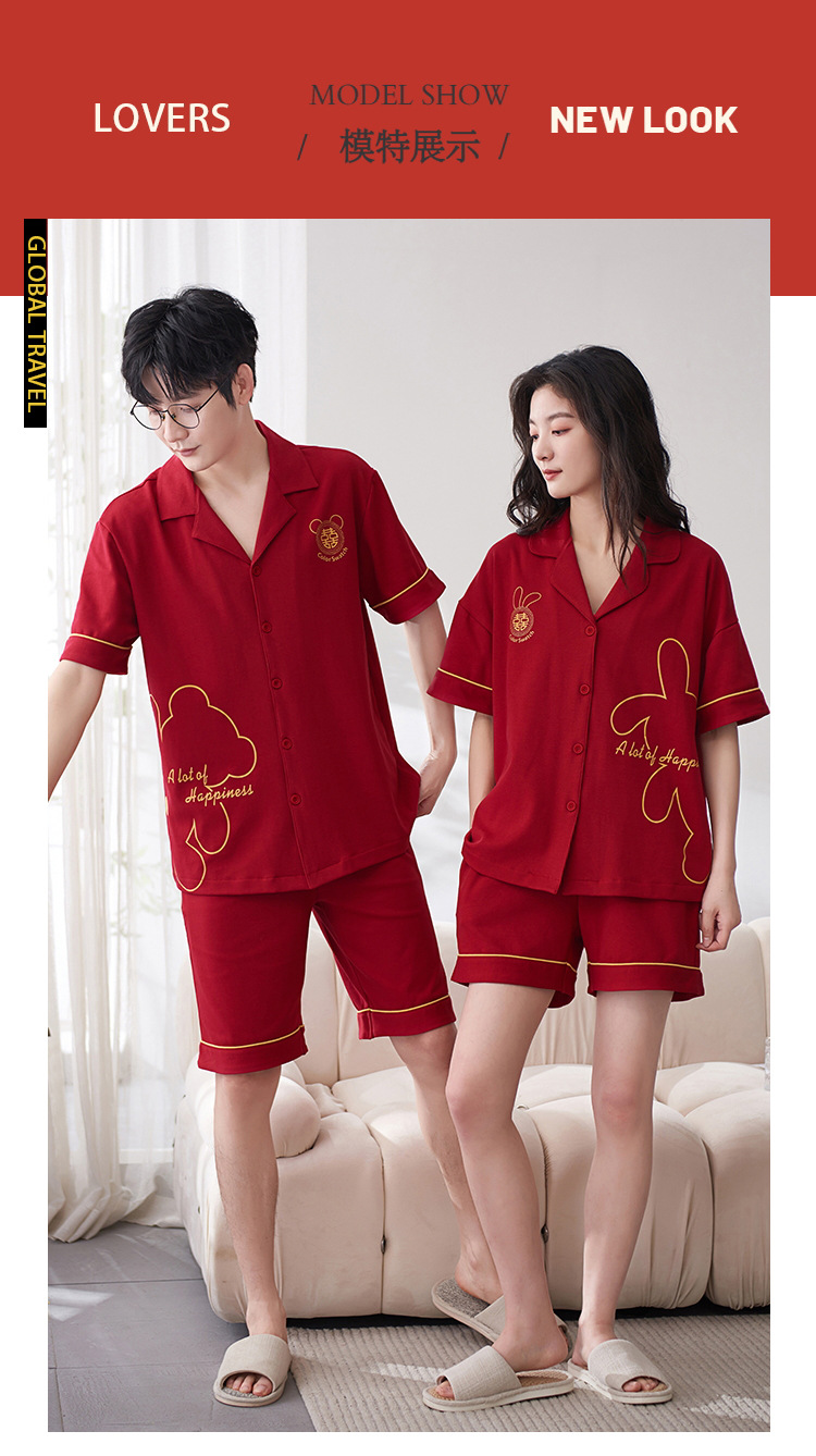 Pareja de verano pijamas de algodón de las mujeres de la boda traje rojo solapa año de nacimiento de algodón manga corta desgaste del hogar de Los Hombres