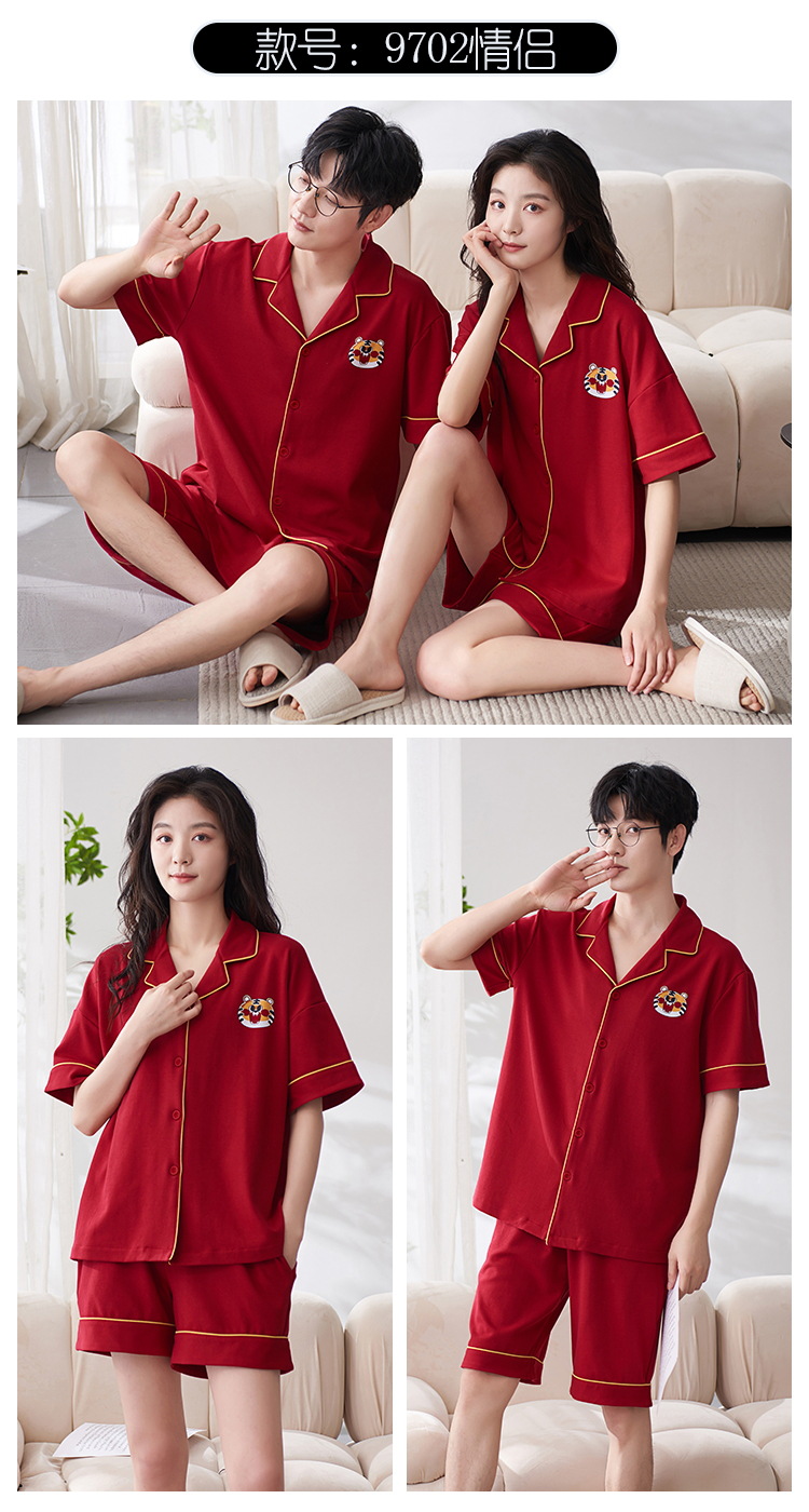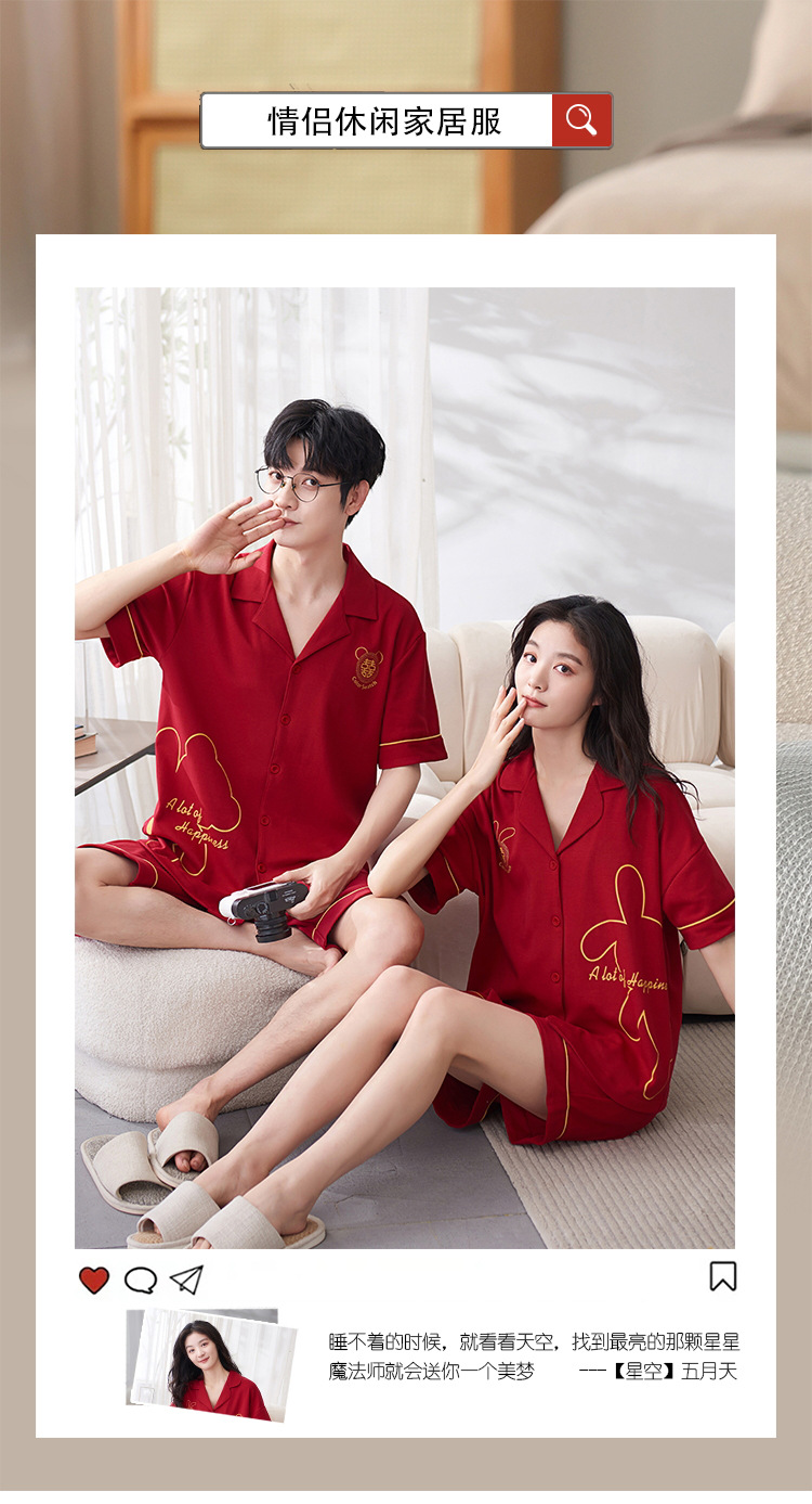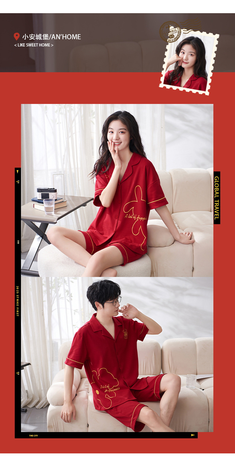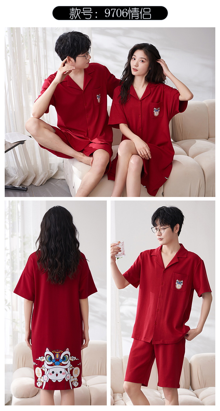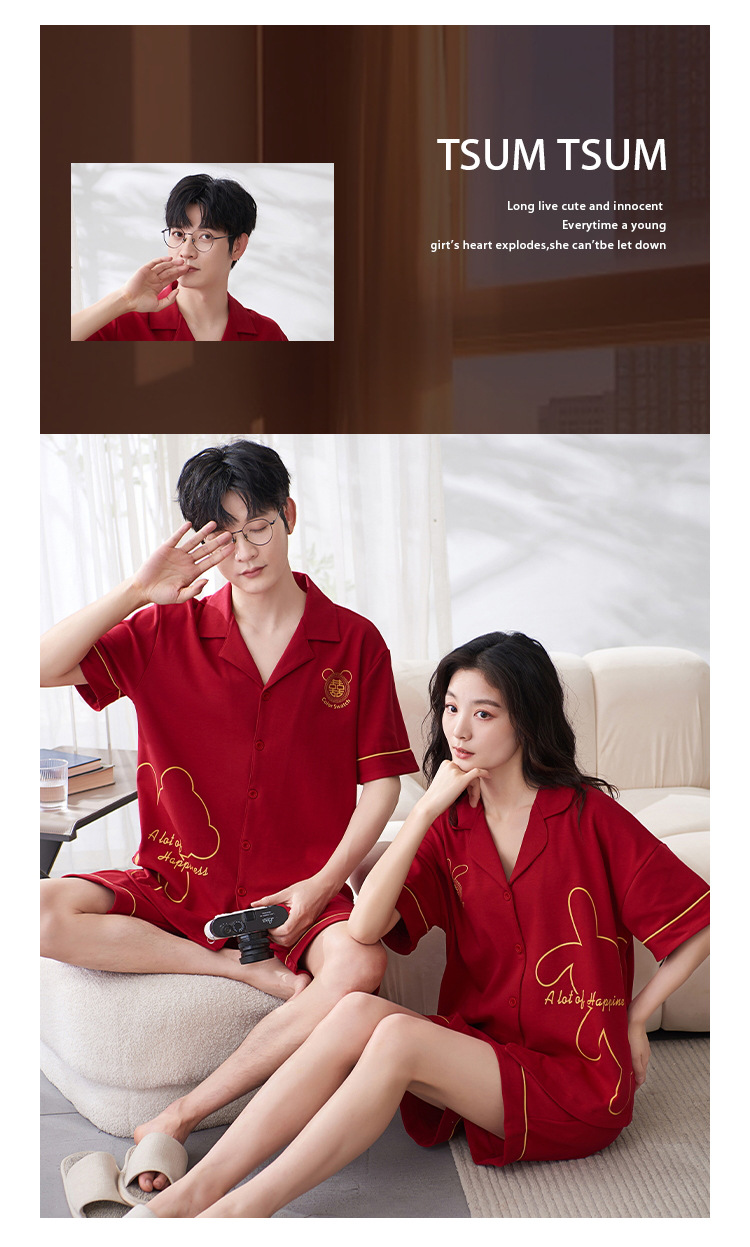 Pareja de verano pijamas de algodón de las mujeres de la boda traje rojo solapa año de nacimiento de algodón manga corta desgaste del hogar de Los Hombres