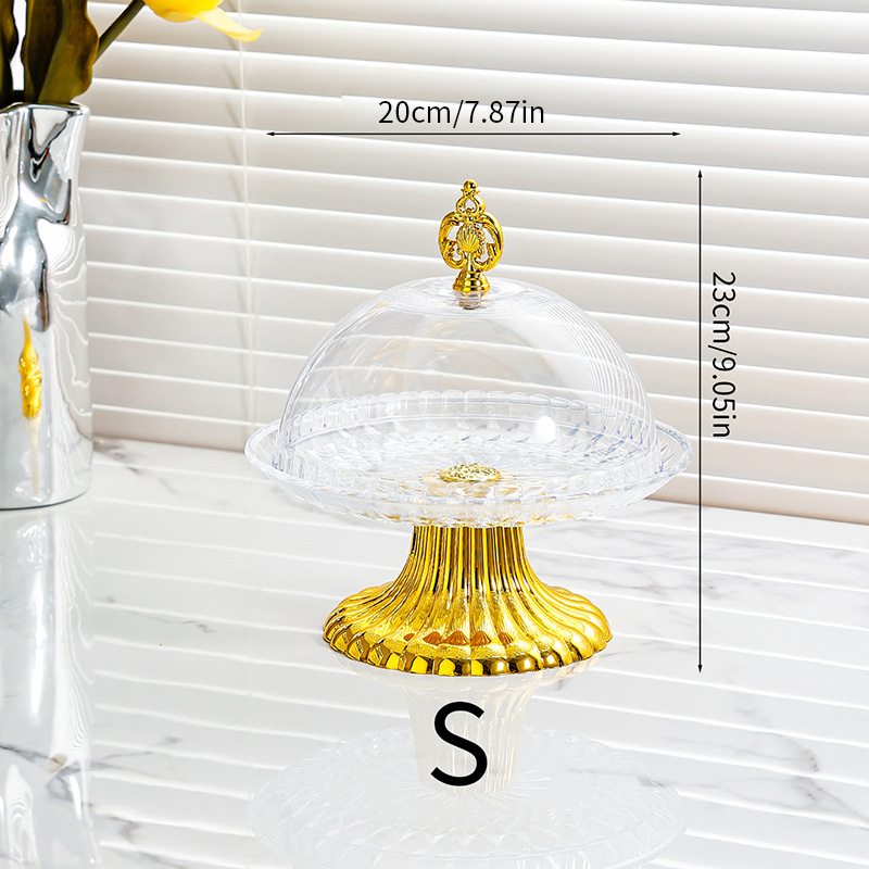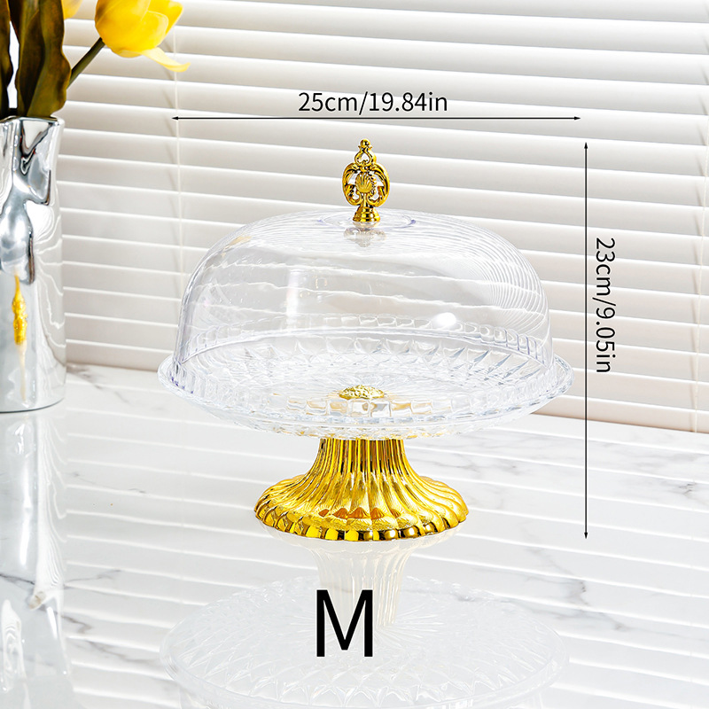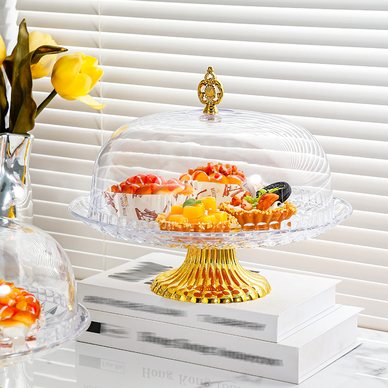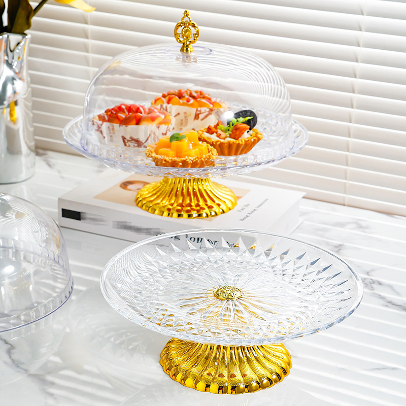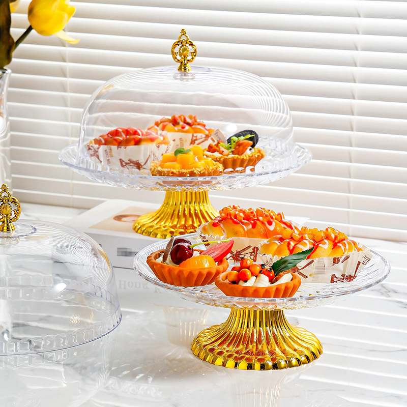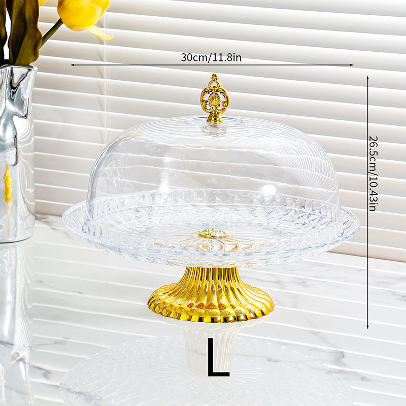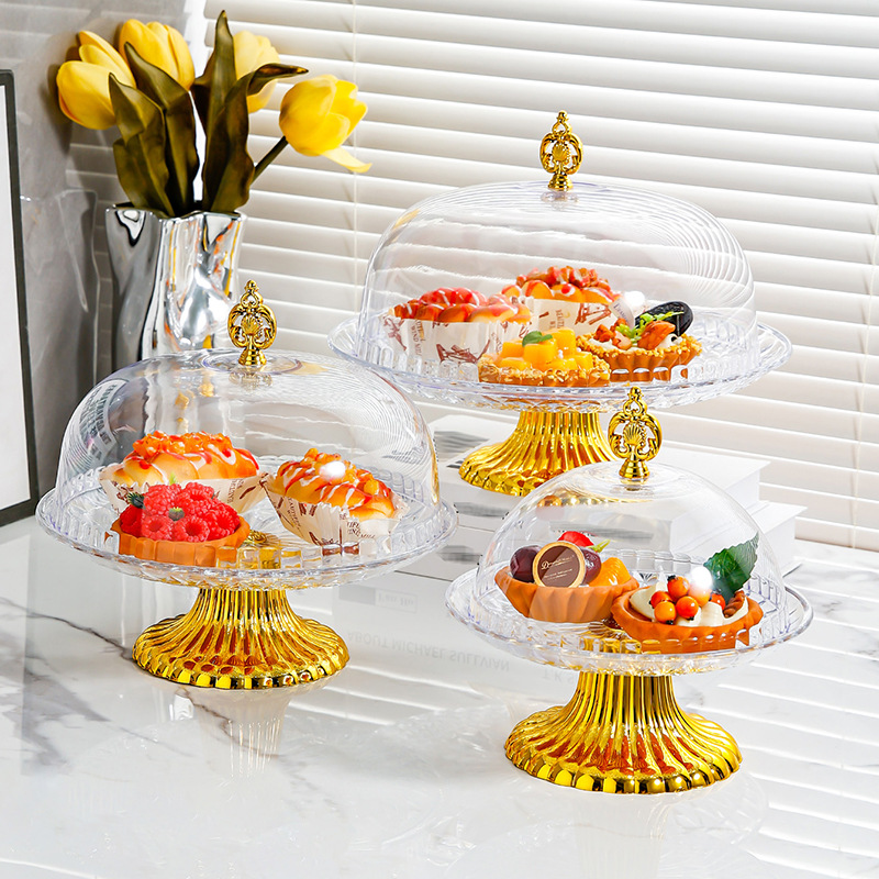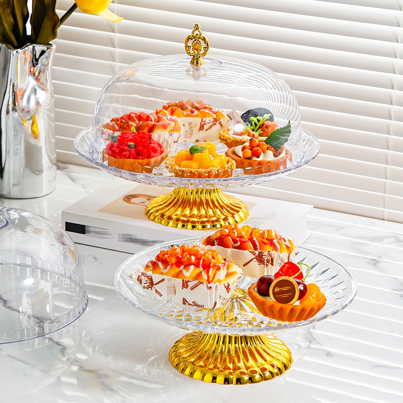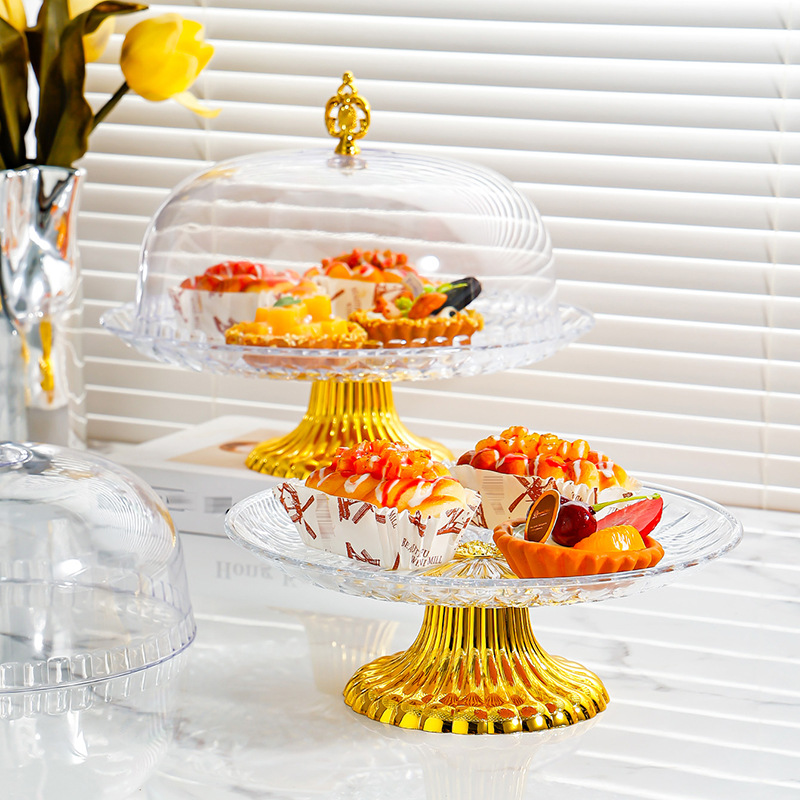 Bandeja de pastel redonda de plástico transparente de estilo europeo, mesa de exhibición de postres, bandeja de postre de fruta de pie alto creativo, adornos con tapa
