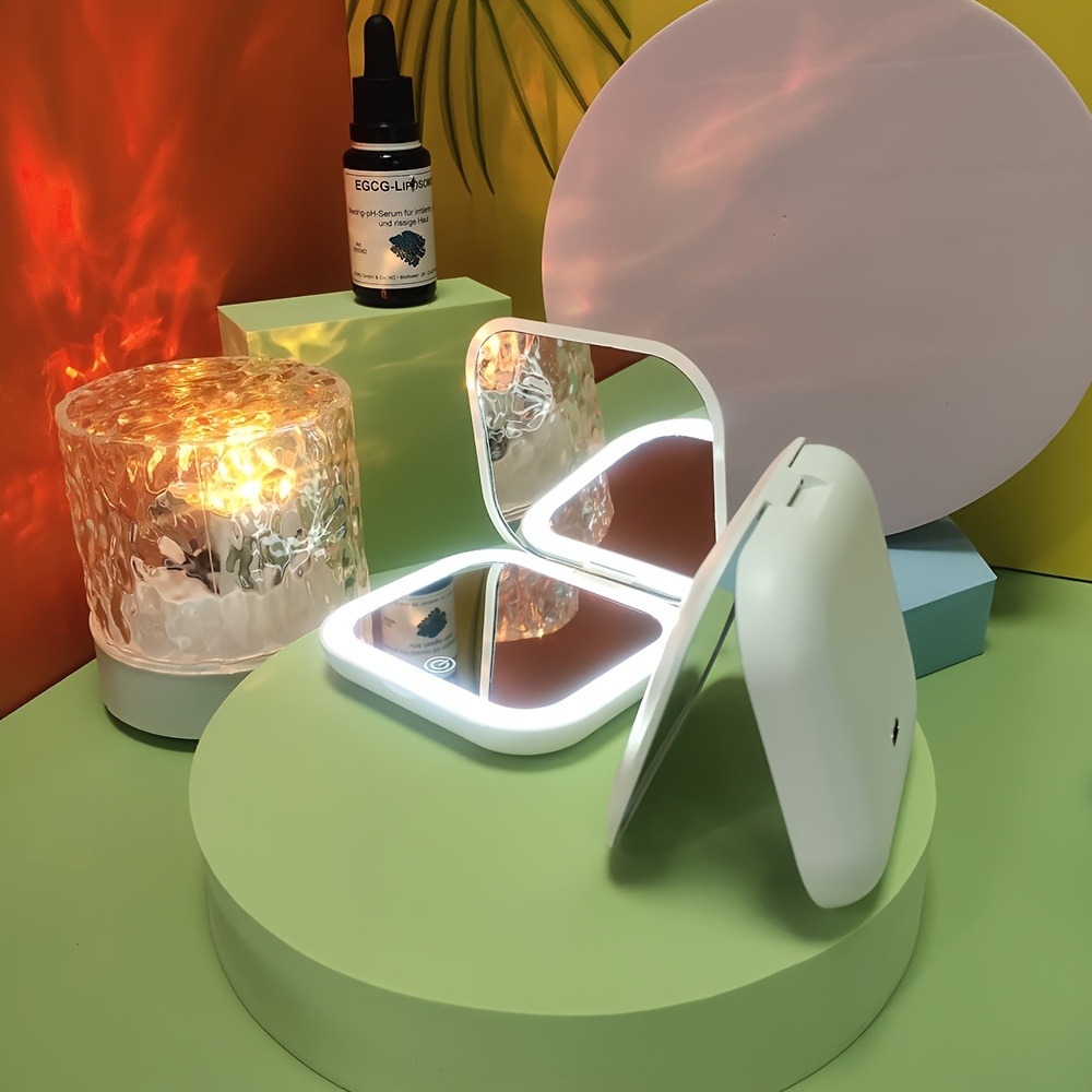 Venta directa de fábrica Espejo de maquillaje Regalo portátil Espejo de maquillaje de mano plegable con luz de carga Modelo avanzado transfronterizo