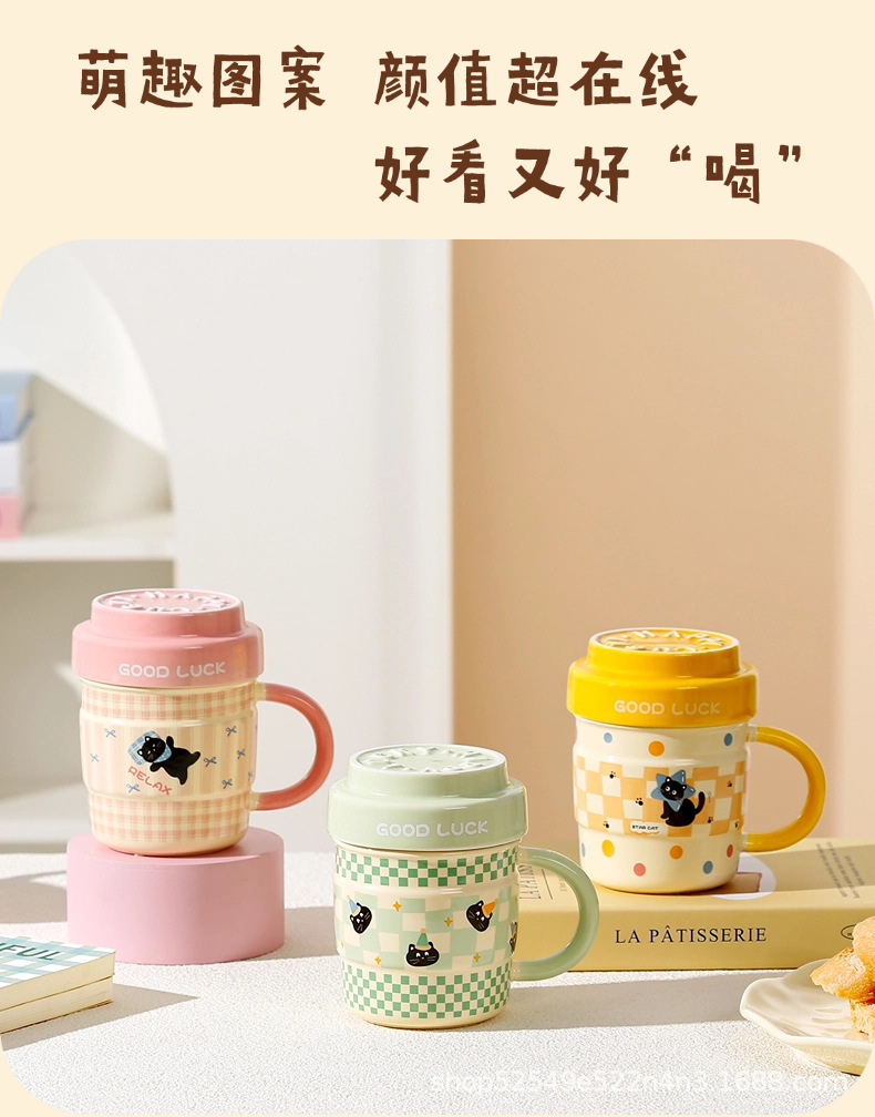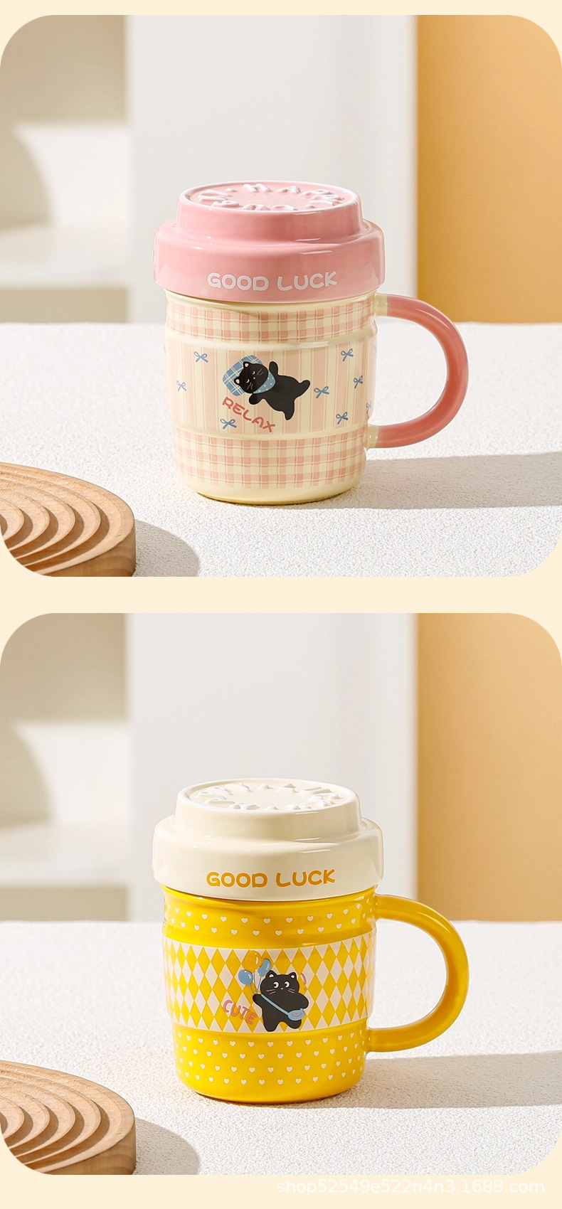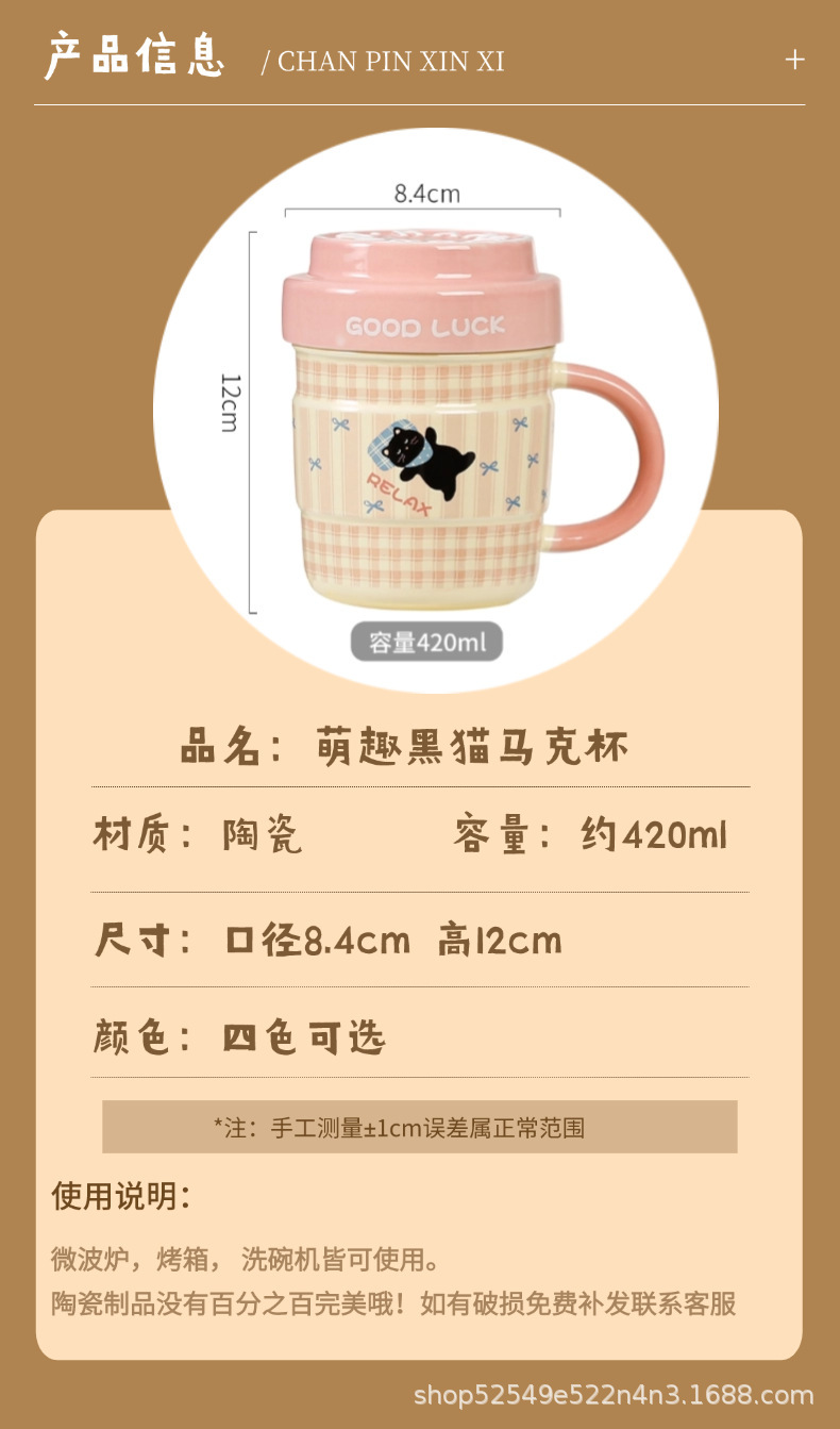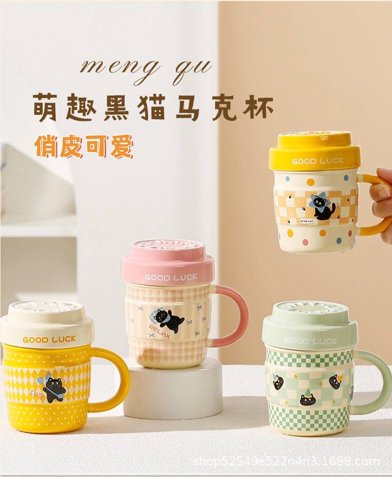 Taza de cerámica de alto valor con tapa de caricatura gato negro taza de regalo de cumpleaños regalo de mano taza de agua bebida pareja de oficina