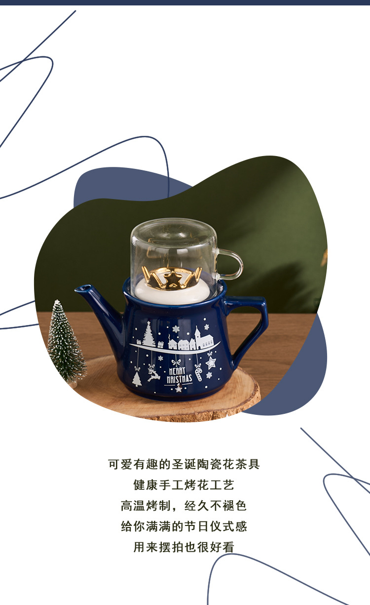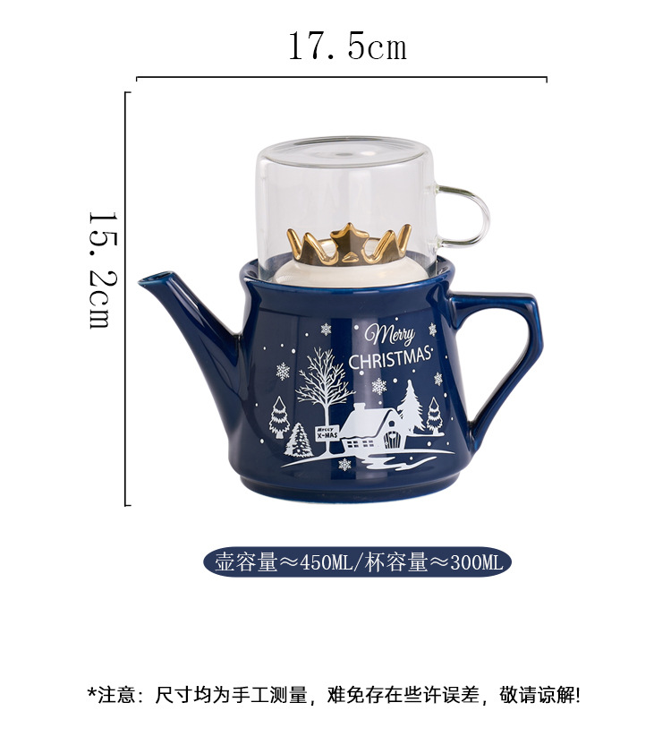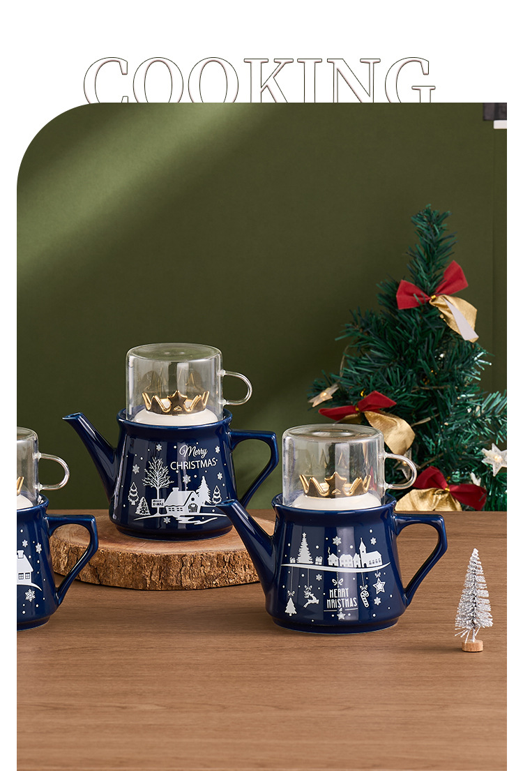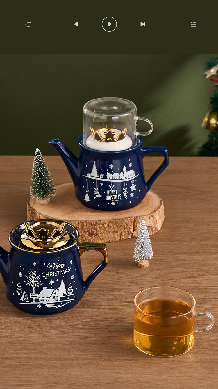 | Color | Un juego de té navideño de nieve en una olla simple y un juego de té navideño de nieve en una olla dorada. |