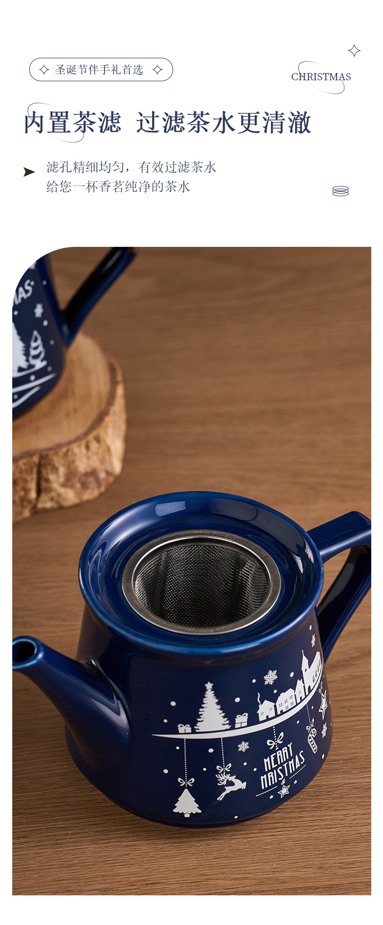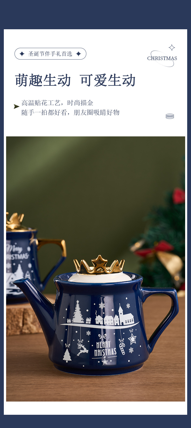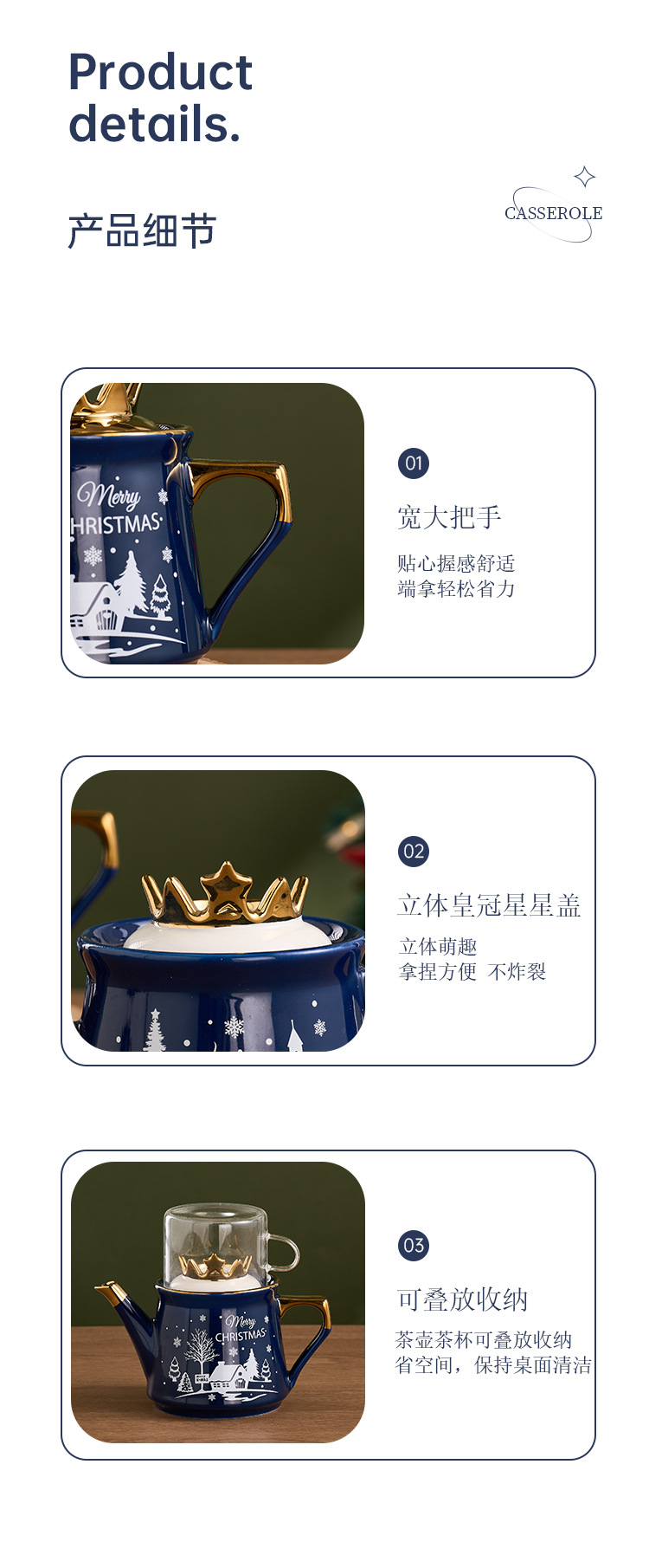 | Color | Un juego de té navideño de nieve en una olla simple y un juego de té navideño de nieve en una olla dorada. |