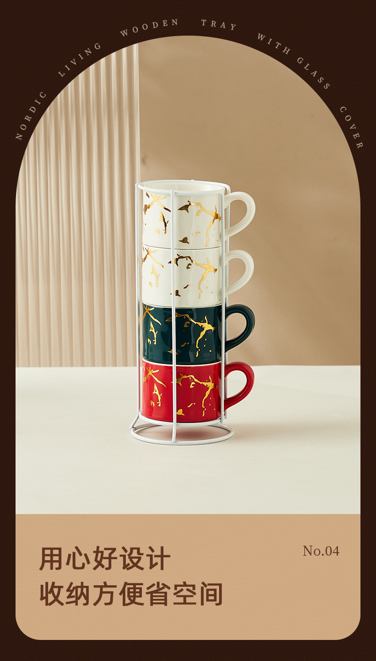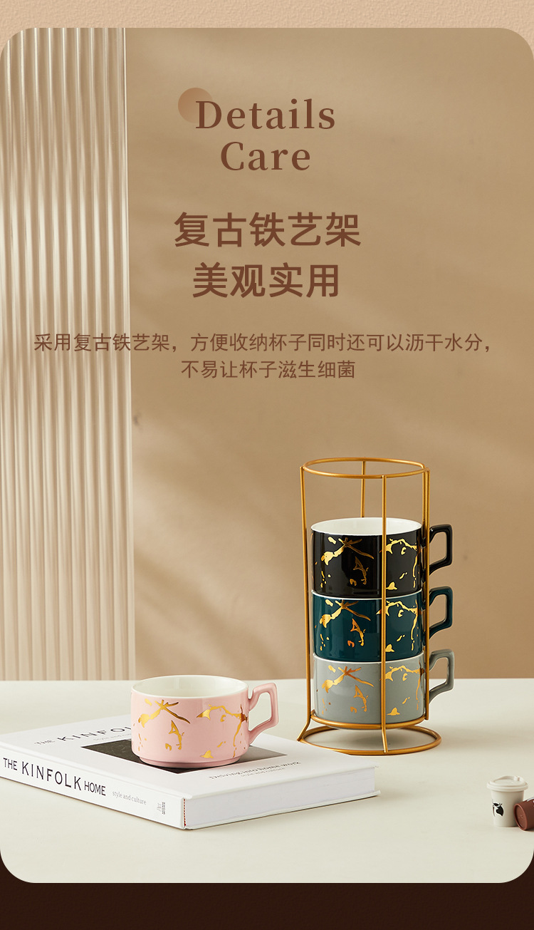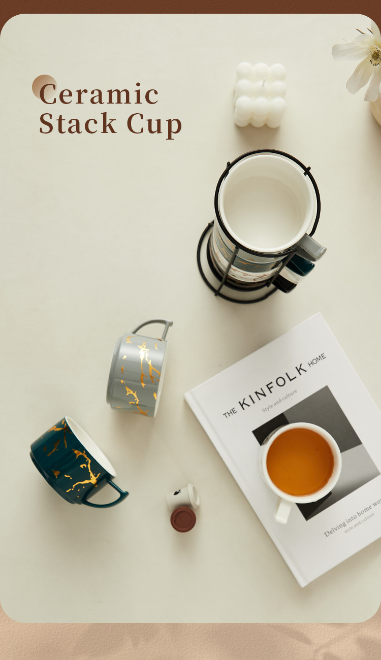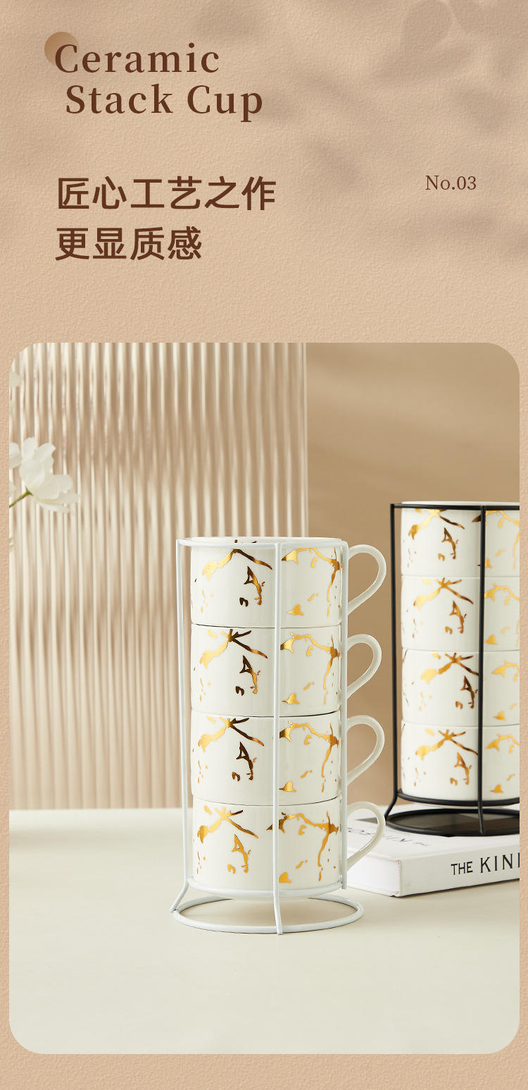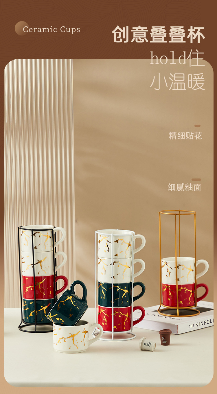 Creativo dorado Taza de cerámica taza hogar tridimensional apilada taza de cuatro piezas con marco de hierro taza de agua de café