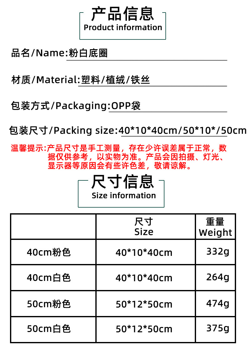 | Tamaño | R1 - 1 / 30cm blanco, R1 - 2 / 40cm blanco, R1 - 3 / 50cm blanco, H1 - 22 / 30cm rosa, H3 - 22 / 40cm rosa, H3 - 23 / 50cm rosa |