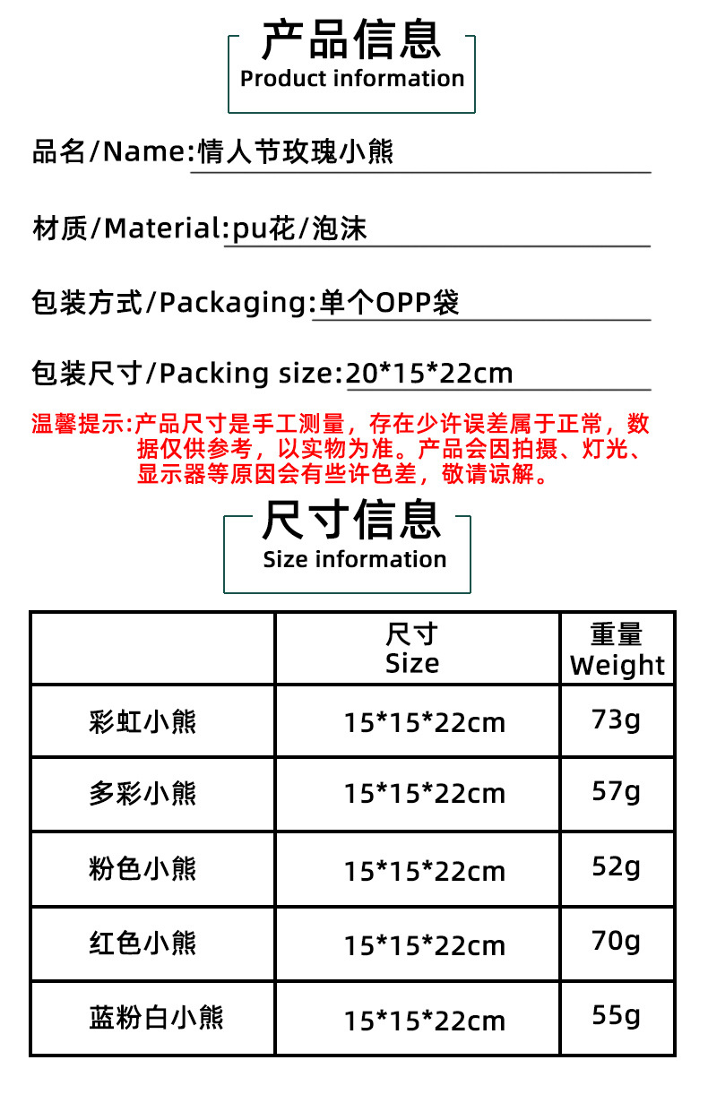 | Color | Oso arcoíris G3 - 31, oso rosa azul G3 - 33, oso colorido m3 - 34, oso rosa m3 - 35, Oso rojo m3 - 36 |
