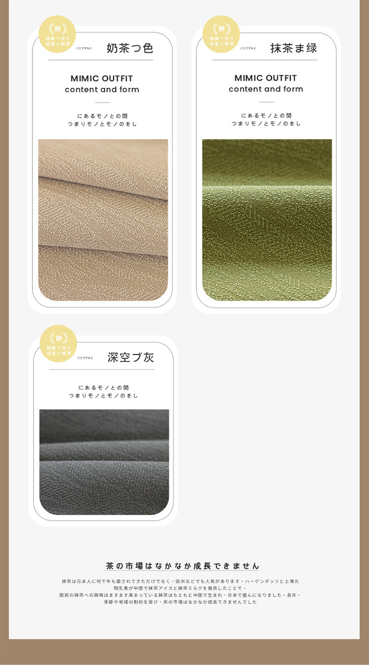 | Color | [color del té con leche] engrosamiento - algodón shuifu, [verde matcha] engrosamiento - algodón shuifu, [gris azulejo] engrosamiento - algodón Shuifu |