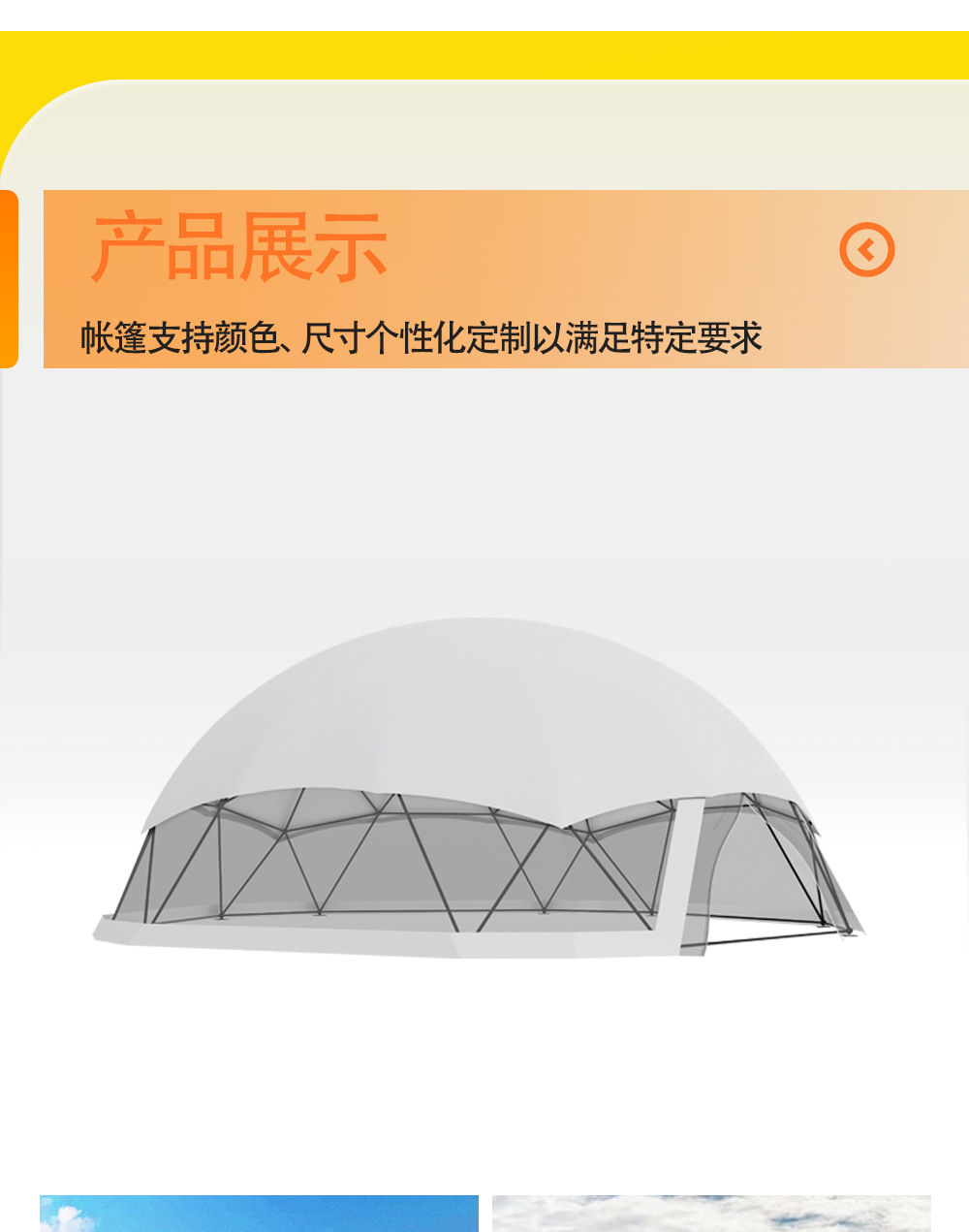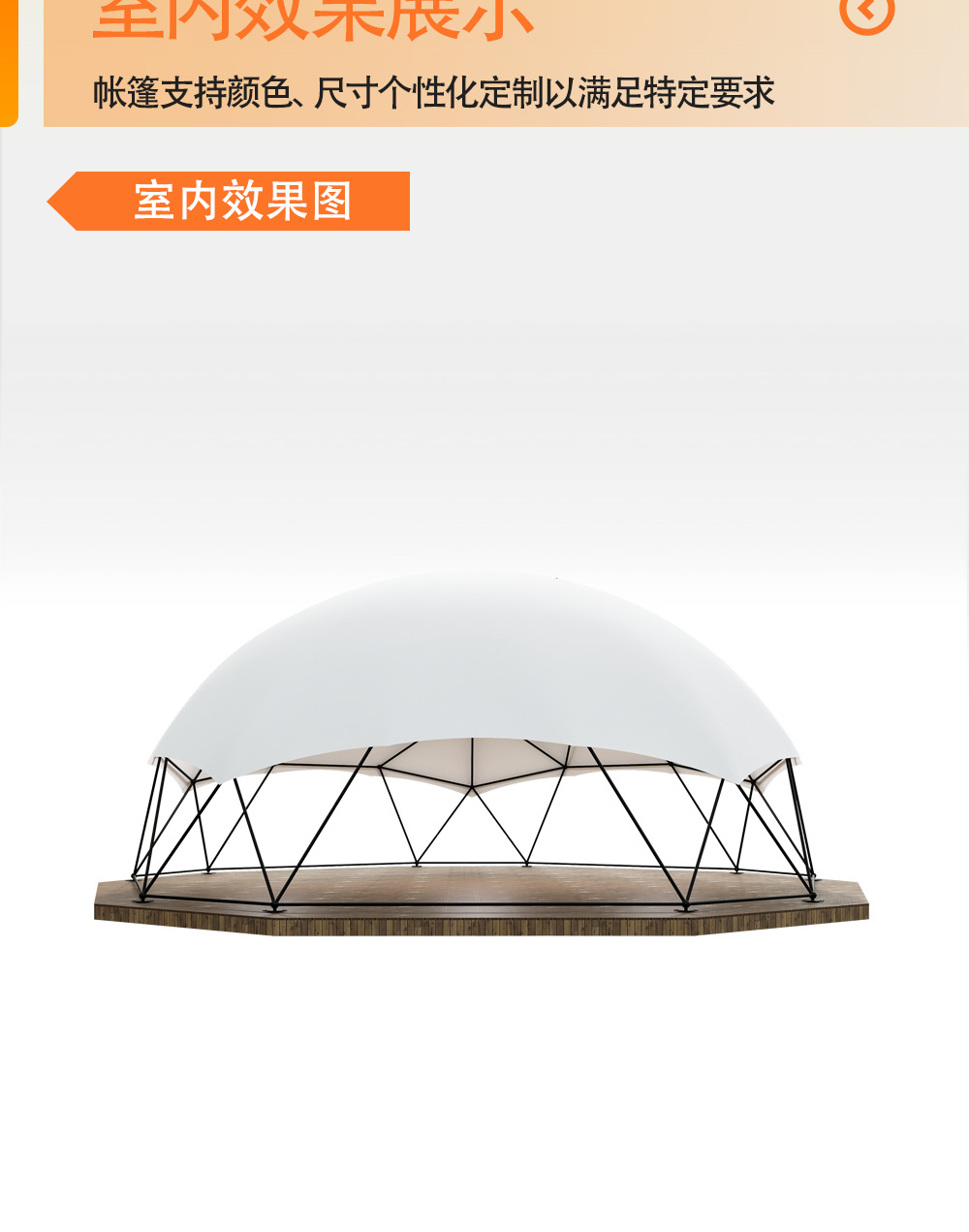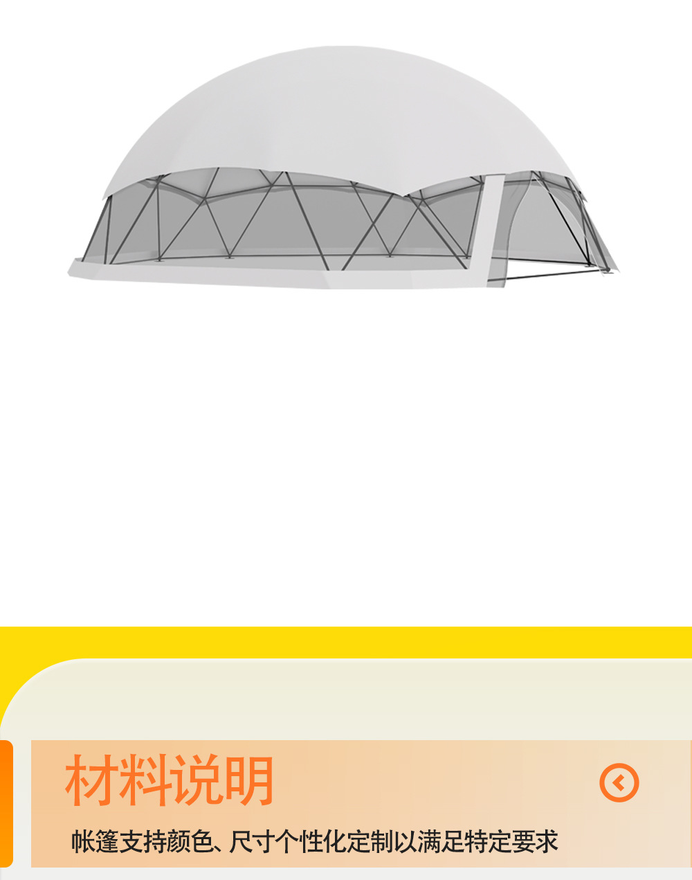 TamañoDiámetro 12,5 m (incluido el recinto transparente extraíble), 1,5 * 1,5 m / plataforma de la tienda de campaña