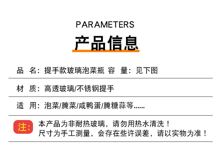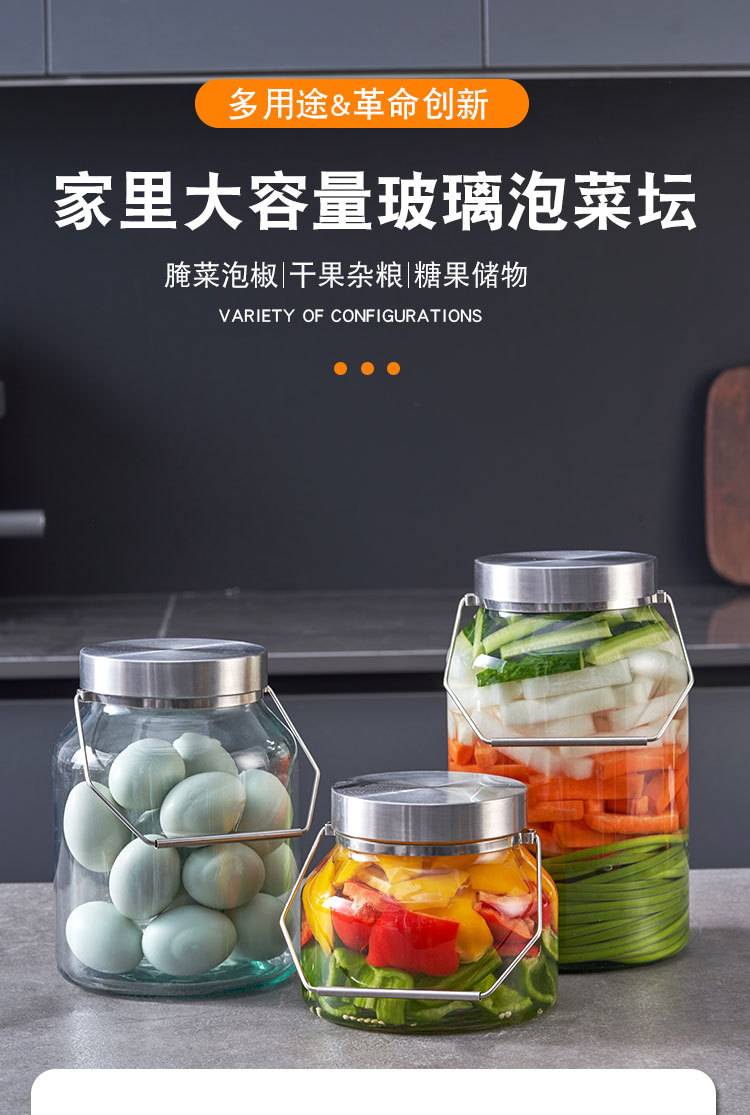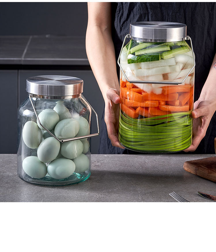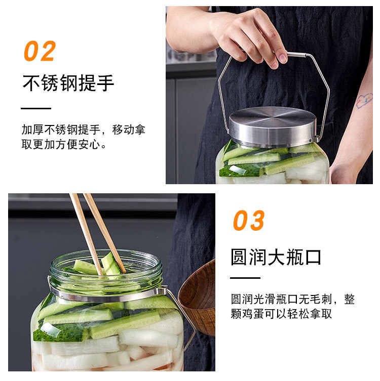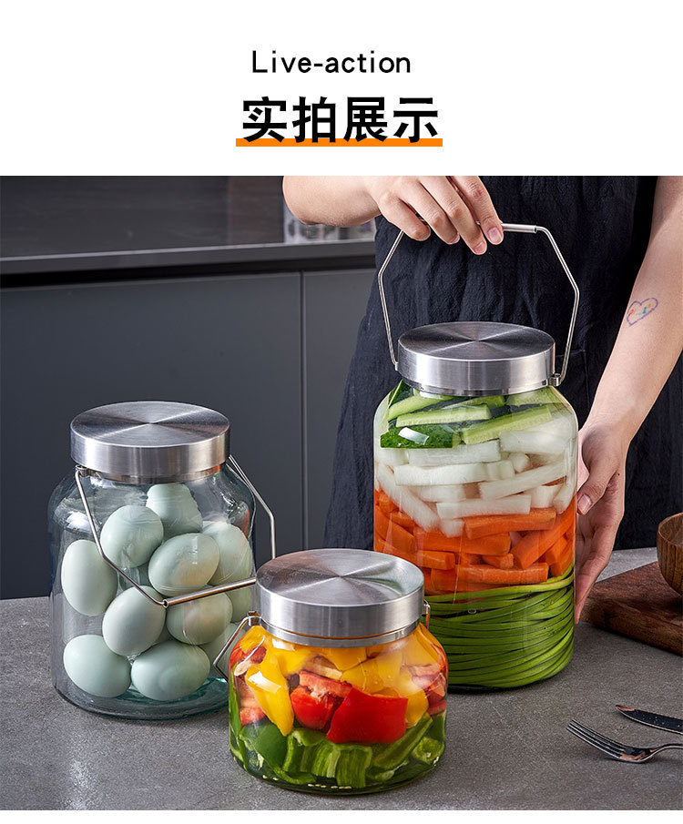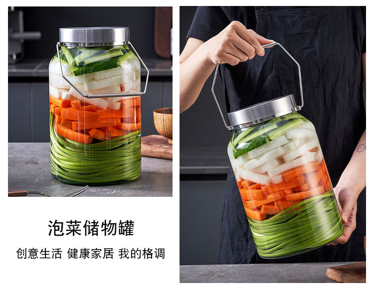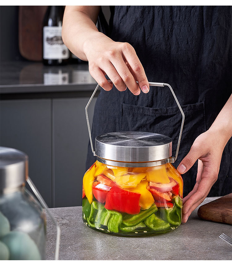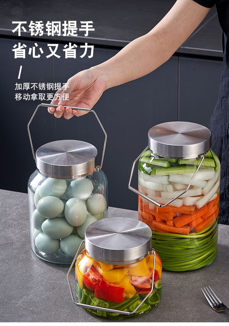 Pot de pepinos de vidrio con mango de transporte para cocina doméstica de grado alimenticio encurtido depósito de pickles
