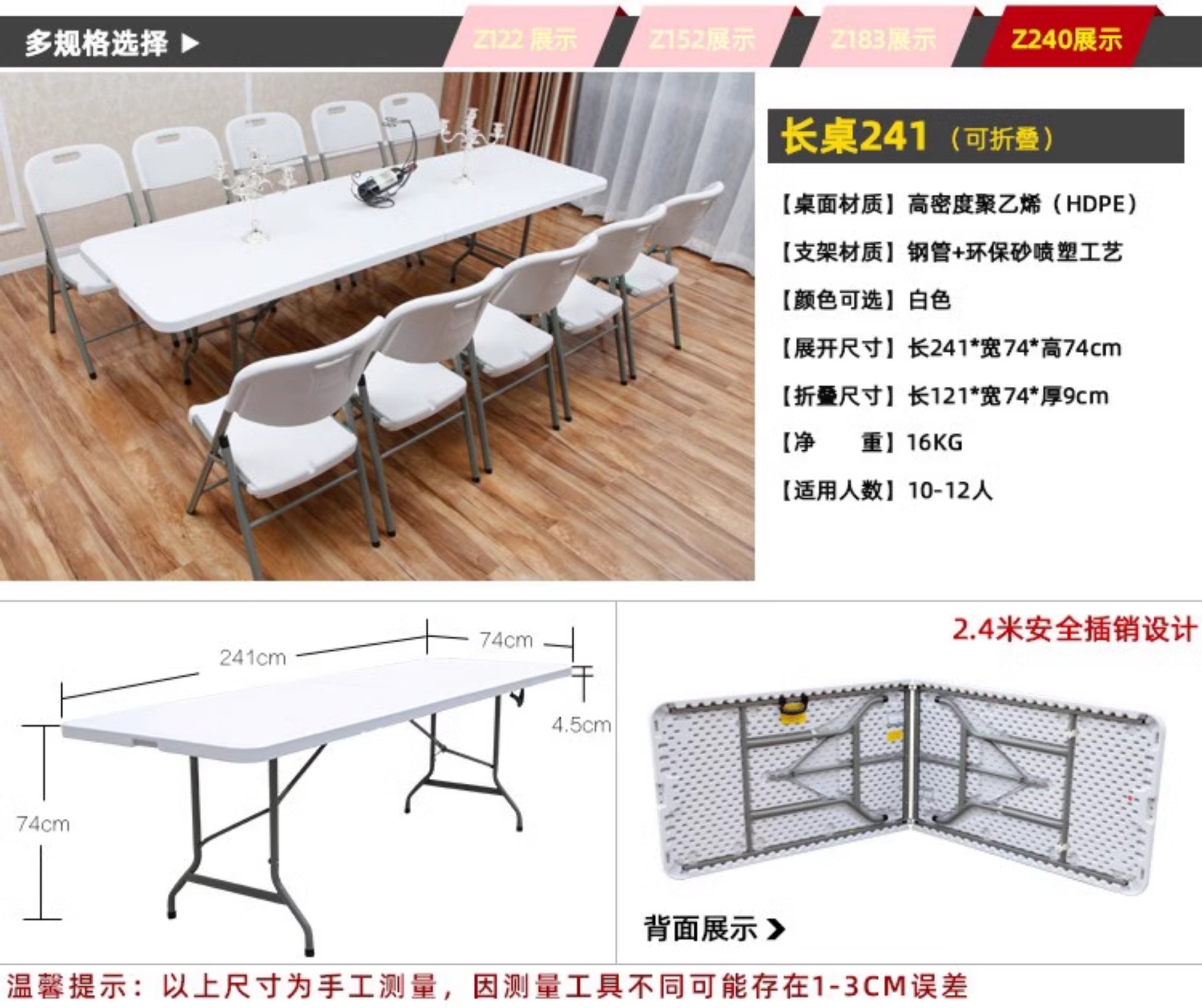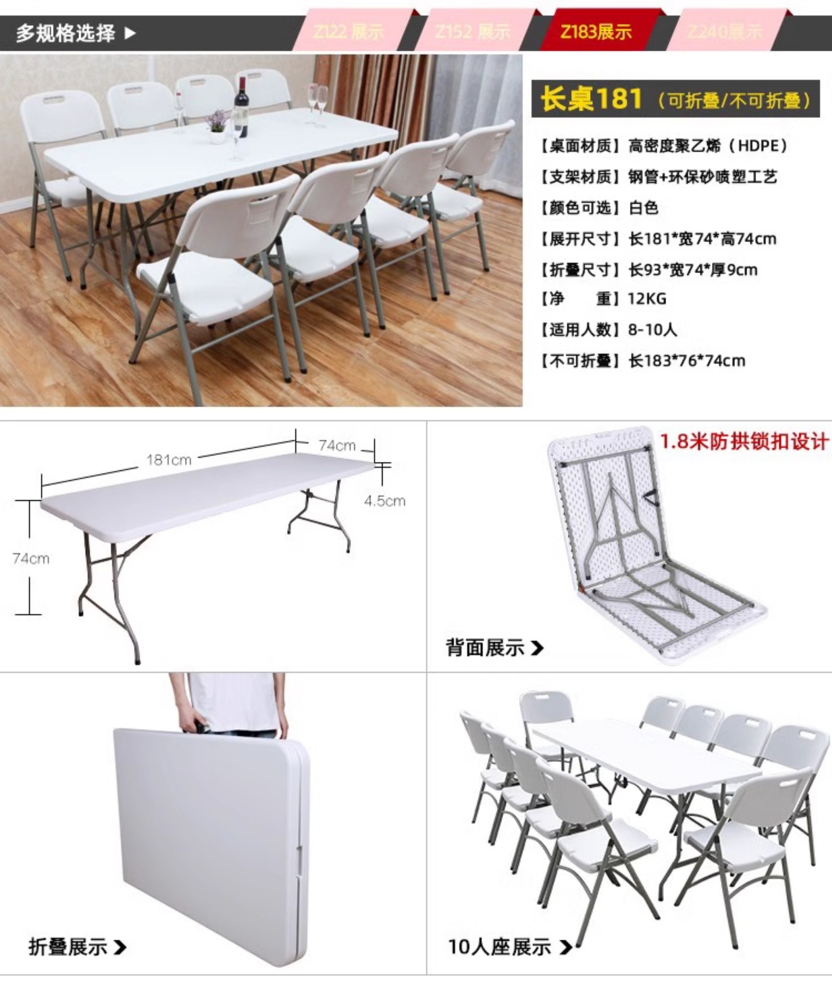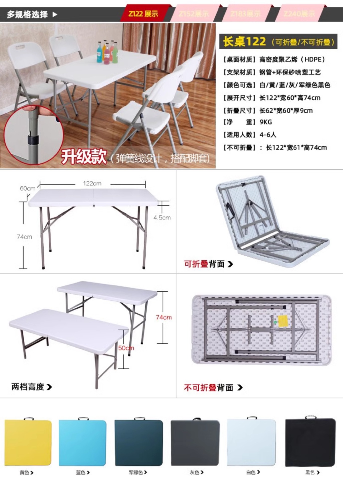 | Color | Las piernas blancas de la mesa blanca de 1,2 metros son completamente blancas, las piernas blancas de la mesa plegable telescópica de 1,36 metros de altura son todas blancas, la mesa blanca de la mesa plegable telescópica de 1,2 metros de largo no se dobla, la mesa blanca de la mesa plegable telescópica de 1,2 metros de altura es blanca, las piernas negras plegables de 1,2 metros de largo son blancas, las piernas negras plegables de 1,2 metros de largo son grises, las piernas blancas plegables de 1,2 metros de largo son blancas, las piernas blancas plegables de 1,2 metros de largo son verdes, las piernas blancas plegables de 1,5 metros de largo son blancas, las piernas blancas plegables de 1,5 metros de largo son grises, las piernas blancas plegables de 1,5 metros de largo son blancas.con 1,5 metros de largo en blanco no plegable, 1,8 metros de largo en piernas blancas plegables, 1,8 metros de largo en blanco plegable, 1,8 metros de largo en negro plegable, 1,8 metros de largo en azul plegable negro ratán, 1,8 metros de largo en azul plegable, 1,8 metros de largo en gris plegable, 1,8 metros de blanco no plegable, 180 metros de largo en 45 mesas estrechas no plegables, 1,8 metros de largo en grano de madera negra plegable, 1,8 metros de largo en color café plegable ratán, Piernas blancas plegables de 2,4 metros de largo, blancas plegables de 2,4 metros de largo, negras plegables de 2,4 metros de largo, mesas plegables de 1,2 metros + 2 taburetes redondos (blancos), mesas plegables de 1,2 metros + 2 taburetes traseros (blancos), mesas plegables de 1,2 metros + 4 taburetes redondos (blancos), mesas plegables de 1,5 metros + 4 taburetes redondos (blancos), mesas plegables de 1,5 metros + 6 taburetes redondos (blancos), mesas plegables de 1,5 metros + 4 taburetes traseros (blancos), mesas plegables de 1,5 metros + 4 taburetes traseros (blancos), mesas plegables de 1,5 metros + 4 taburetes plegables de 1,5 metros (blancos), sillas plegables de 1,5 metros + 6 taburetes plegables (blancos), sillas traseras (blancos), 1,8 mesa plegable de metro + 6 taburetes redondos (blanco), mesa plegable de 1,8 metros + 6 sillas traseras (blanco), mesa plegable de 1,8 metros + 8 taburetes redondos (blanco), mesa plegable de 1,8 metros + 8 sillas traseras (blanco), mesa plegable de 2,4 metros + 8 taburetes redondos (blanco), mesa plegable de 2,4 metros + 8 sillas traseras (blanco) |
