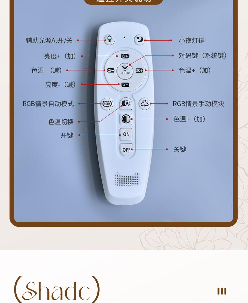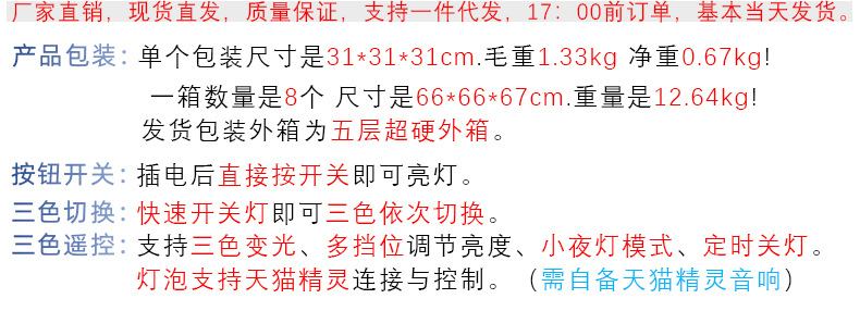 | Especificación | Interruptor de llave 7W-220V (luz cálida),12W-220V (tres colores) atenuación de tres velocidades,12W-220V admite control remoto Tmall Elf (tres colores) + atenuación,12W-Enchufe recto estándar estadounidense (tres colores) cambio de luz de tres velocidades,12W-Enchufe recto estándar europeo (tres colores) cambio de luz de tres velocidades,12W-Interpolación directa británica (tres colores) cambio de luz de tres velocidades |