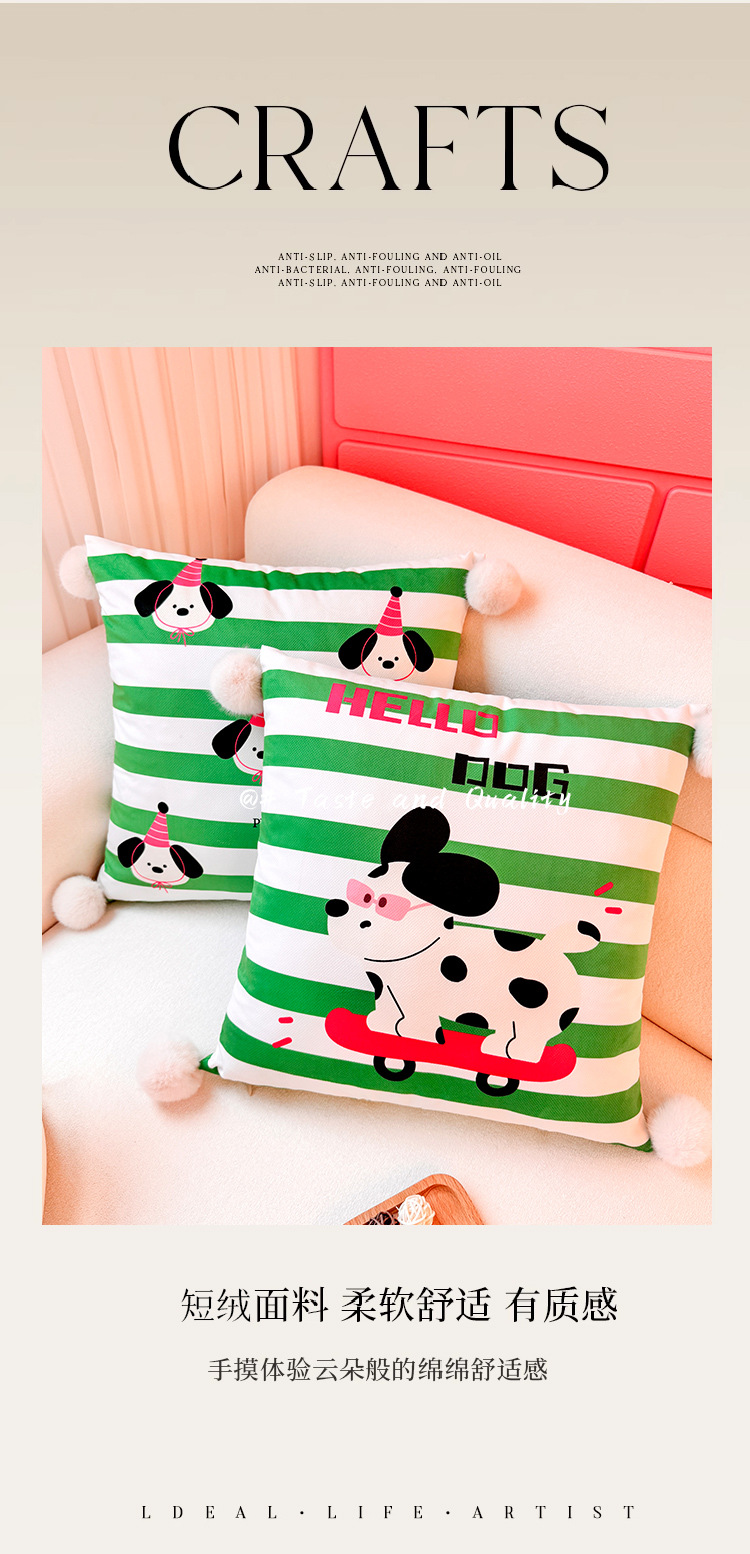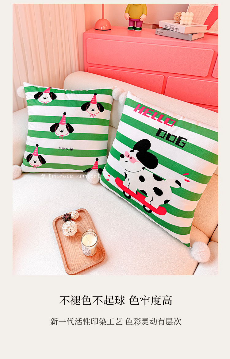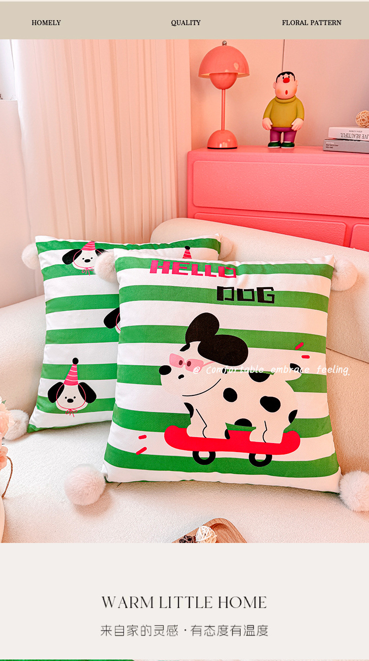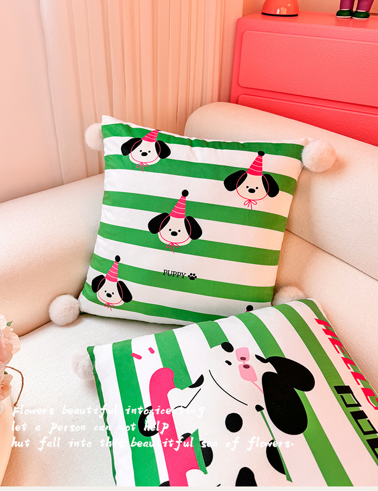 Skateboard Puppy Rayas Almohada verde Funda de almohada Sala de estar Sofá Almohada Impresión de cabecera Almohada de cintura abstracta con bola de pelo