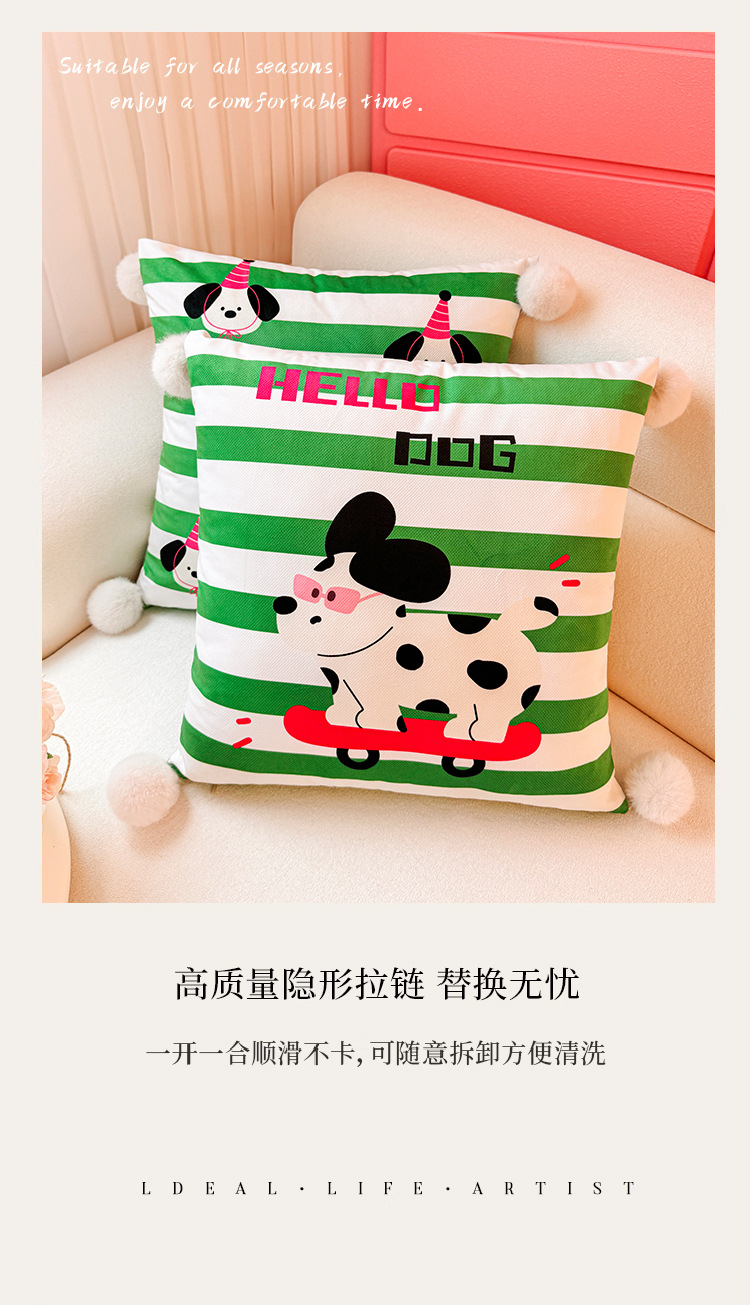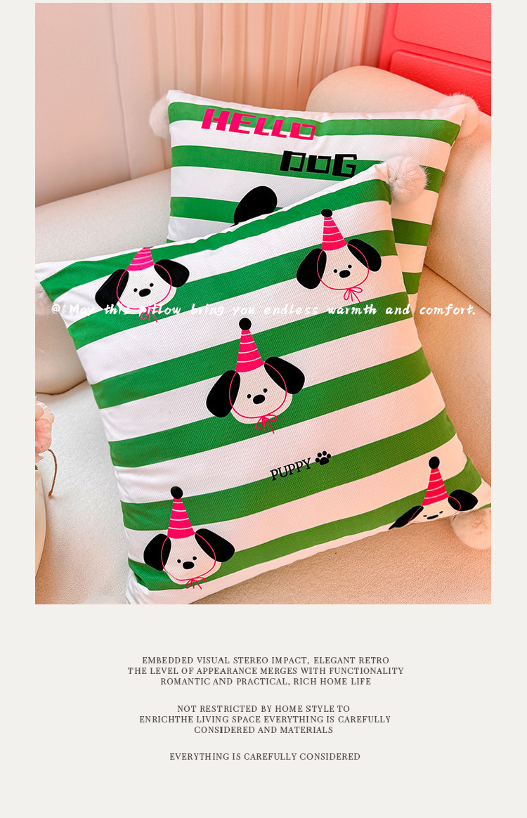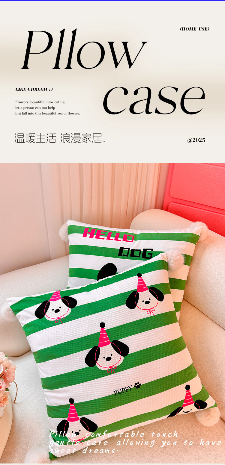 Skateboard Puppy Rayas Almohada verde Funda de almohada Sala de estar Sofá Almohada Impresión de cabecera Almohada de cintura abstracta con bola de pelo