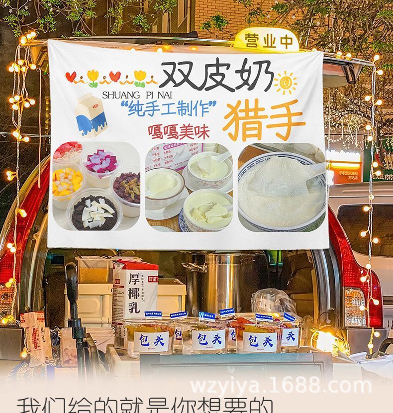 Leche de doble cuero colocando puestos de comida, mercado nocturno colocando puestos de publicidad colocando carteles de calle