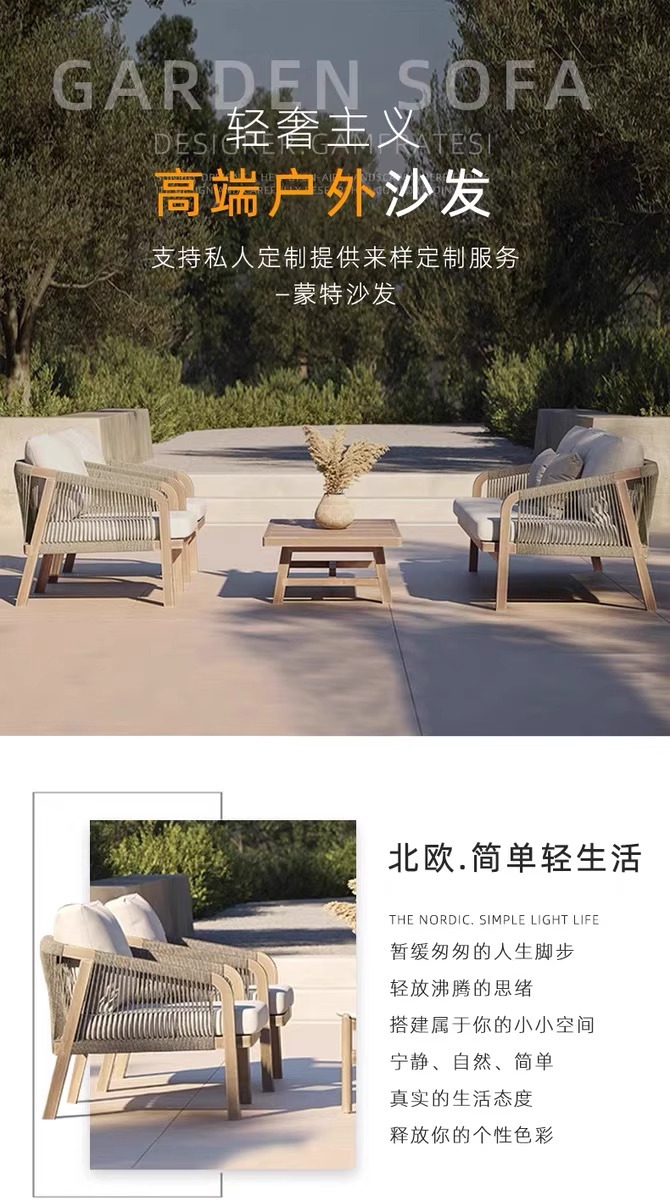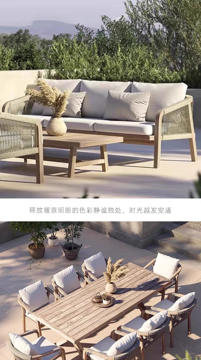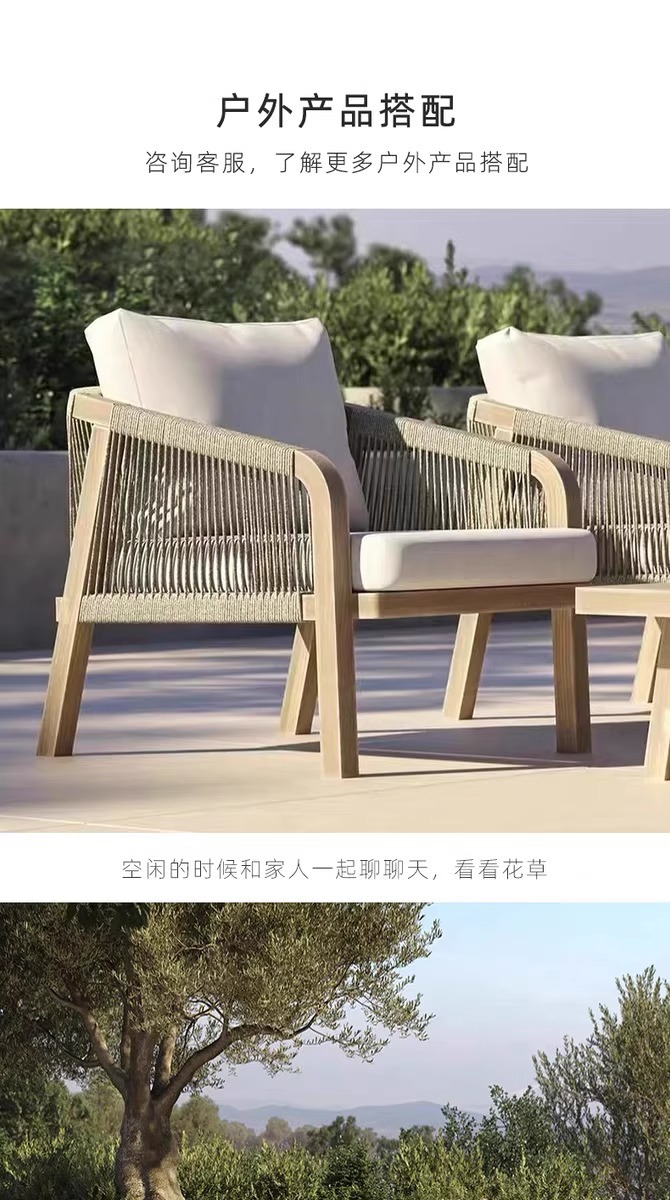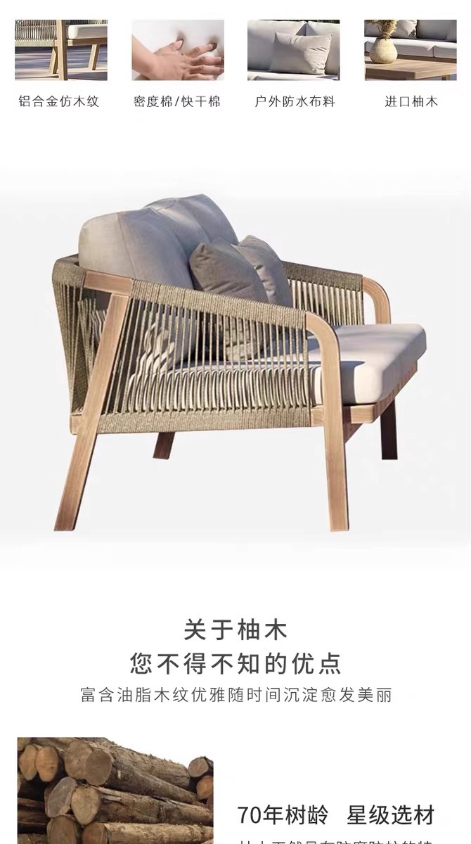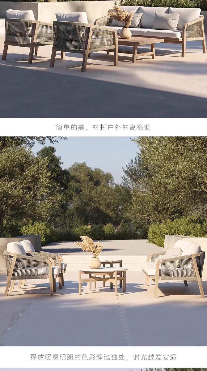 Sofá al aire libre de teca Jardín Jardín de madera anticorrosiva Diseñador Balcón al aire libre Silla de mimbre de ocio Combinación de muebles de hotel