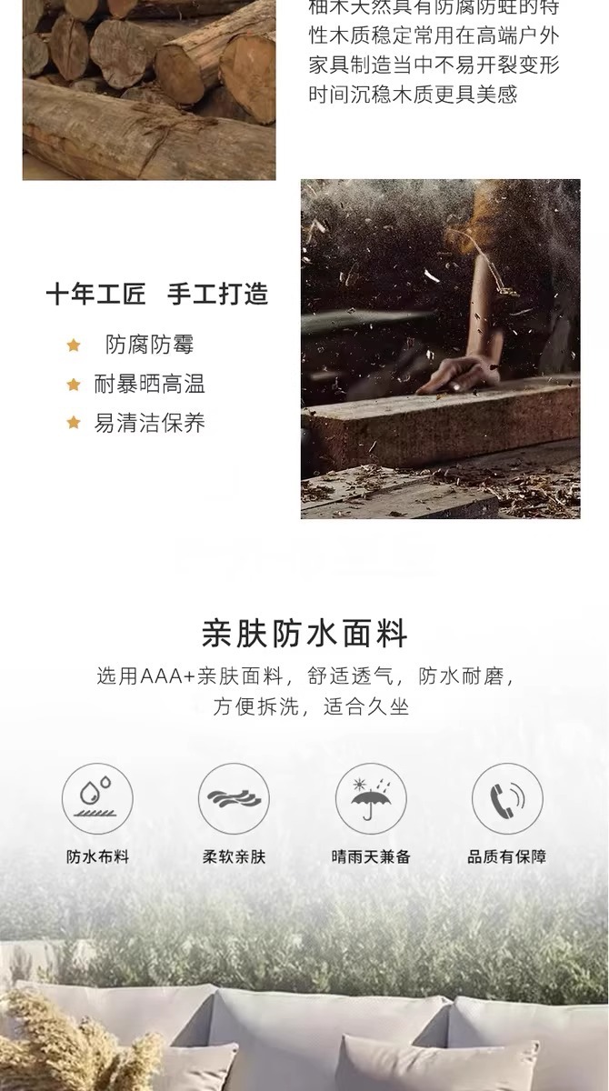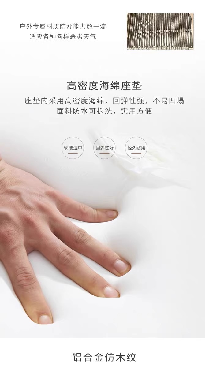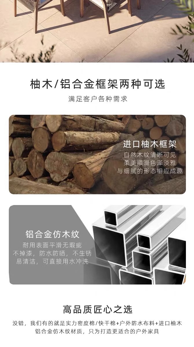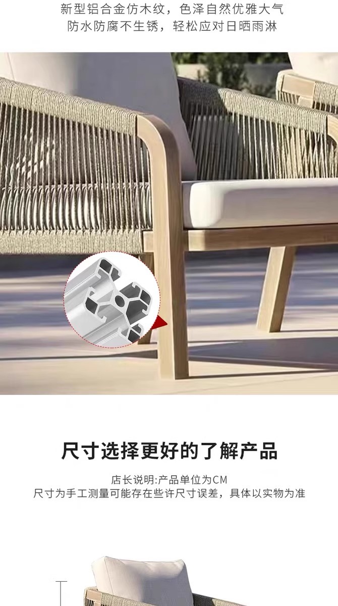 | Colores | Sofá individual (grano de madera de imitación de aluminio),Sofá doble (grano de madera de imitación de aluminio),Sofá para tres personas (grano de madera de imitación de aluminio),Silla de comedor (grano de madera de imitación de aluminio),Mesa de centro redonda de 80CM (grano de madera de imitación de aluminio),Mesa de centro redonda de 45CM (grano de madera de imitación de aluminio),Combinación uno (cuerda tejida de teca importada),Combinación 2 (cuerda tejida de teca importada),Sofá individual (teca importada),Sofá doble (teca importada),Sofá triple (teca importada),Silla de comedor (teca importada),Mesa de centro redonda de 80CM (teca importada),Mesa de centro redonda de 45CM (teca importada),Mesa de centro larga de 120CM (grano de madera de imitación de aluminio),Mesa de centro larga de 120CM (teca importada),Mesa de comedor de 180cm (teca importada),Mesa de comedor de 240CM (teca importada) |