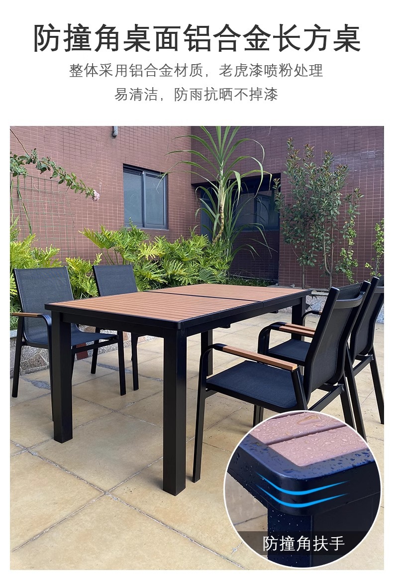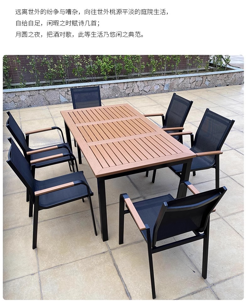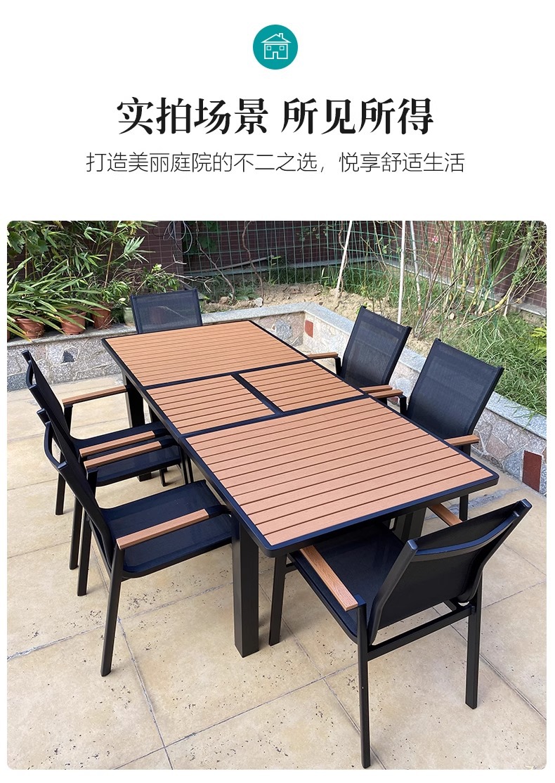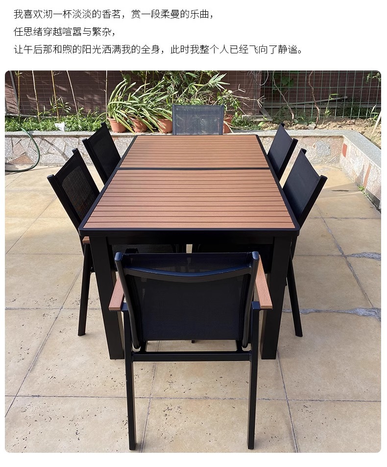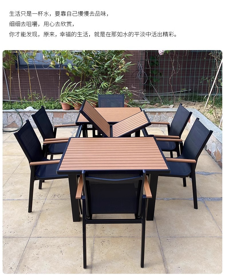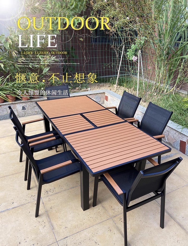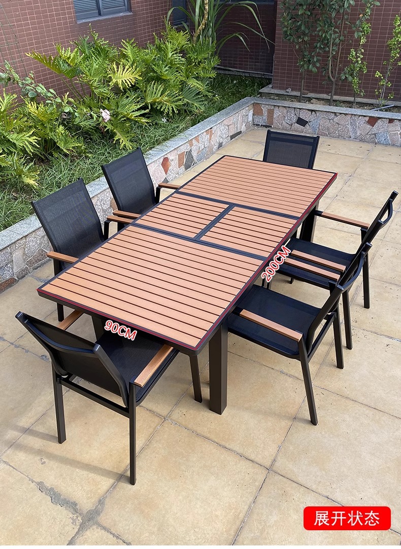 Mesas y sillas de madera de plástico estirado al aire libre, patio, villa, jardín, terraza, hotel, casa de familia, muebles de ocio, lluvia y protección solar