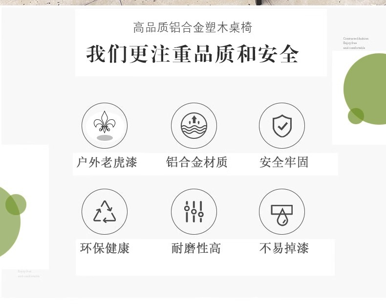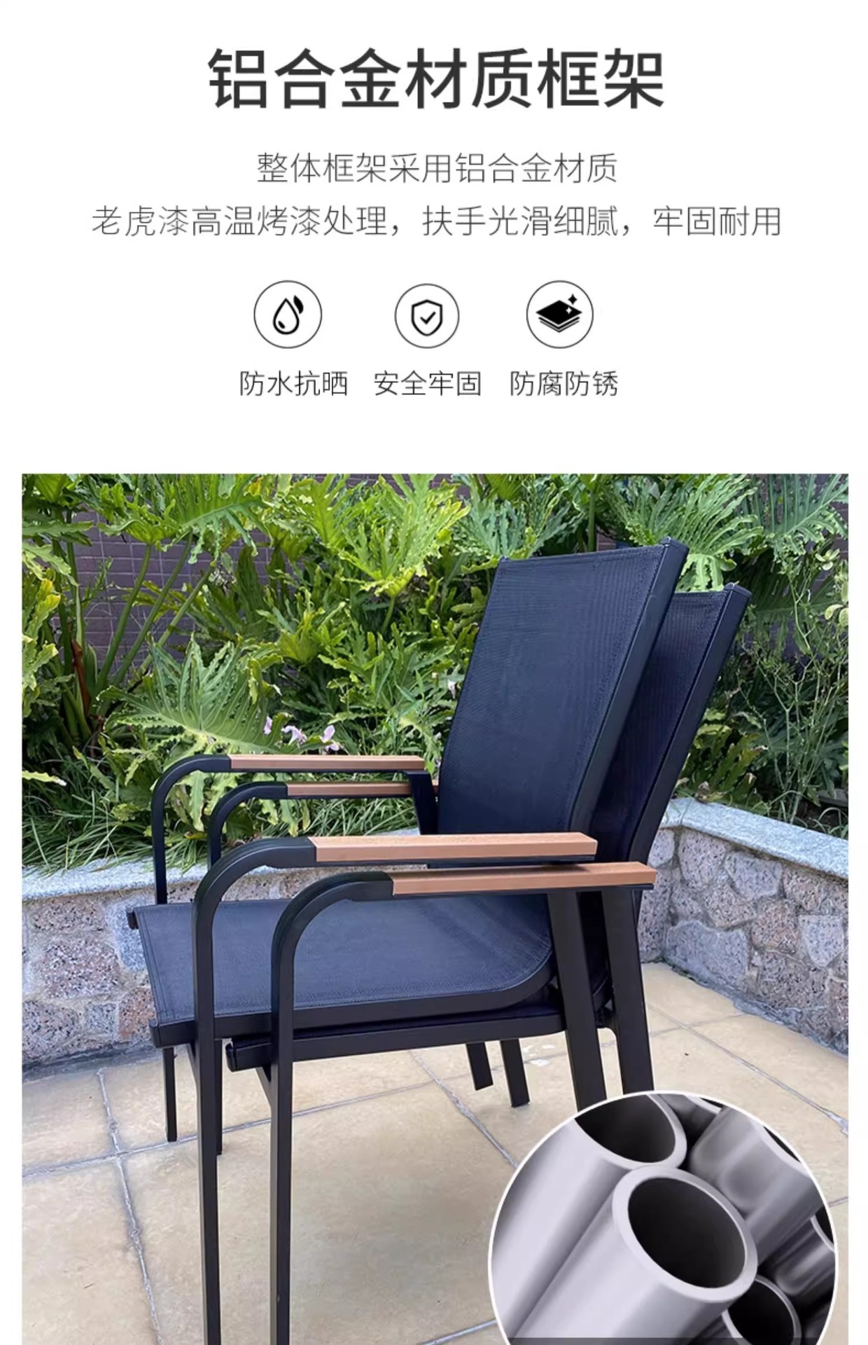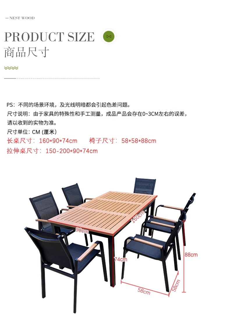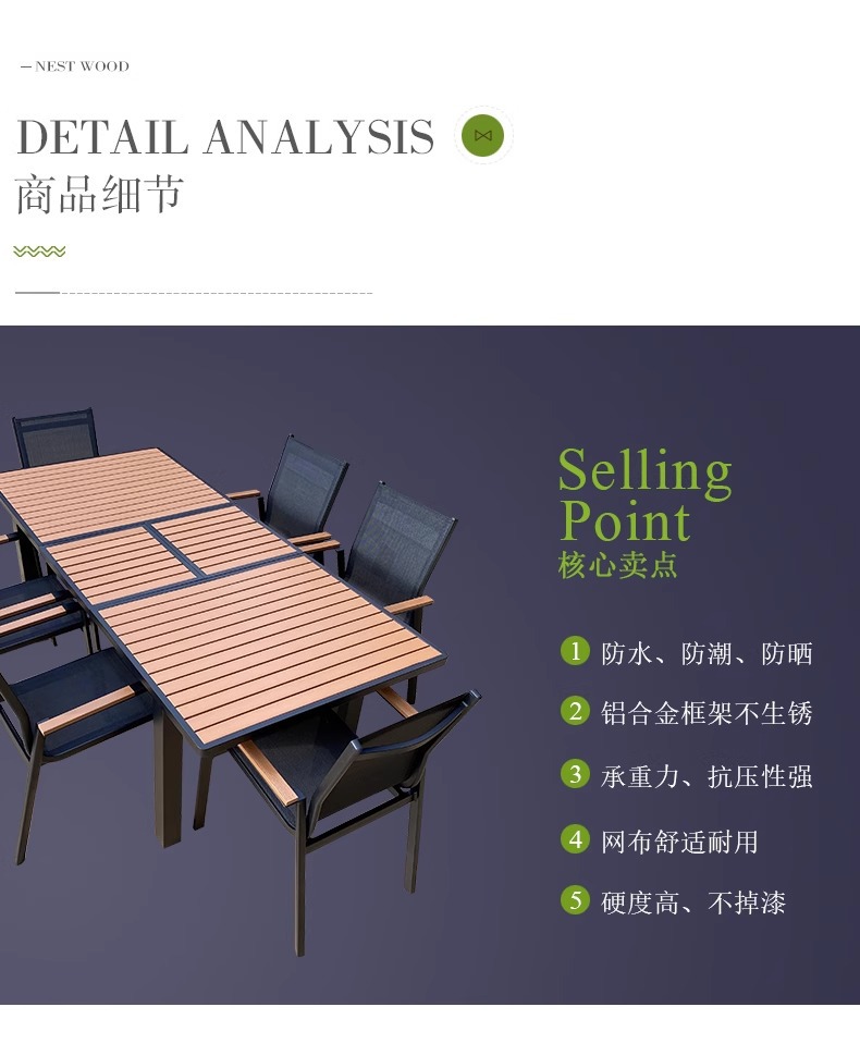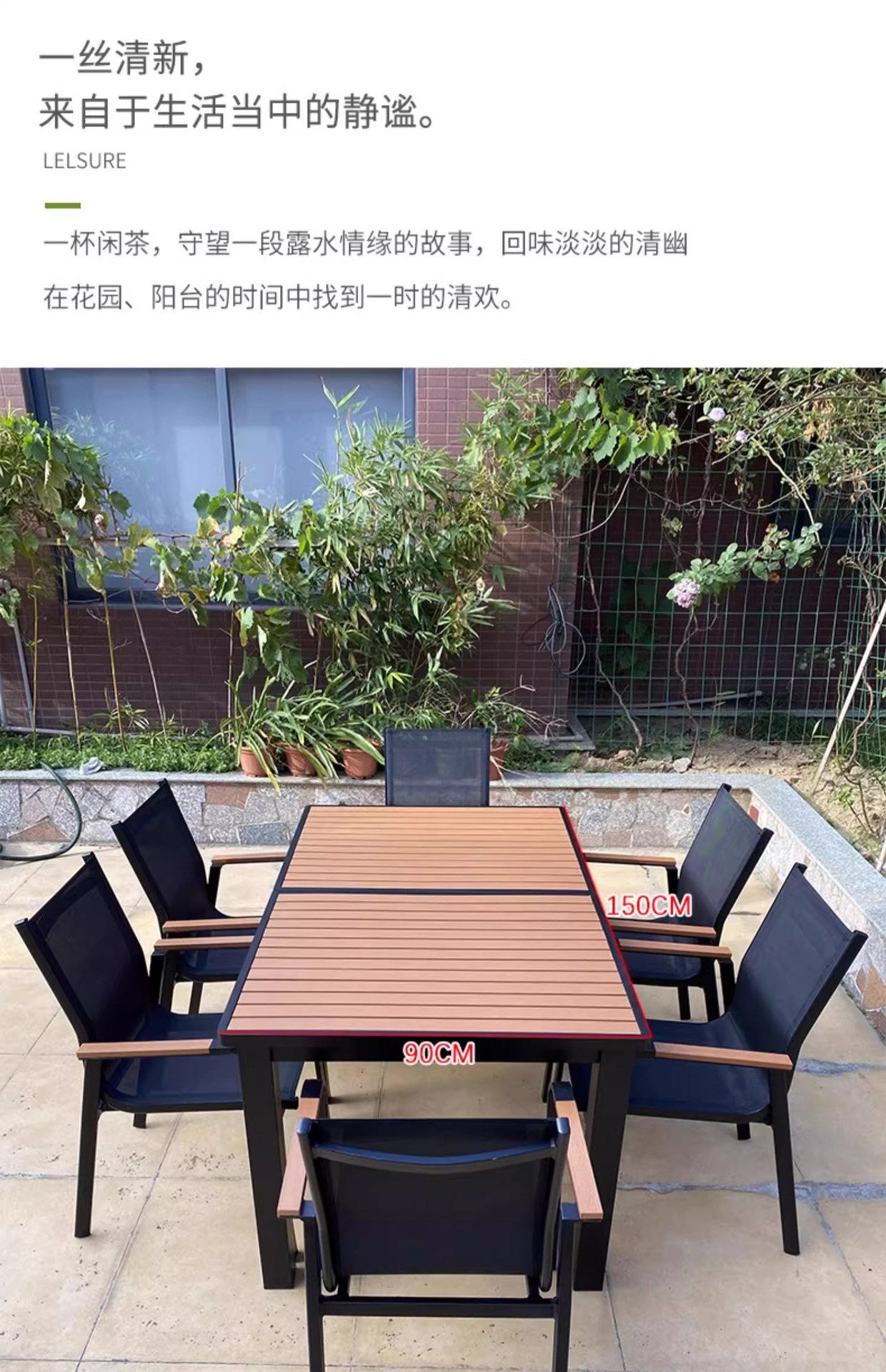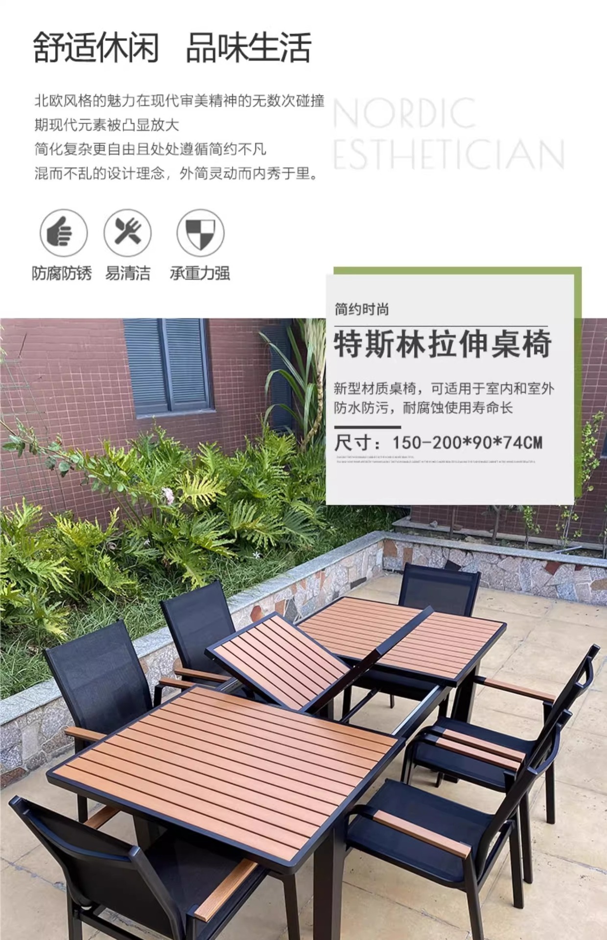 Mesas y sillas de madera de plástico estirado al aire libre, patio, villa, jardín, terraza, hotel, casa de familia, muebles de ocio, lluvia y protección solar