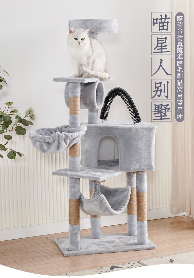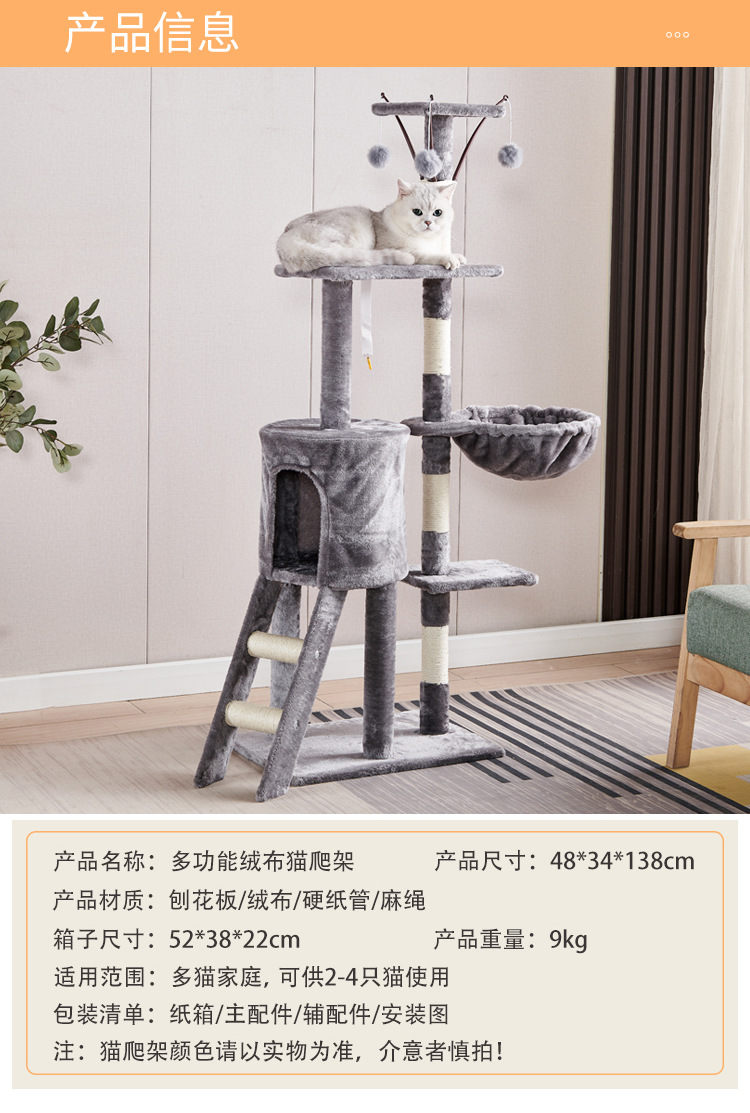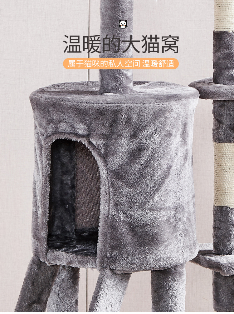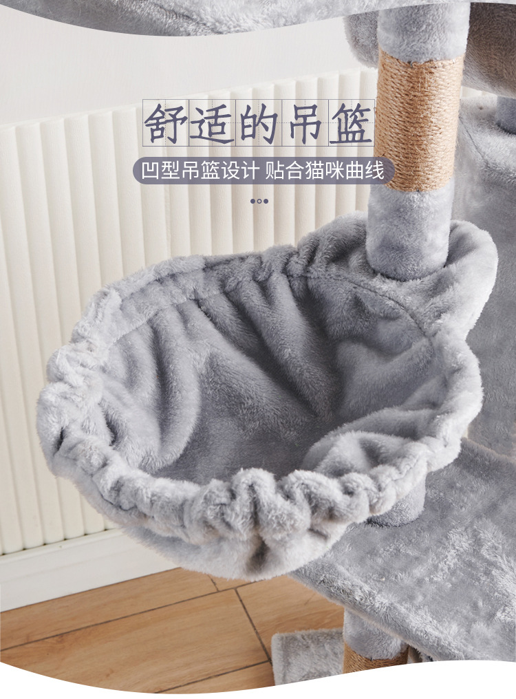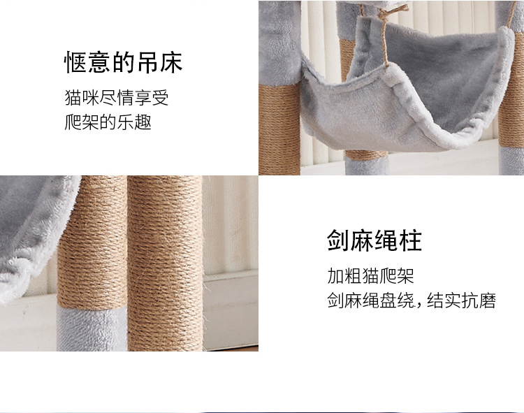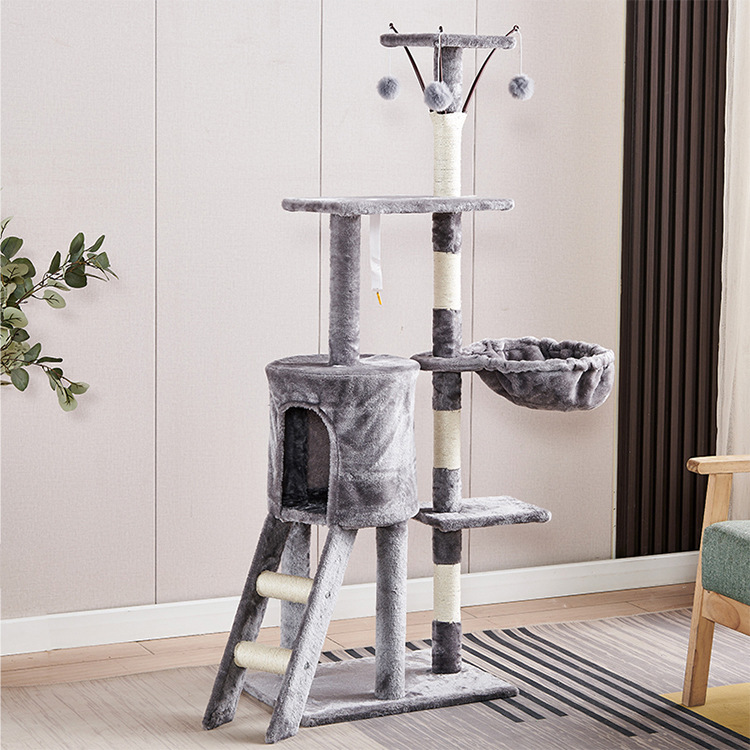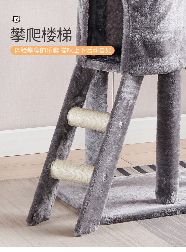 Marco de escalada para gatos de franela personalizado al por mayor, estructura de madera multicapa, raspador de juguetes para gatos con casa para gatos, cuerda de sisal, apartamento de columna de agarre