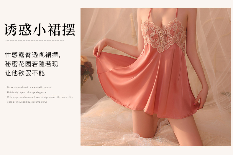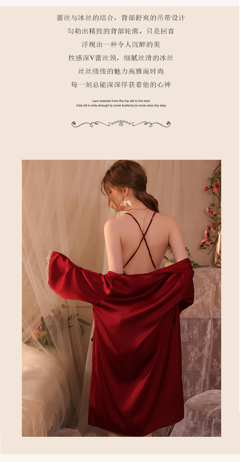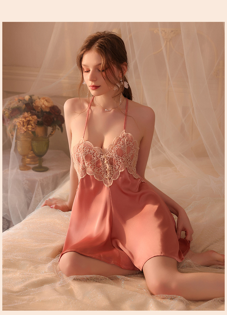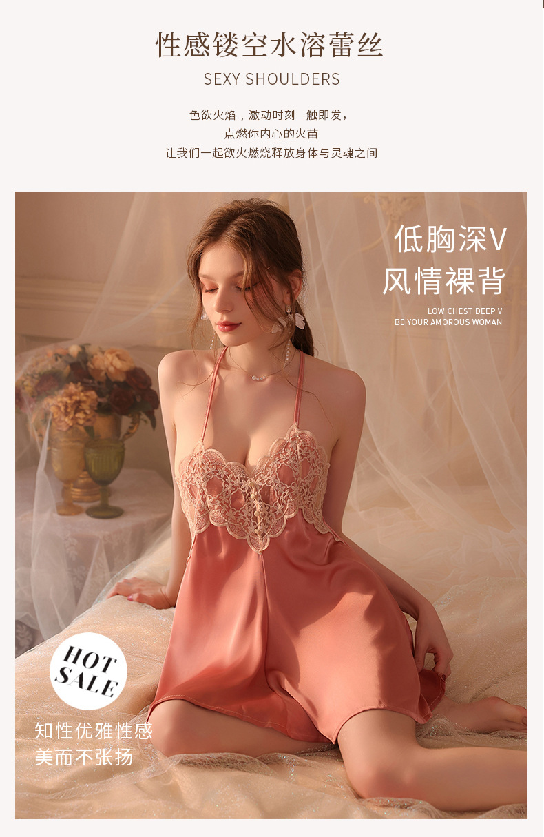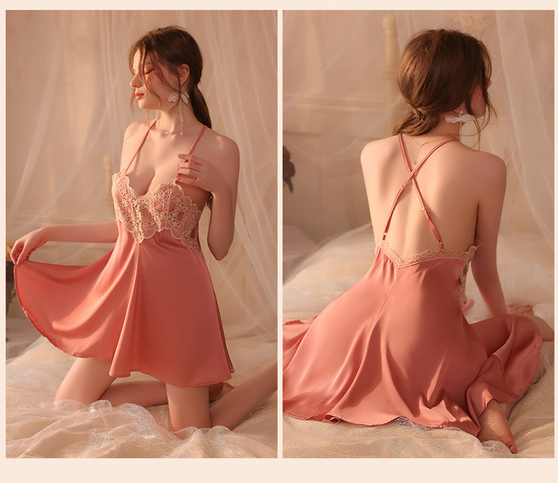 Conjunto de pijama sexy, vestido de tirantes sin espalda de seda helada transparente, ropa de estar por casa, disponible para dropshipping A123, estilo suave y relajado.