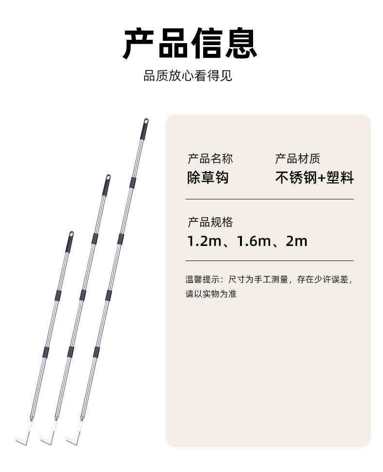 | Especificaciones | Juego completo de gancho de deshierbe de 1,2 m en caja de papel independiente,Juego completo de gancho de deshierbe de 1,6 m en caja de papel independiente,Juego completo de gancho de deshierbe de 2.0m en caja de papel independiente,Cabeza de gancho de deshierbe,Cortador de paja,Tubería de gancho de deshierbe |