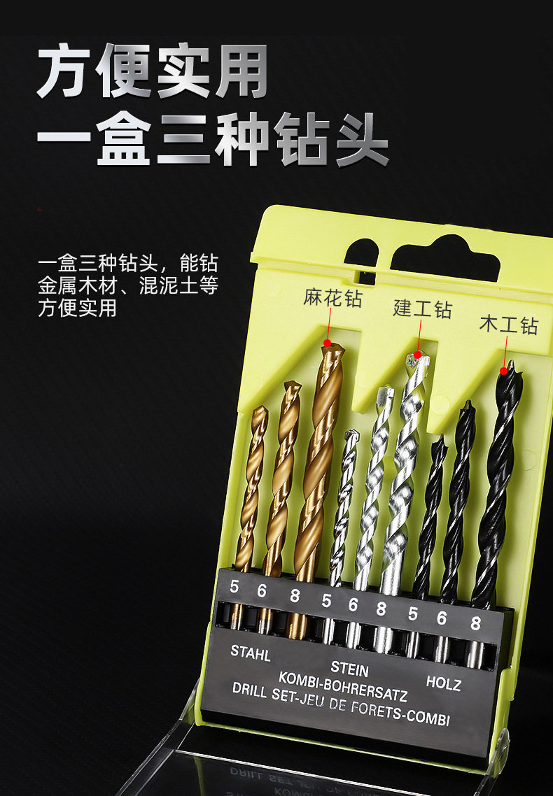 | Especificaciones y modelos | Juego de 8 piezas [Taladro de construcción],Juego de 8 piezas [taladro para carpintería],Juego de 9 piezas [Taladro para metal + taladro para carpintería + taladro para construcción],Juego de 13 piezas [Metal White Diamond],Juego de 13 piezas [metal chapado en titanio],Conjunto de 13 piezas,Juego de 16 piezas [Taladro para metal + Taladro para construcción + Taladro para carpintería],Juego de 19 piezas [Metal White Diamond],Juego de 19 piezas [chapado en titanio metálico],Conjunto de 19 piezas,Juego de 25 piezas |