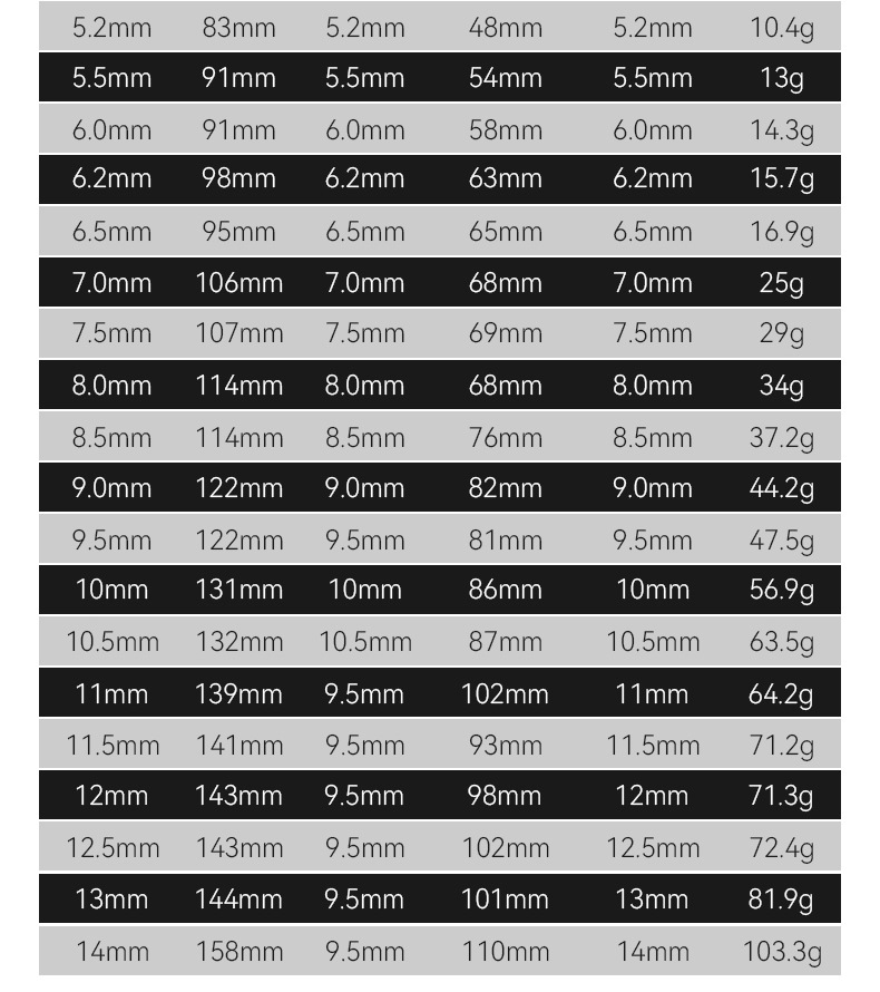 | Especificaciones y modelos | 1.0mm [10 PC], 1.5mm [10 PC], 2.0mm [10 PC], 2.5mm [10 PC], 2.8mm [10 PC], 3.0mm [10 PC], 3.2mm [10 PC], 3.5mm [10 PC], 4.0mm [10 PC], 4.2mm [10 PC], 4.5mm [10 PC], 5.0mm [10 PC], 5.2mm [10 PC], 5.5mm [10 PC, 6.0mm [1 paquete], 6.2mm [1 paquete], 6.5mm [1 paquete], 7.0mm [1 paquete], 7.5mm [1 paquete], 8.0mm [1 paquete], 8.5mm [1 paquete], 9.0mm [1 paquete], 9.5mm [1 paquete], 10mm [1 paquete], 10.5mm [1 paquete], 11mm [1 paquete], 11,5mm [1 paquete], 12mm [1 paquete], 12,5mm [1 paquete], 13mm [1 paquete], 14 mm [1 paquete] |